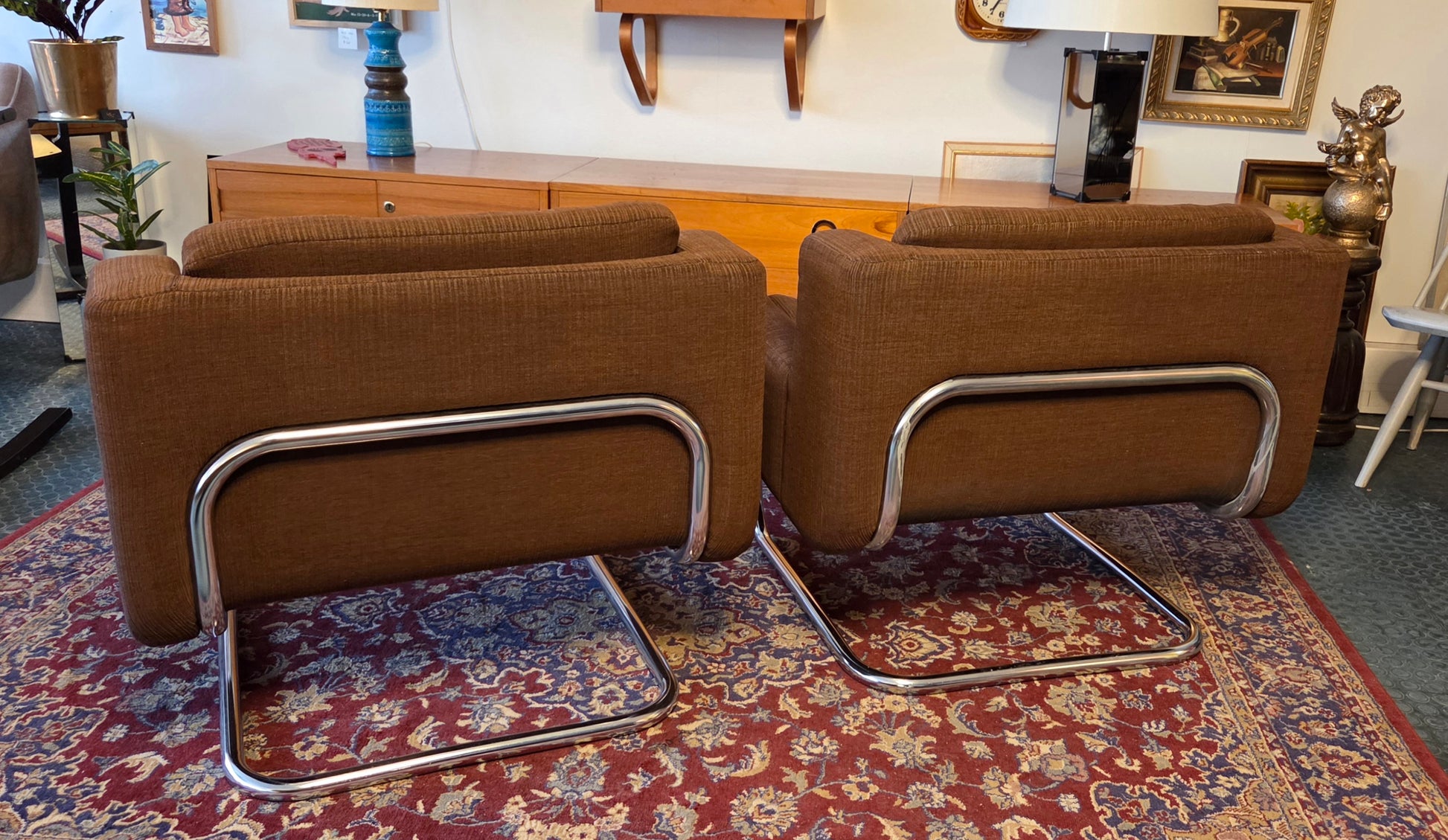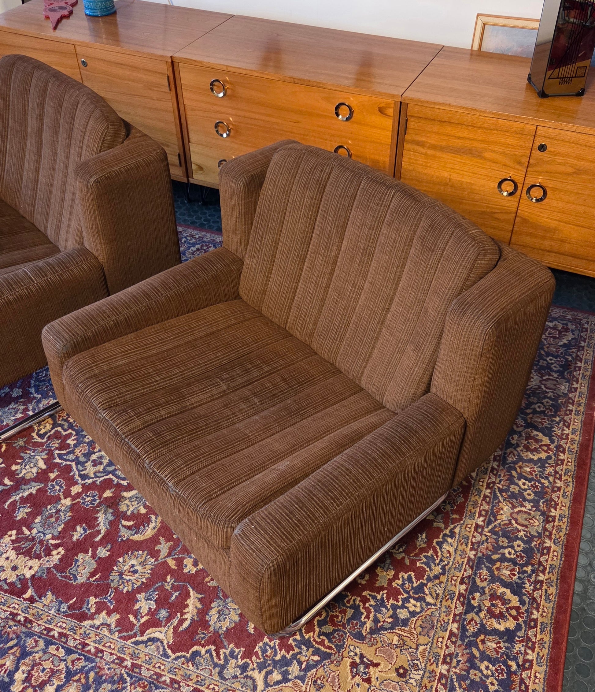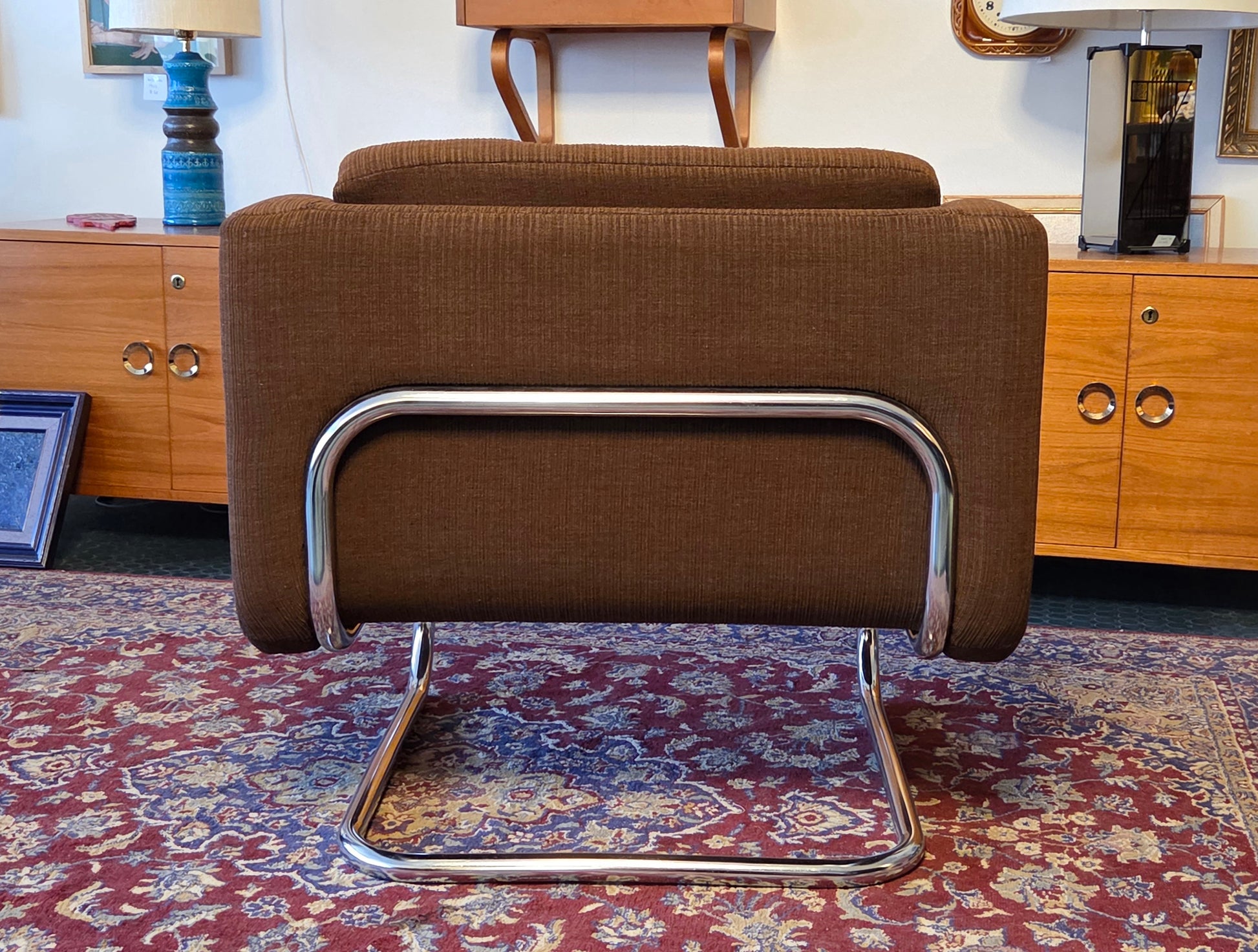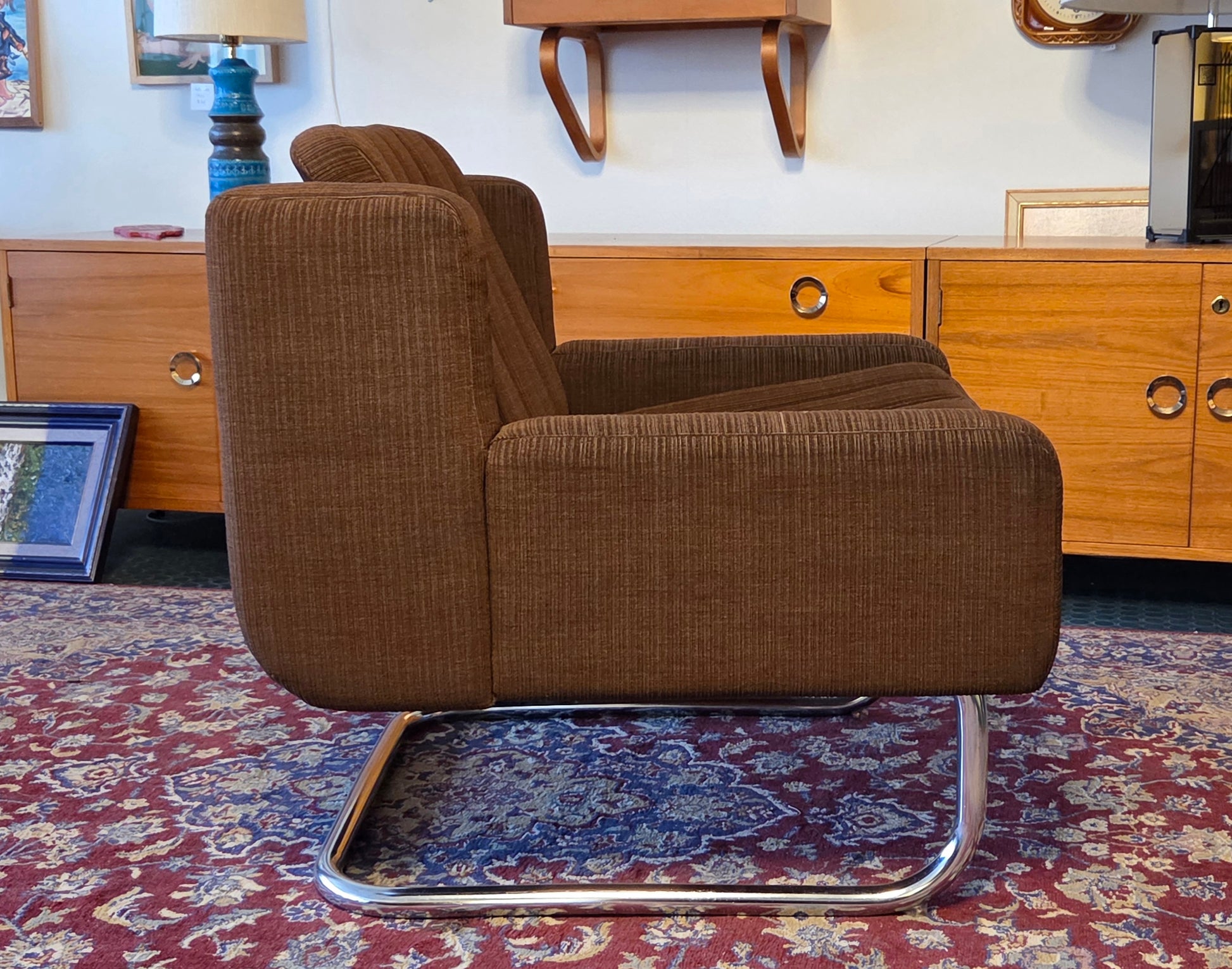 Ruskea kangasverhoilu ja tyylikäs kromattu jalusta.