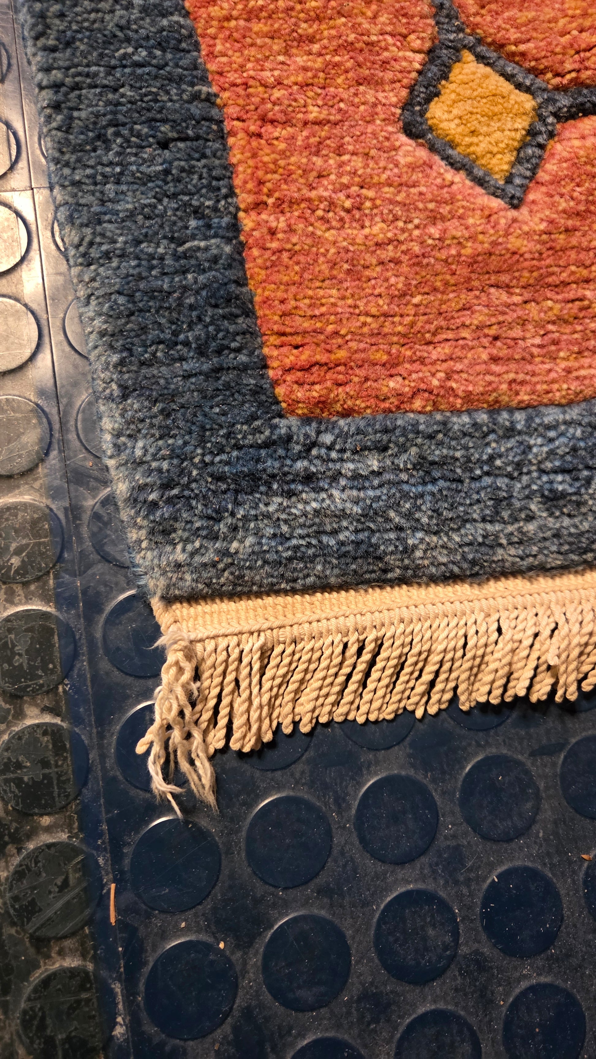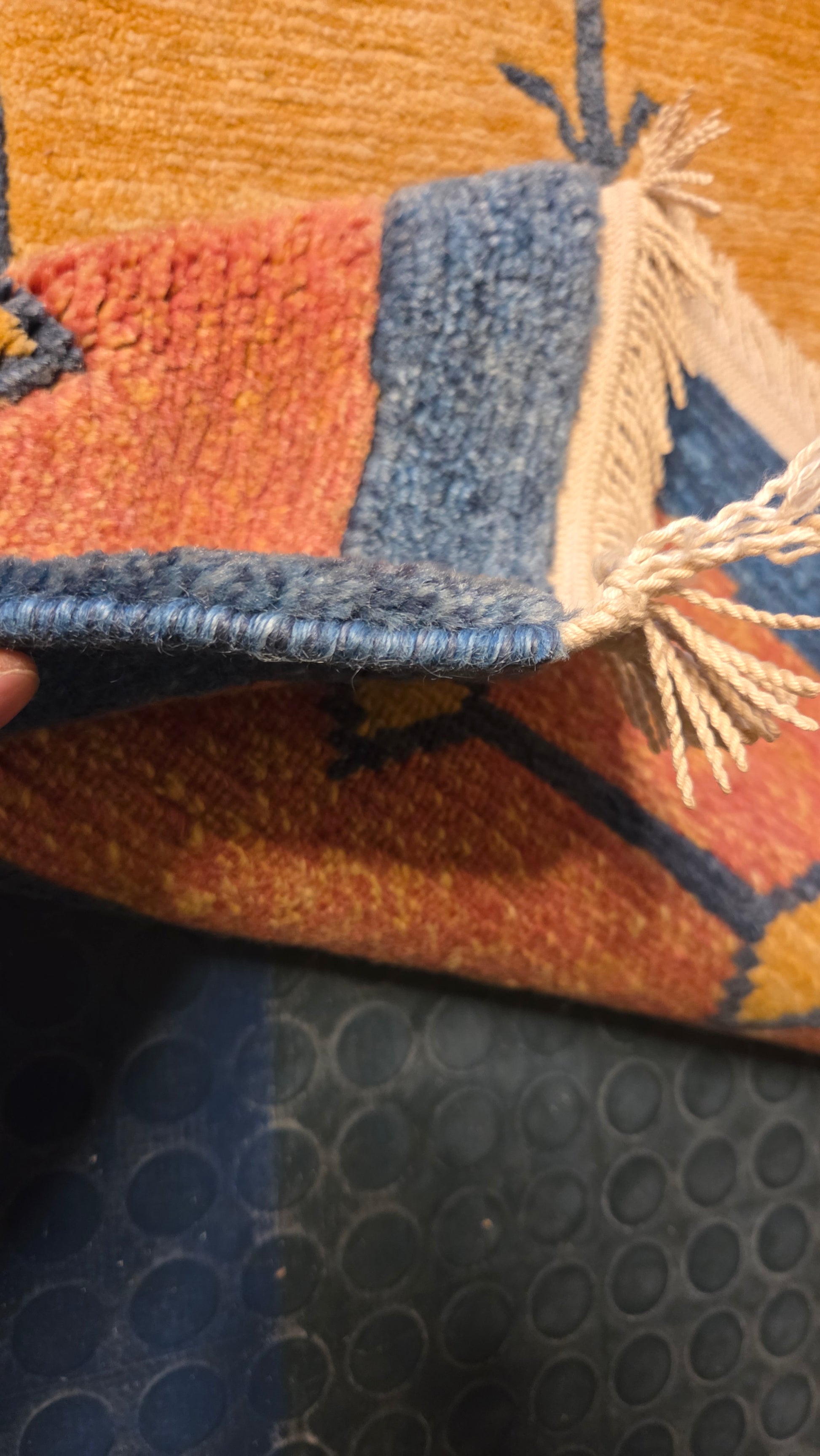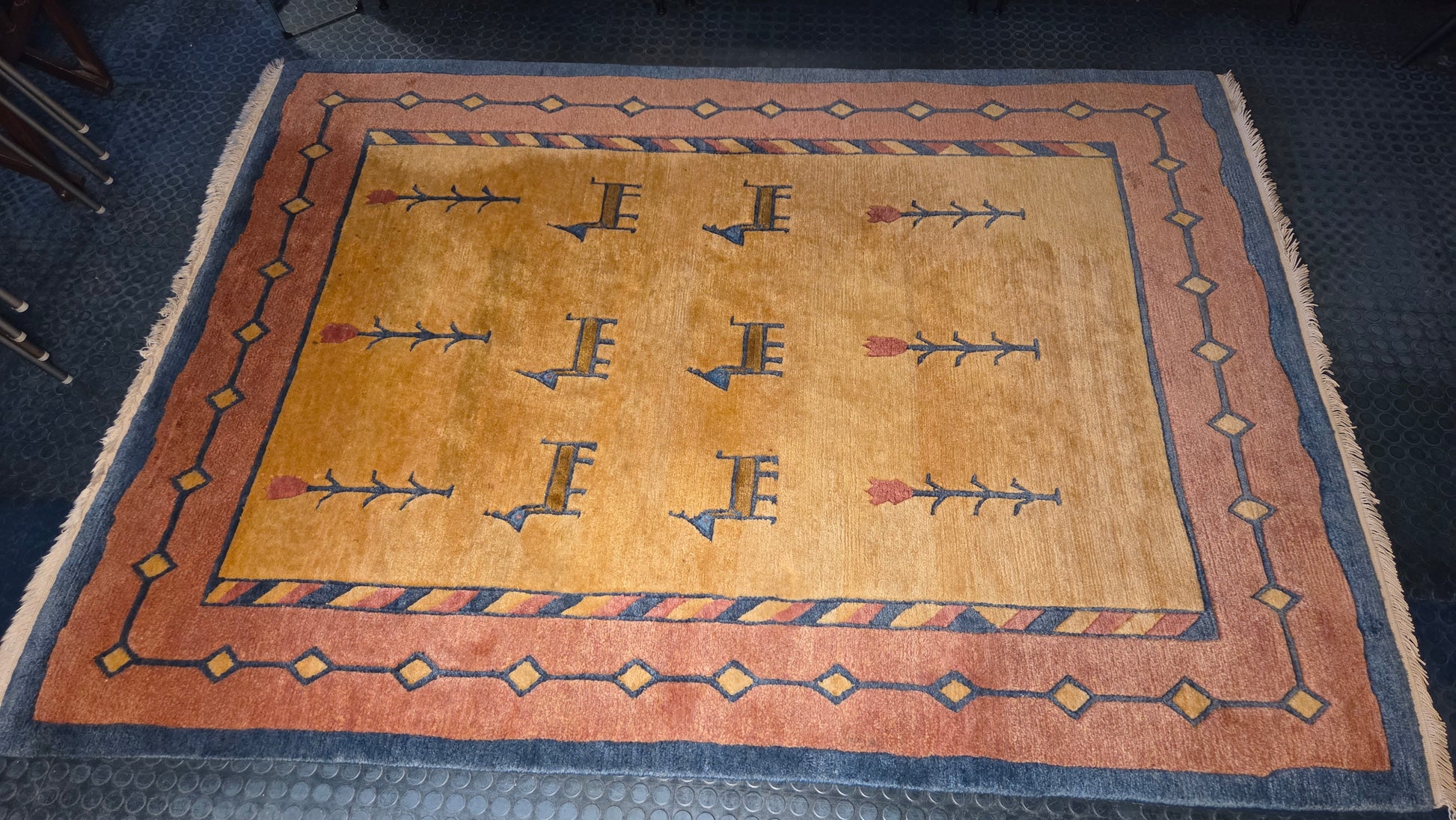 Värit: Lämmin keltainen/oranssi kenttä, terrakotanpunainen ja sininen reunus geometrisilla koristeilla.
