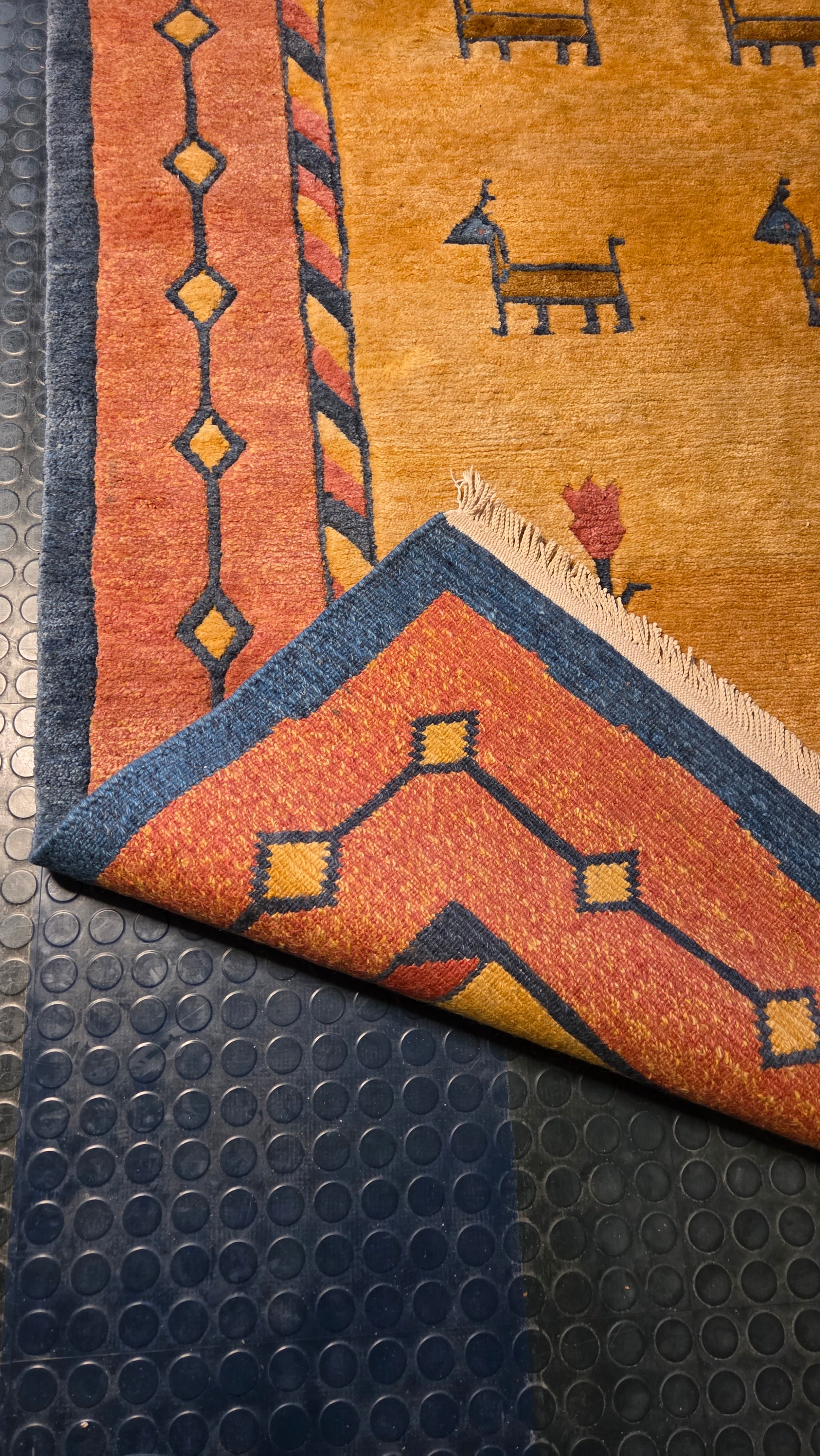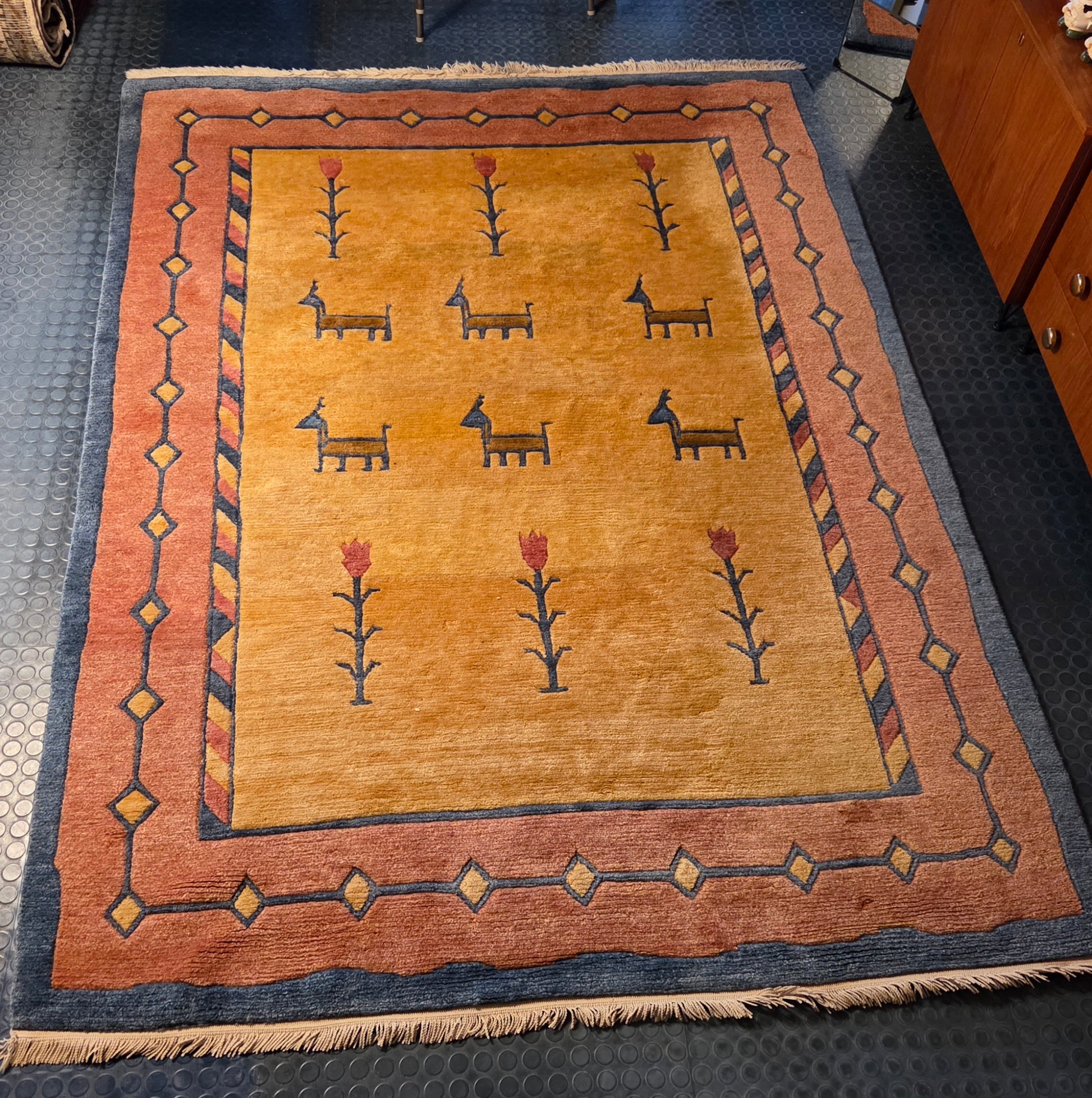 Design: Tyypillinen Gabbeh-tyyli – avoin kenttä, jossa stylisoituja eläinhahmoja (useita tummia koiran/karhun tai leijonan kaltaisia motiifeja) ja kukkia (tulppaanimaisia punaisia kukkia). Motifit on sijoiteltu vapaasti, mikä tuo mattoon leikkisää ja tarinallista tunnelmaa. Eläimet symboloivat usein voimaa, suojelusta tai nomadien arkea, ja kukat tuovat raikkautta.