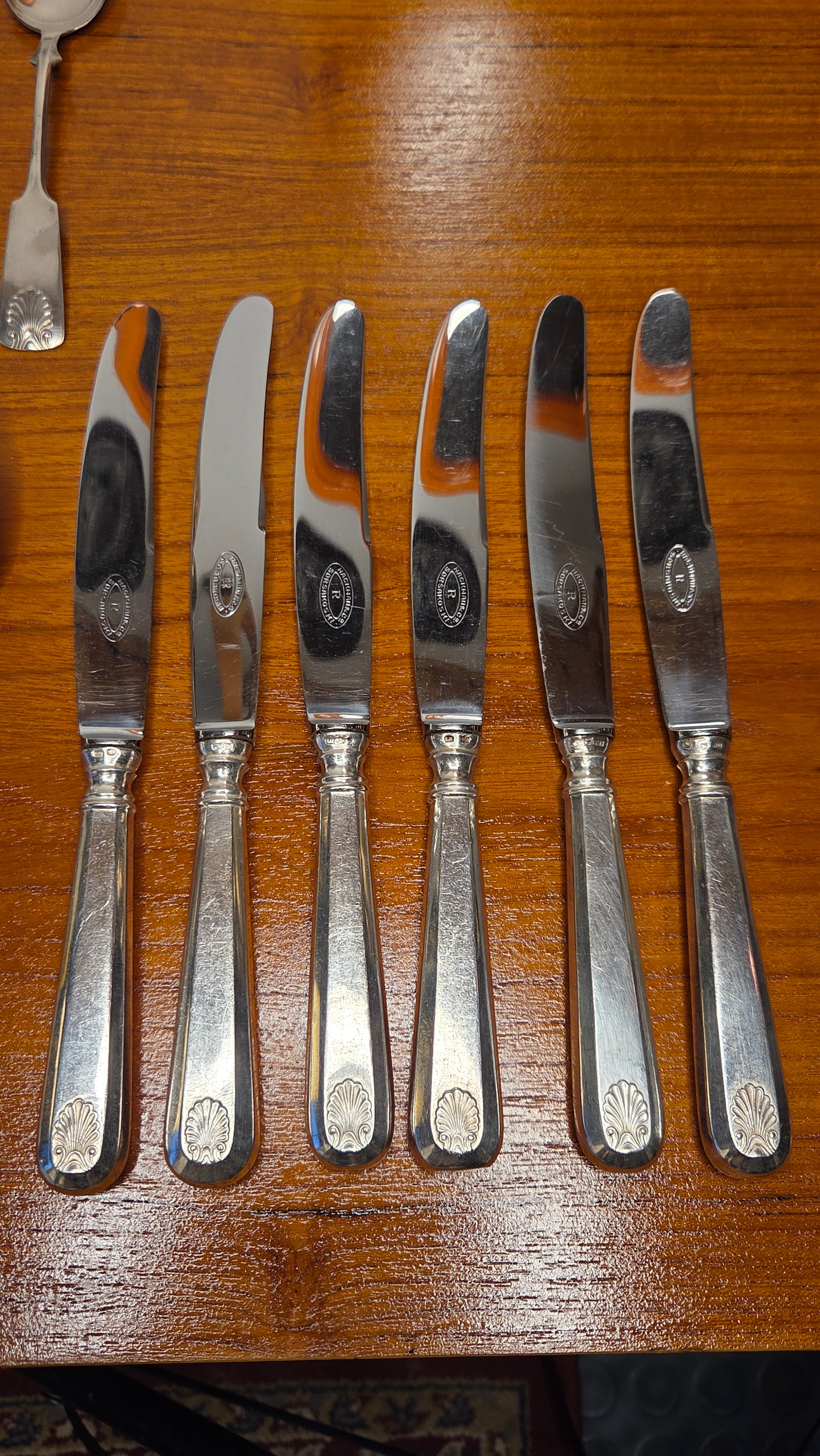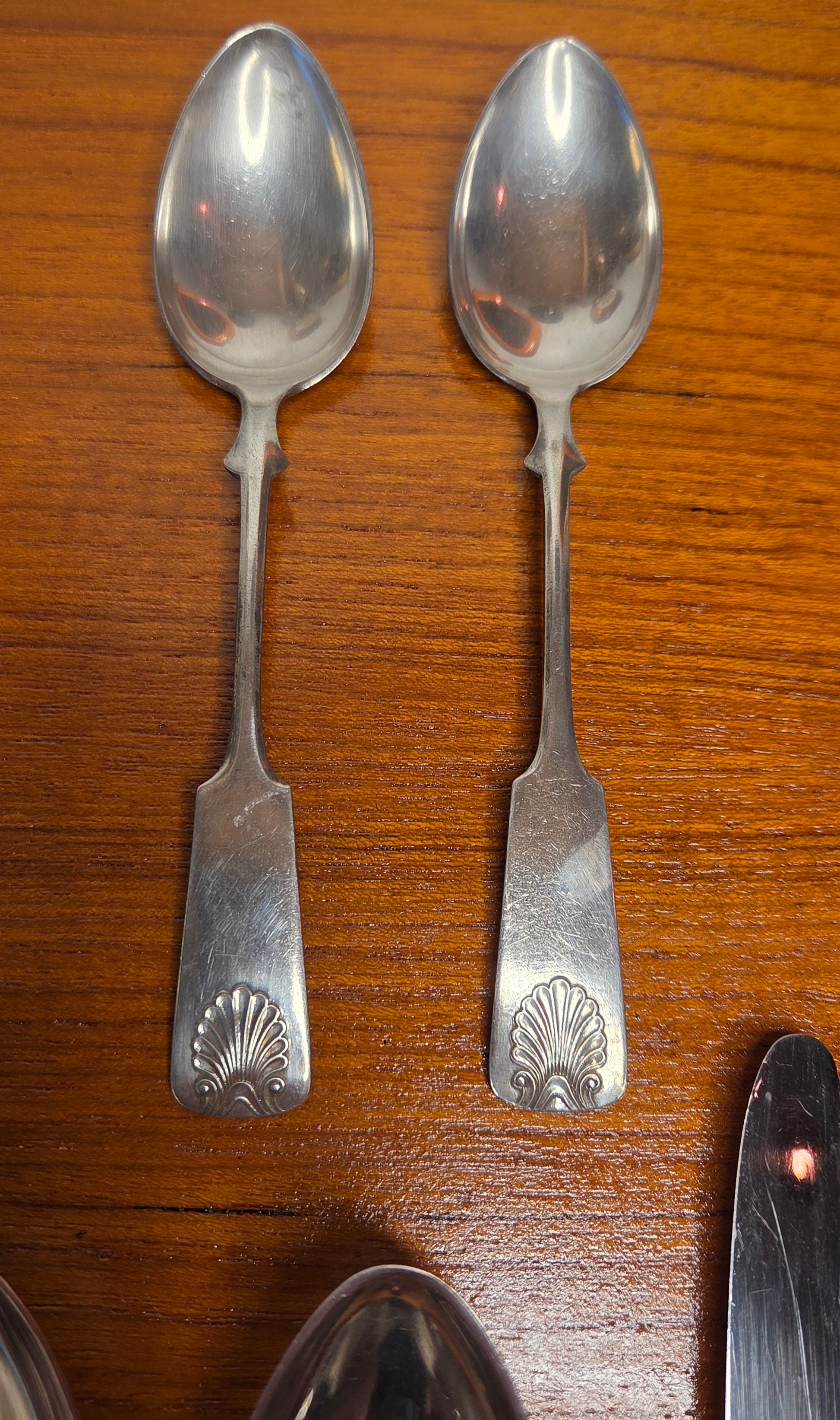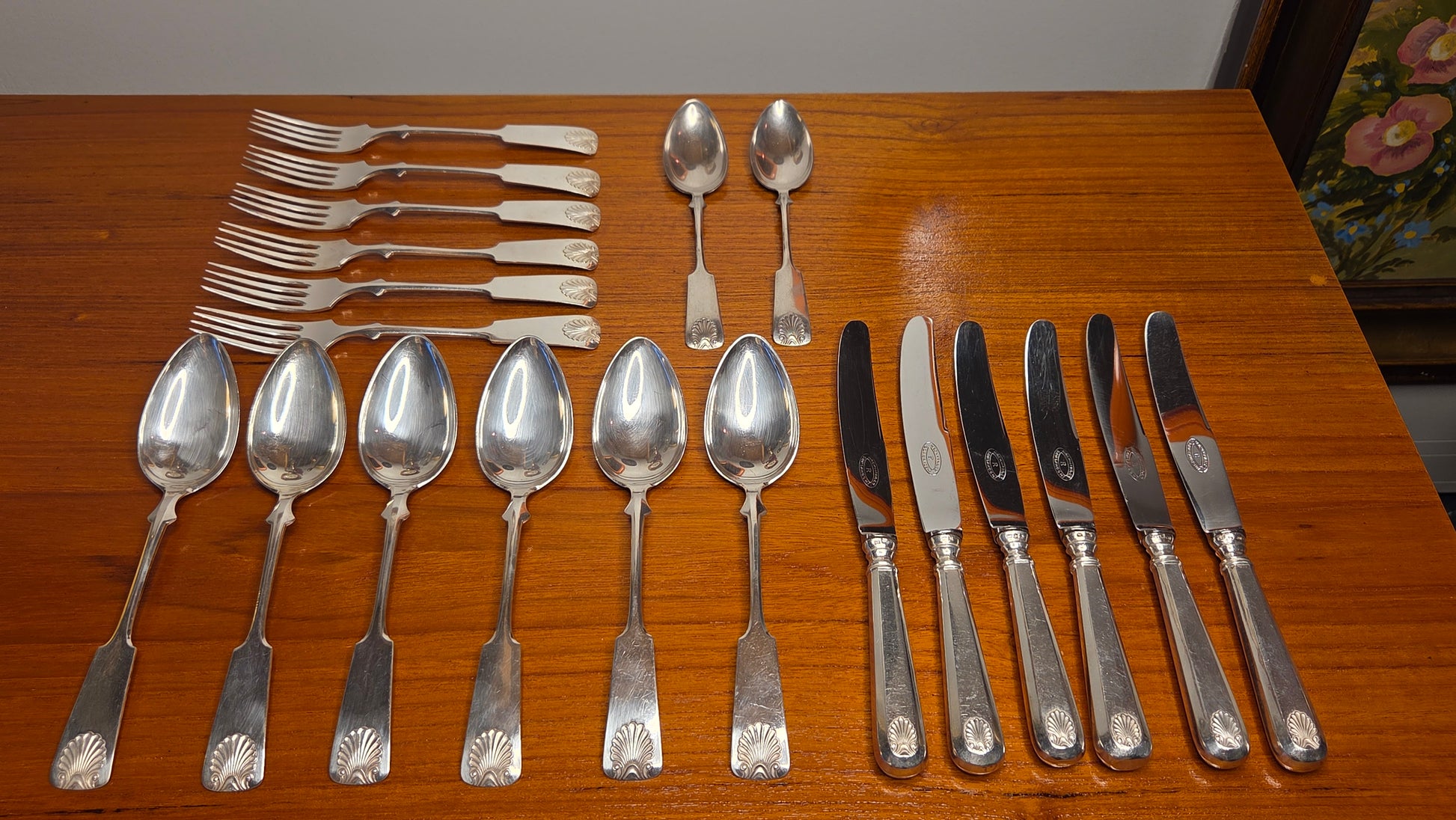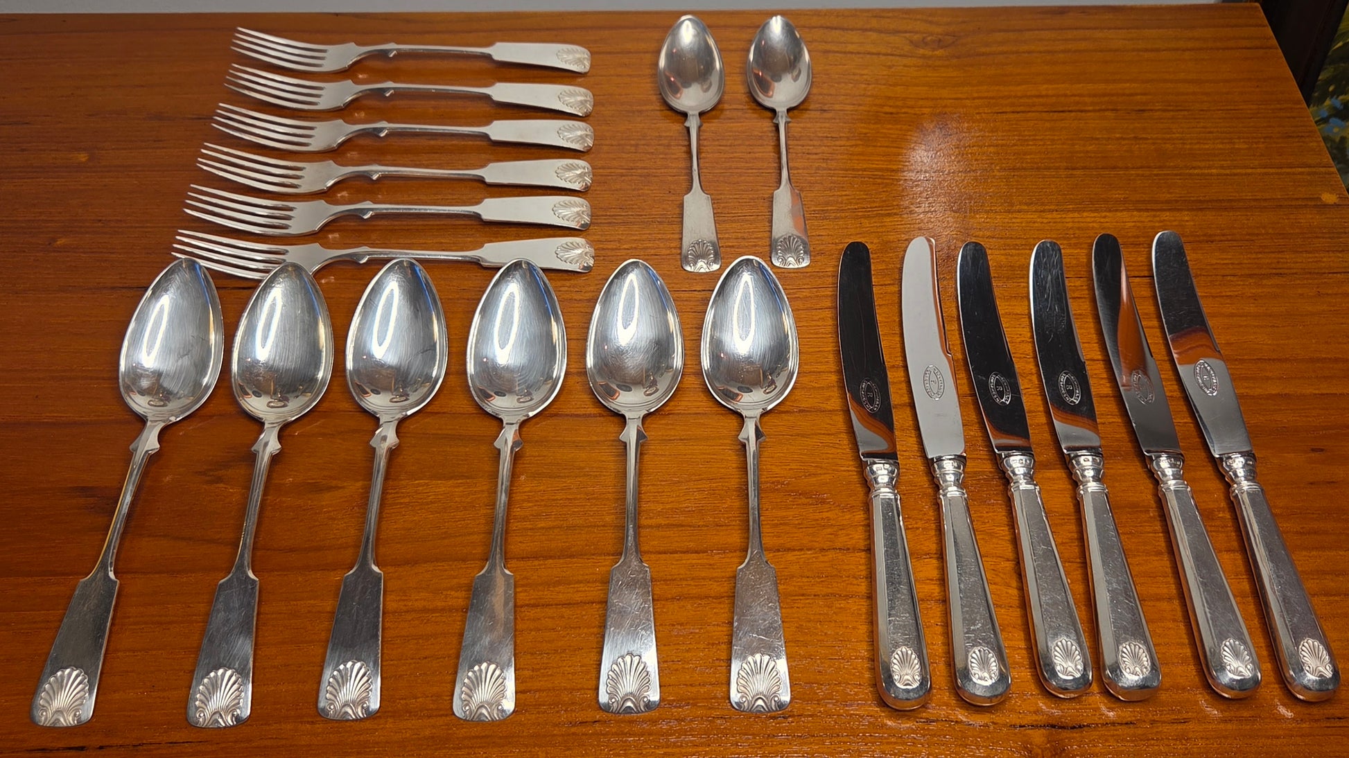 Kaikissa aterimissa kaunis simpukka-aiheinen koriste varren päässä.