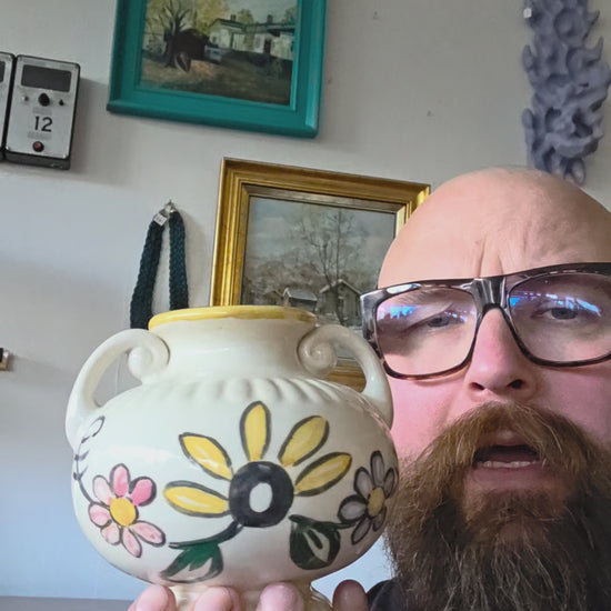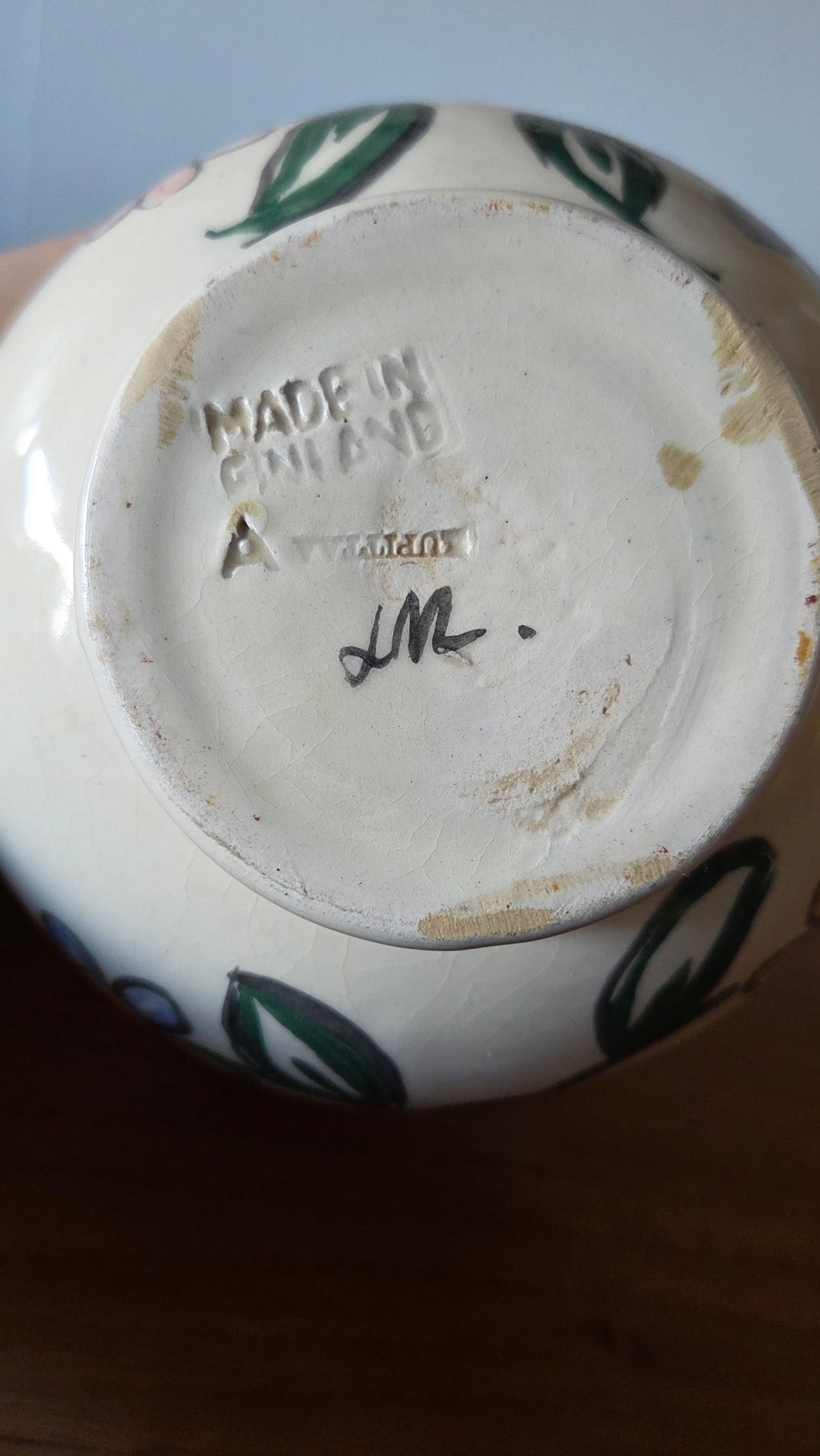 A beautiful two-handled Kupittaan Clay vase from the mid-20th century. The vase has a colorful hand-painted floral decoration and is stamped Made in Finland, Kupittaan Clay and signed LM on the bottom.