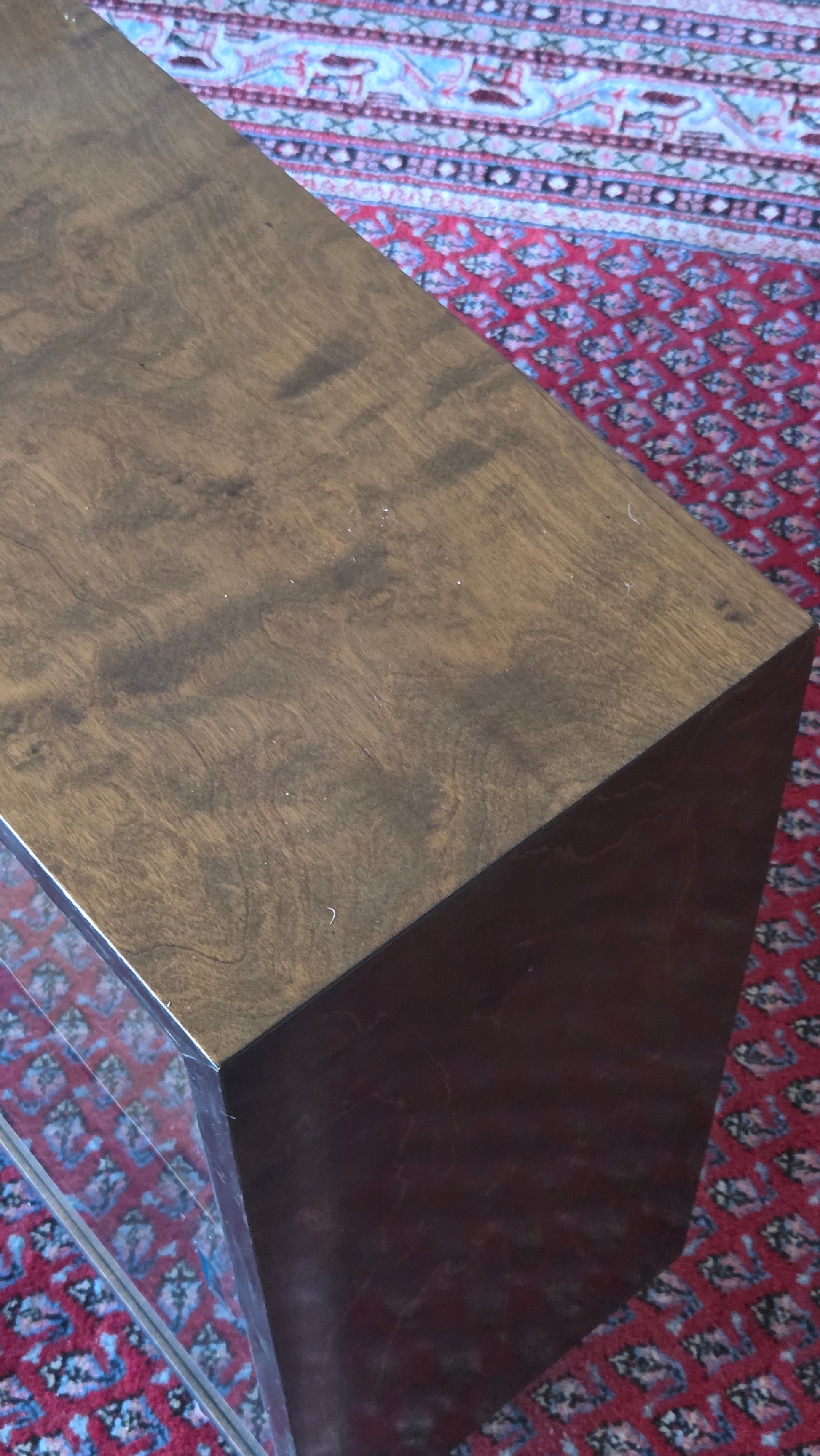 An elegant old display cabinet with a shelf and sliding doors. The beautiful wood veneer and glass doors create a timeless look - perfect for books, dishes or interior items, for example.