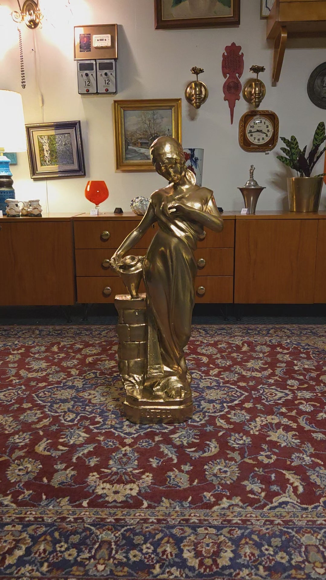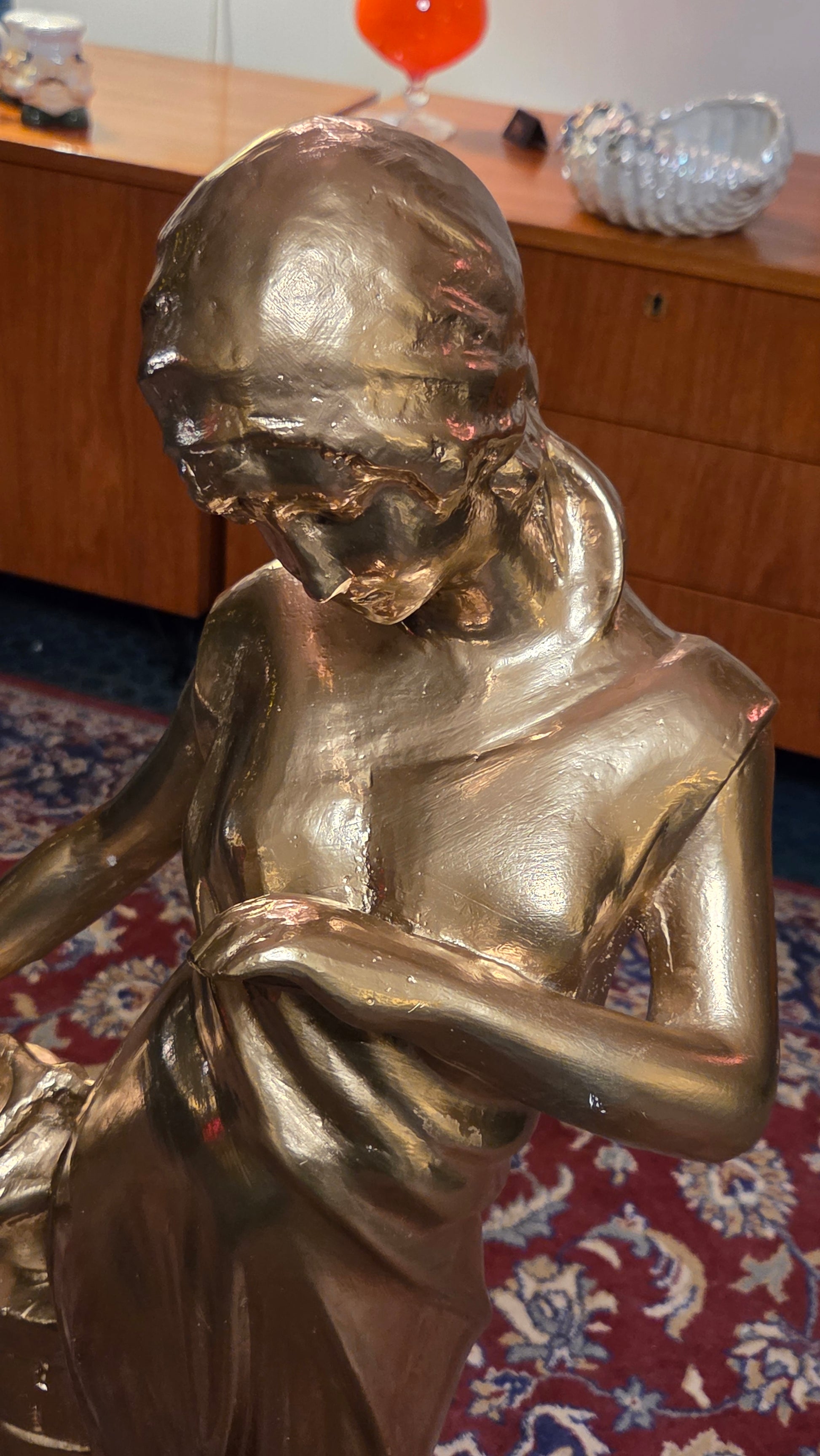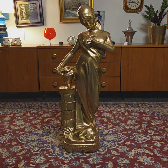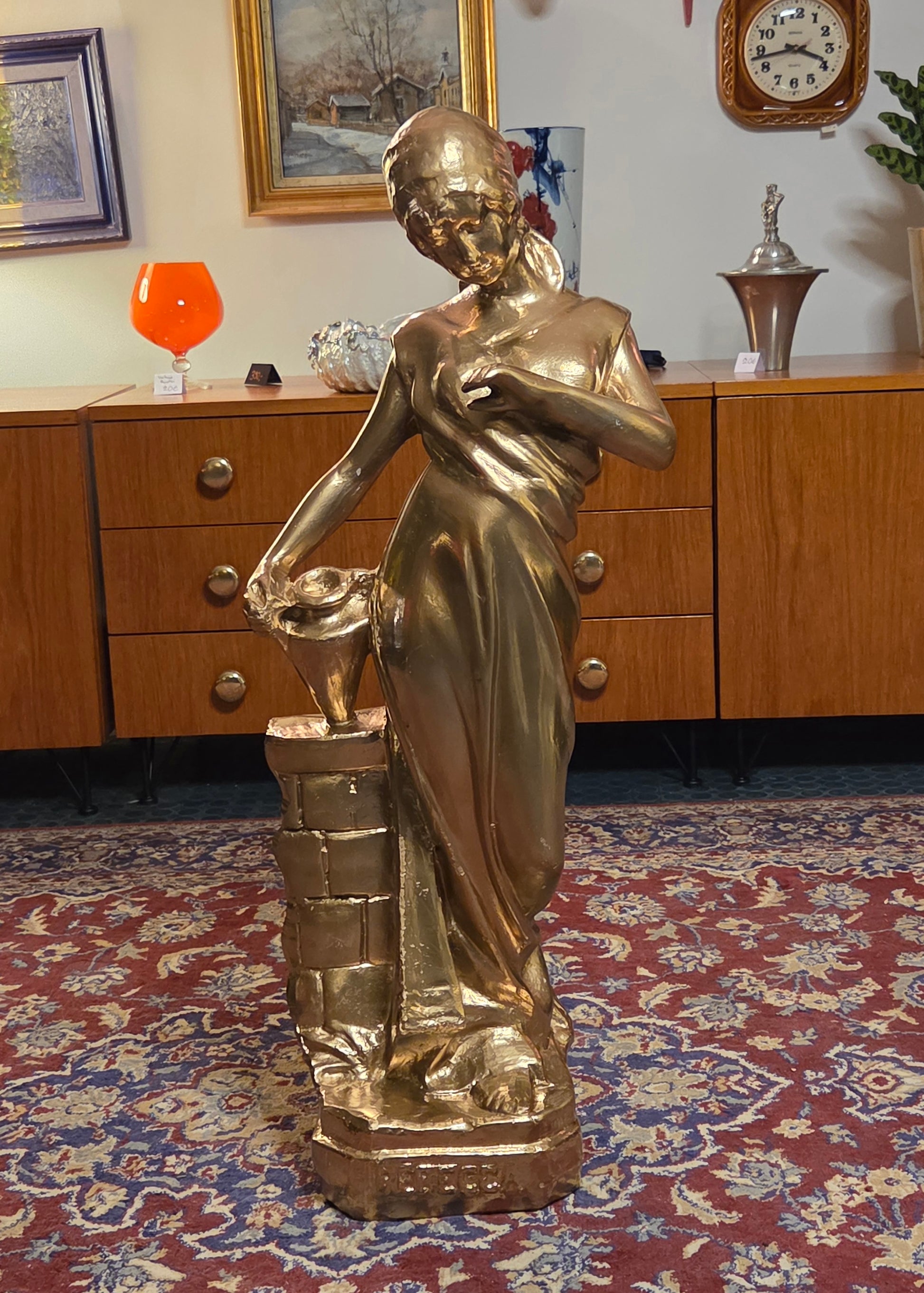 Näyttävä klassistyylinen naishahmopatsas Rebecca. Patsas on valmistettu kipsistä ja viimeistelty kullanvärisellä pinnalla, joka tuo veistokseen arvokkaan ja ajattoman ilmeen. Sopii erinomaisesti vintage- ja klassiseen sisustukseen, liikkeen somisteeksi tai katseenvangitsijaksi eteiseen tai olohuoneeseen.