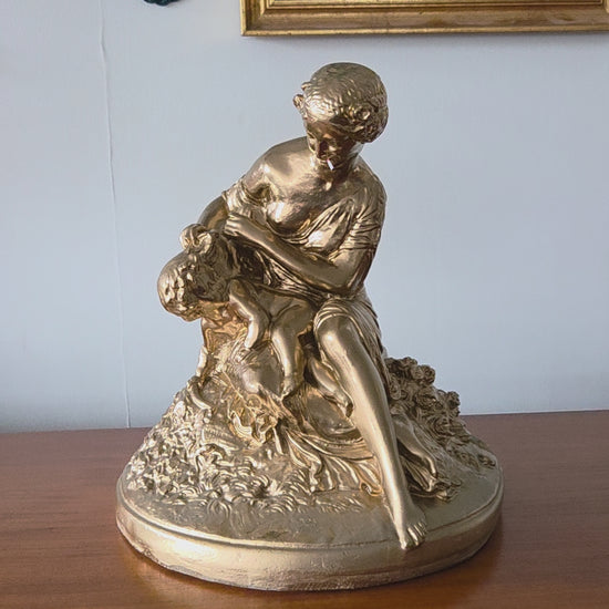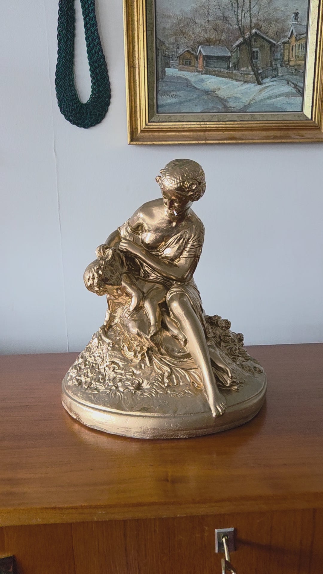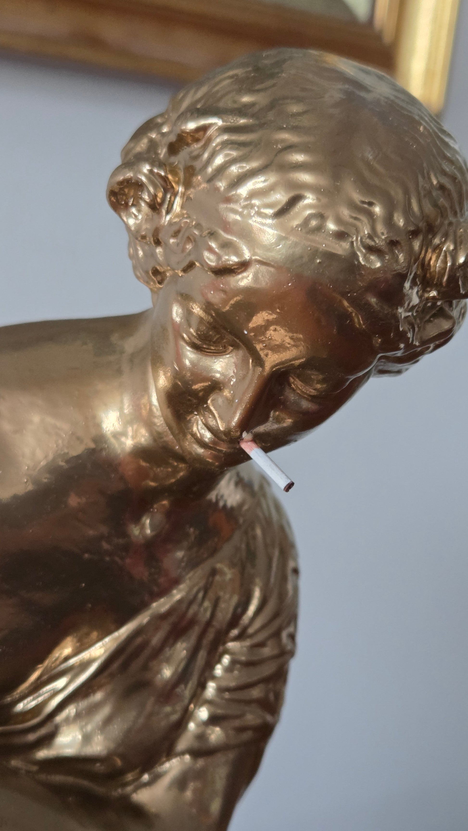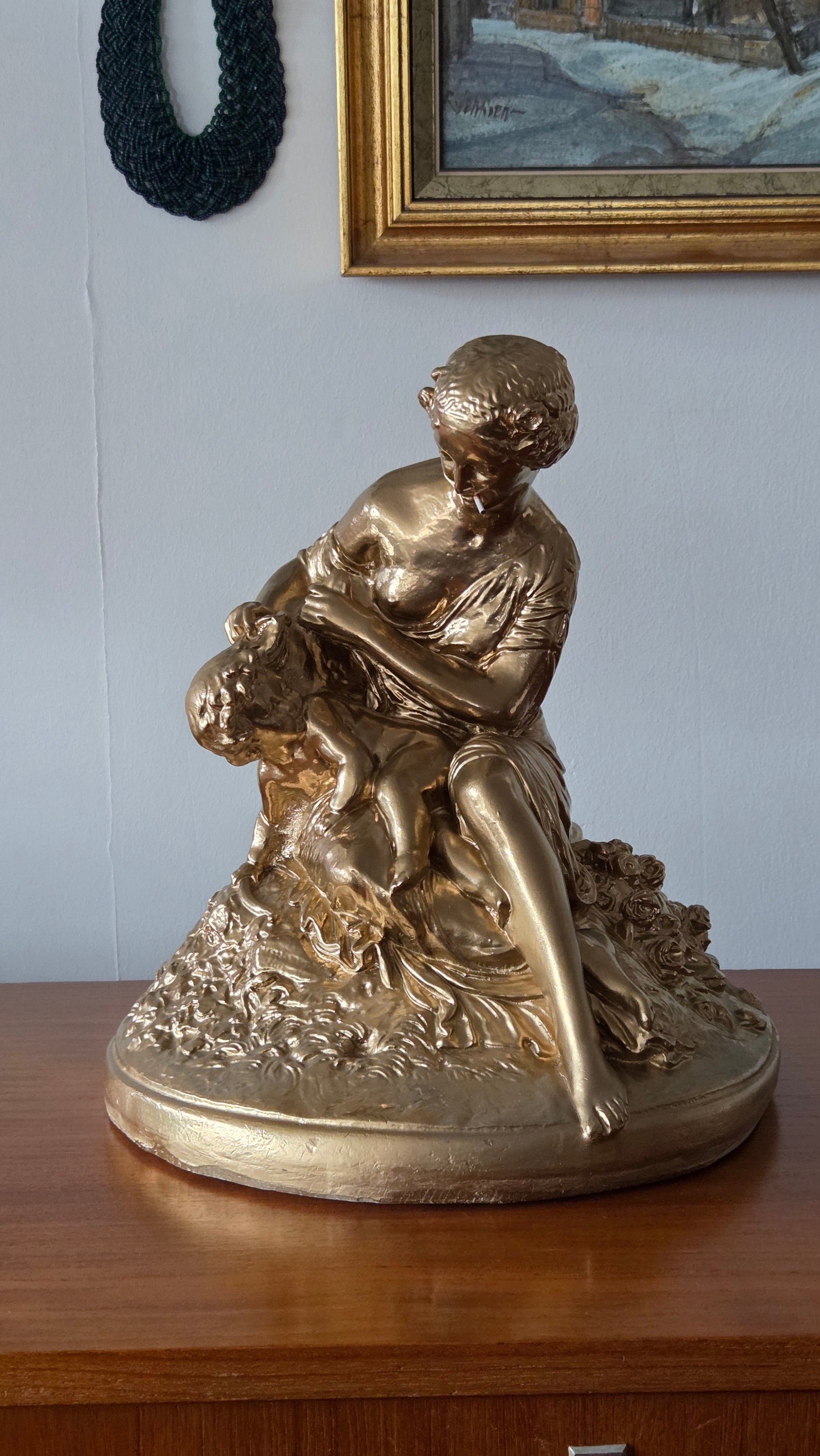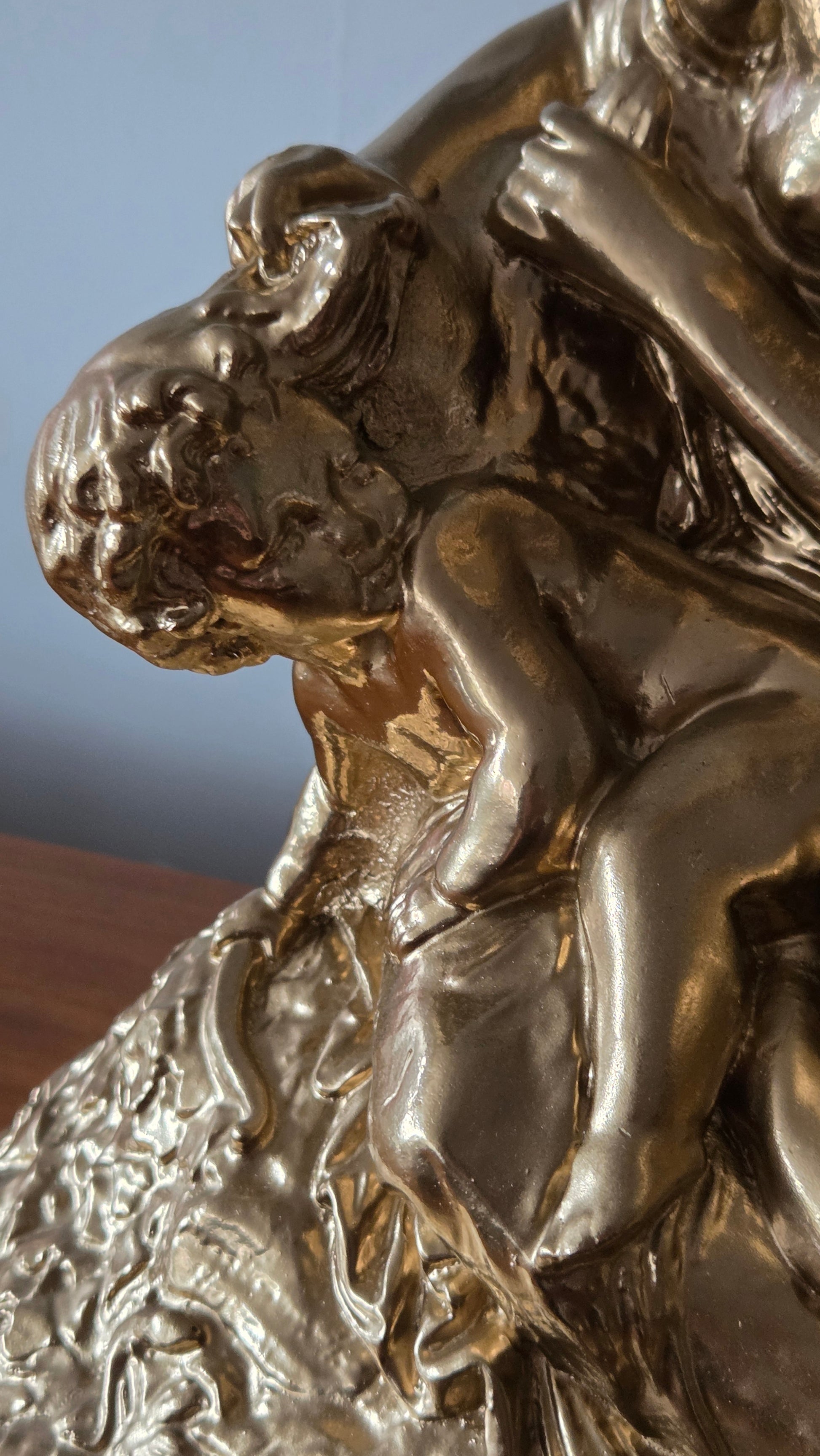 「モダニズム」と名付けられた金色の彫刻。この作品は、あなたがそこに見たいものを表現しており、自宅でも公共の場でも、印象的な目を引く存在です。