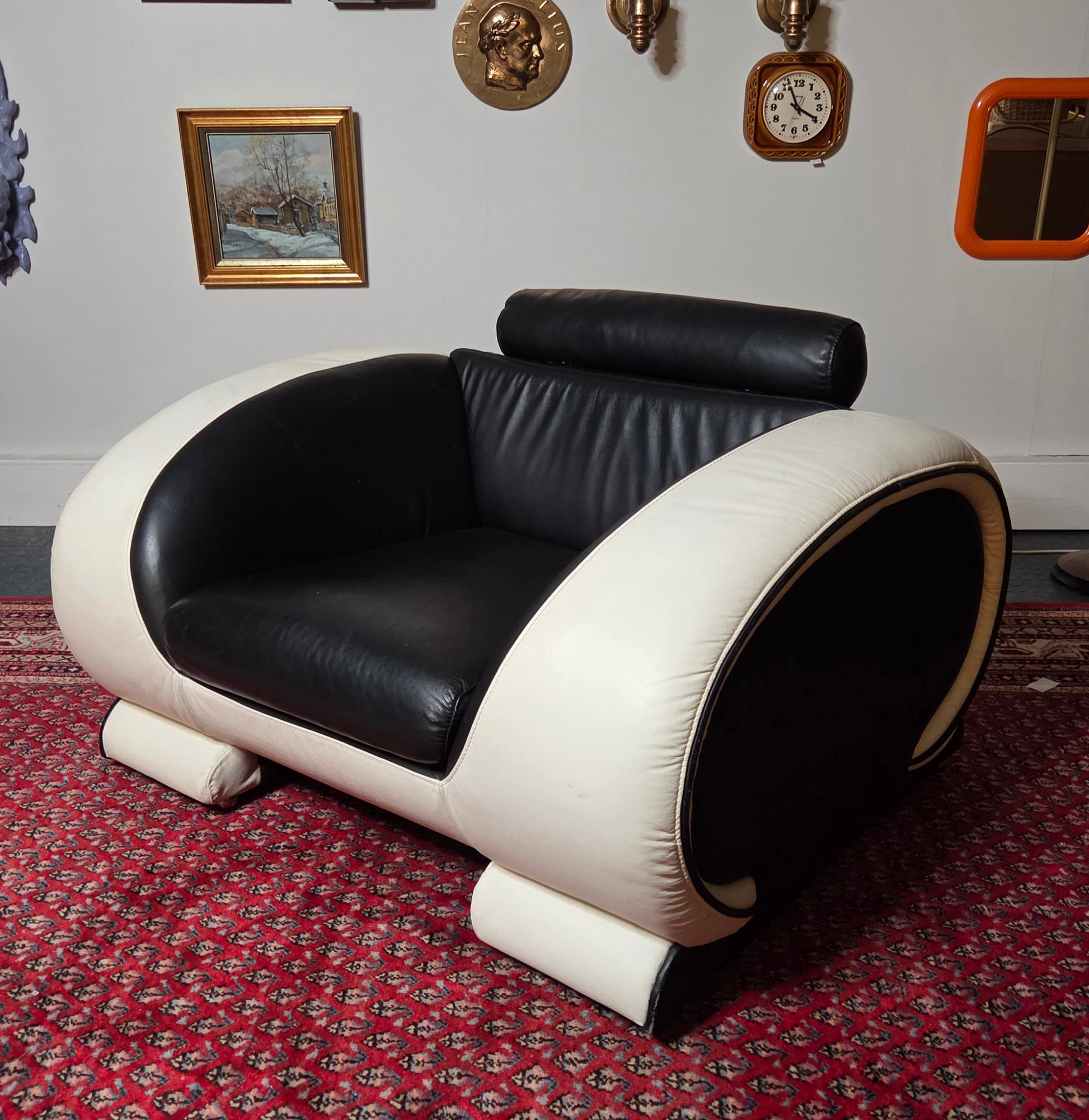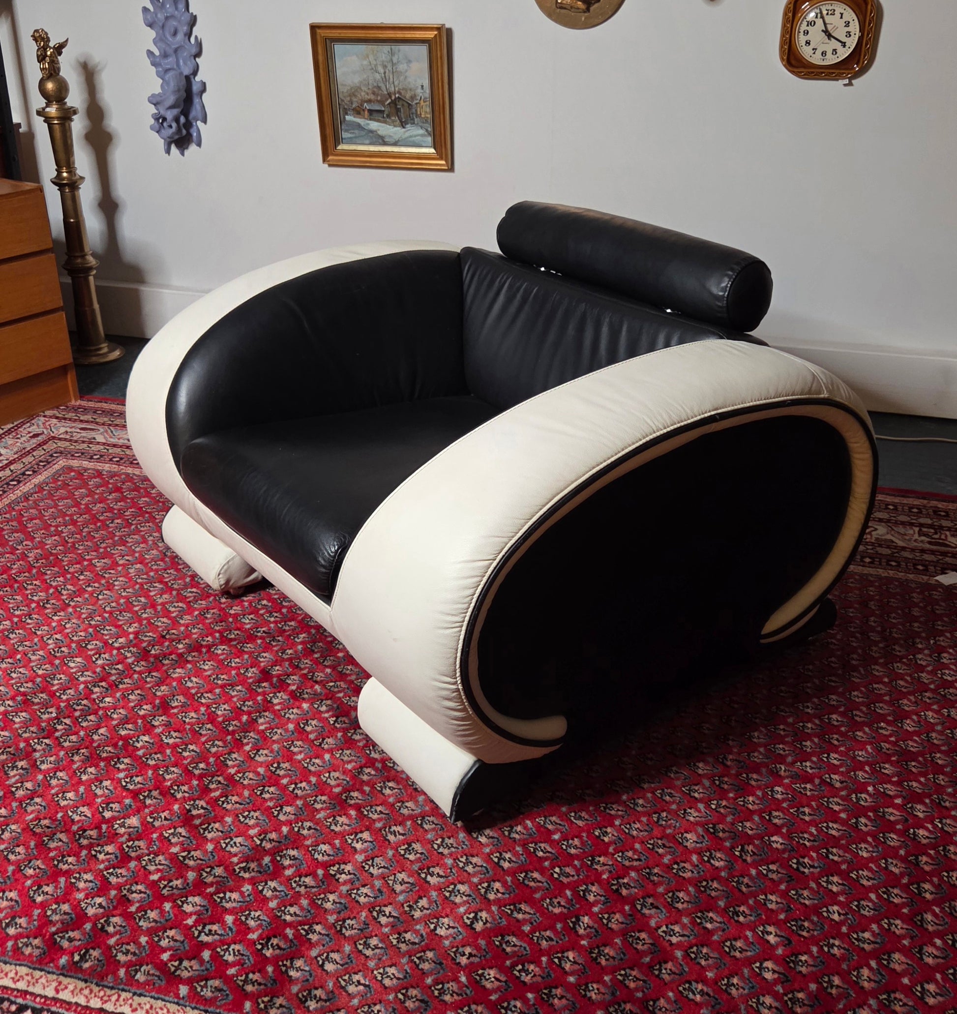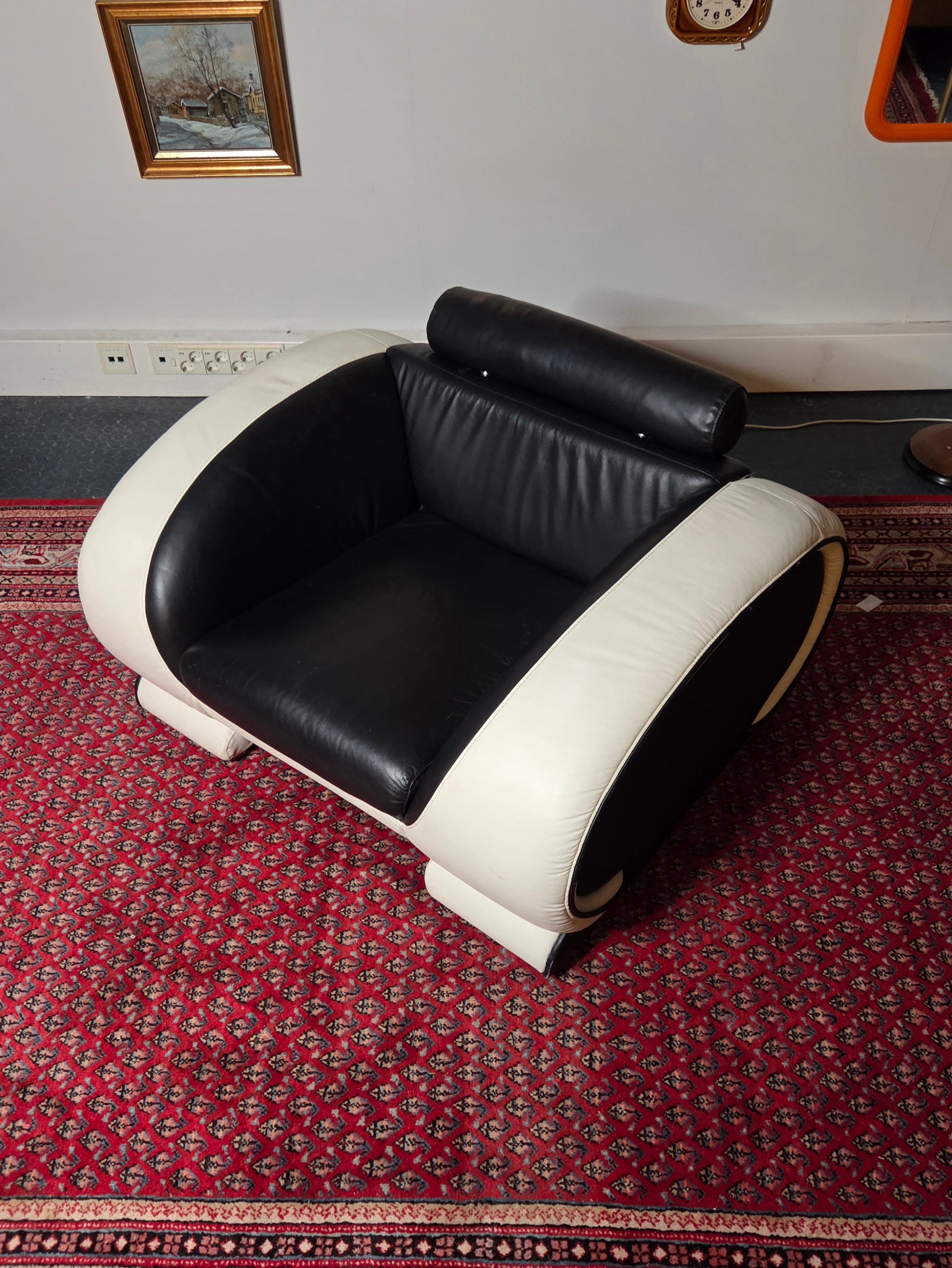 Tyylikäs ja harvinaisempi 90-luvun nojatuoli näyttävällä musta–valkoisella värityksellä. Aitoa nahkaa, joka on hyvin säilynyt – kunto kokonaisuutena hyvä. Futuristinen muotoilu ja kaarevat linjat tekevät tästä todellisen katseenvangitsijan mihin tahansa tilaan.