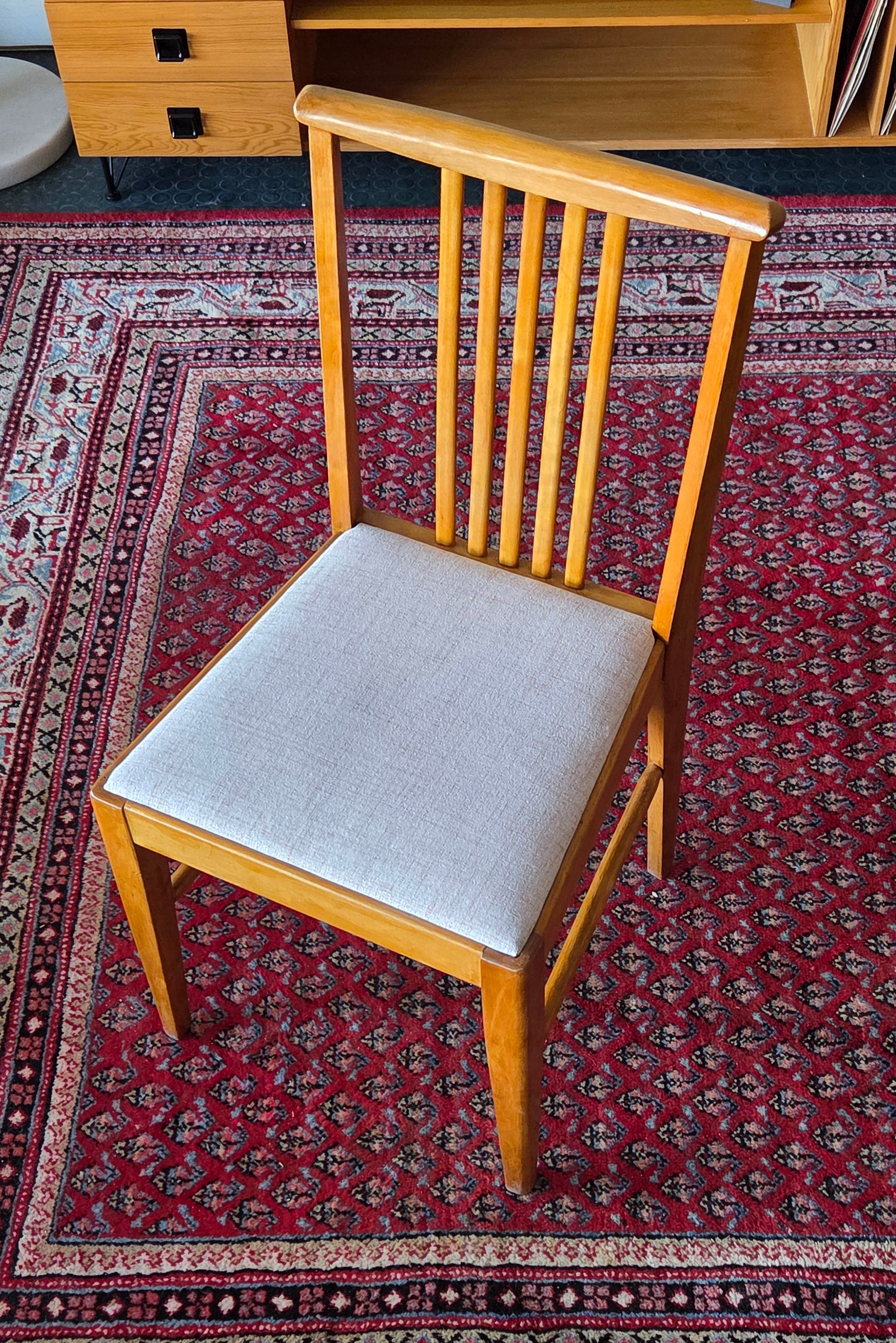 Runko on massiivipuuta, lämmin sävy tuo kauniisti esiin puun luonnollisen pinnan. Istuinosat on uudelleen verhoiltu vaalealla vähän punertavalla neutraalinsävyisellä kankaalla, joka sopii monenlaiseen sisustukseen.