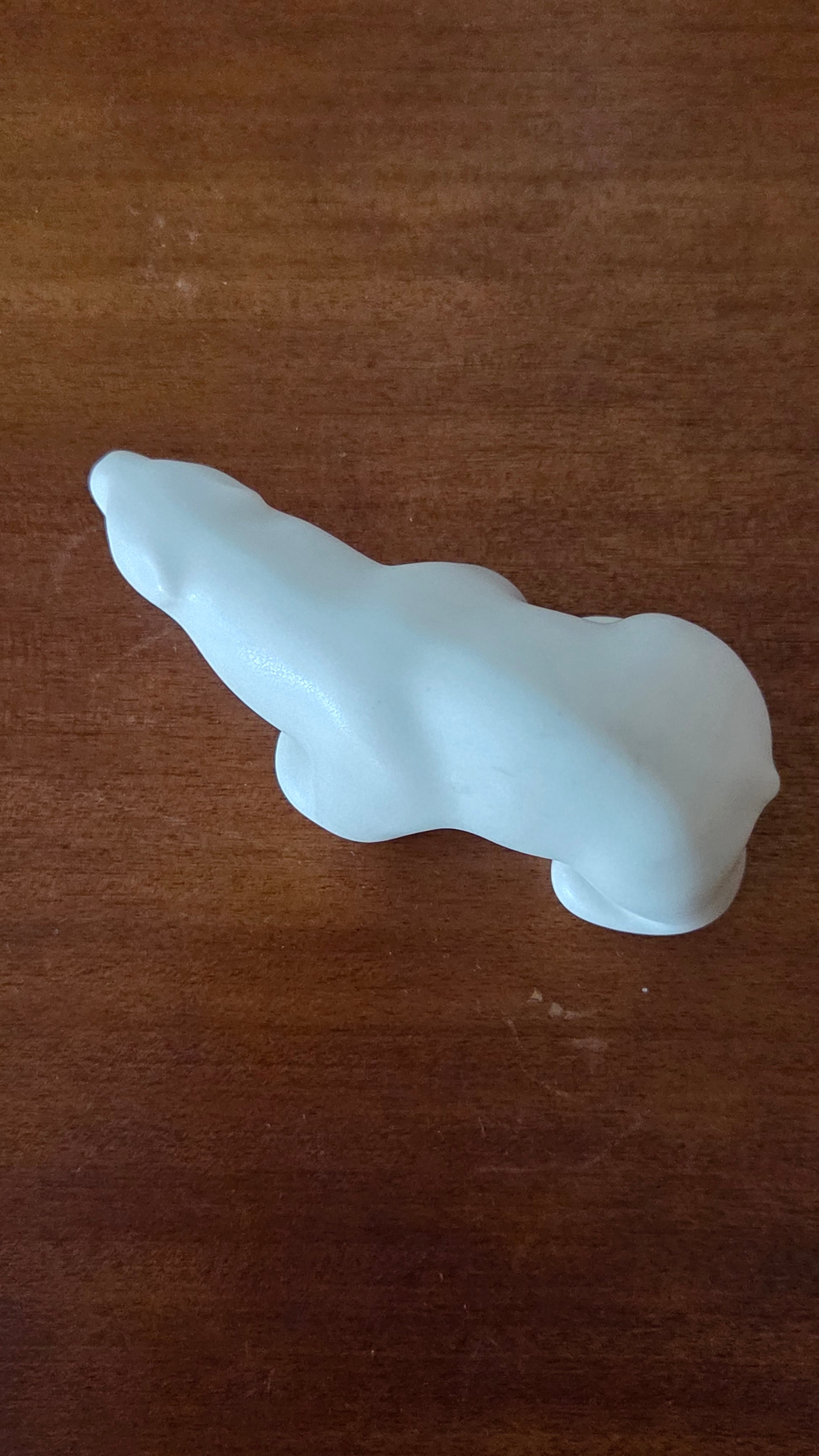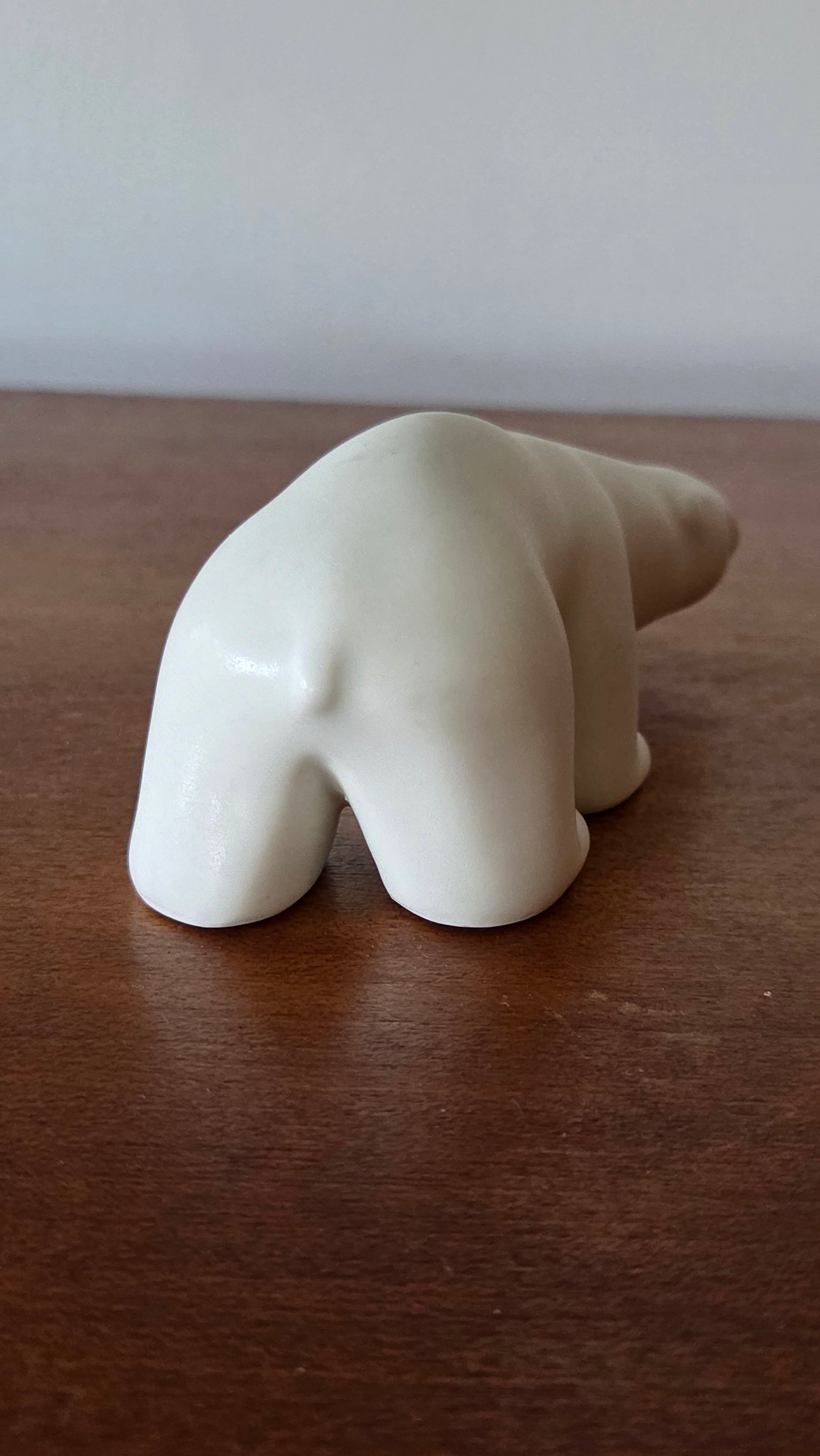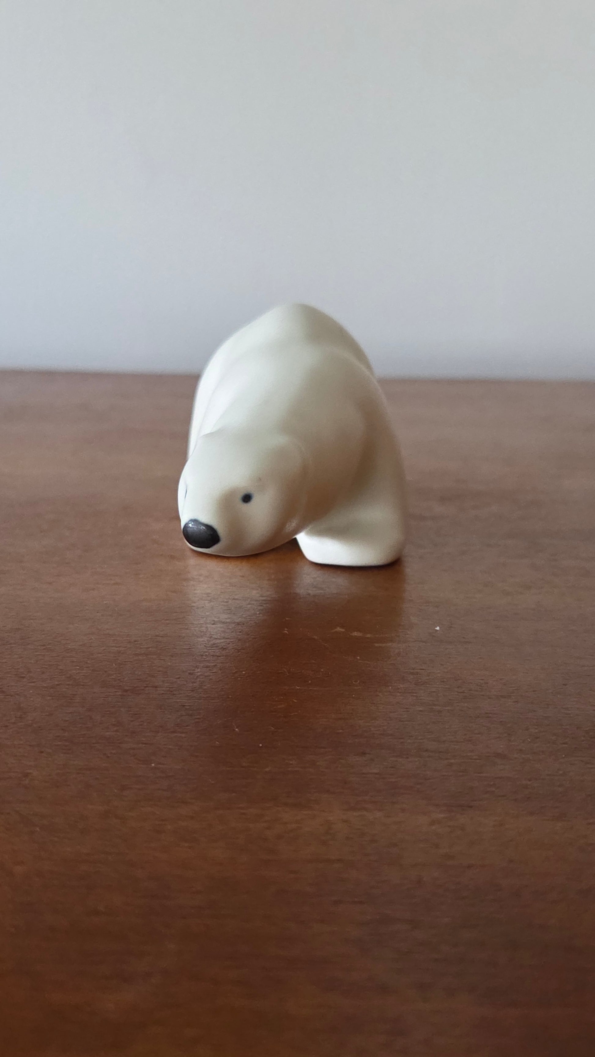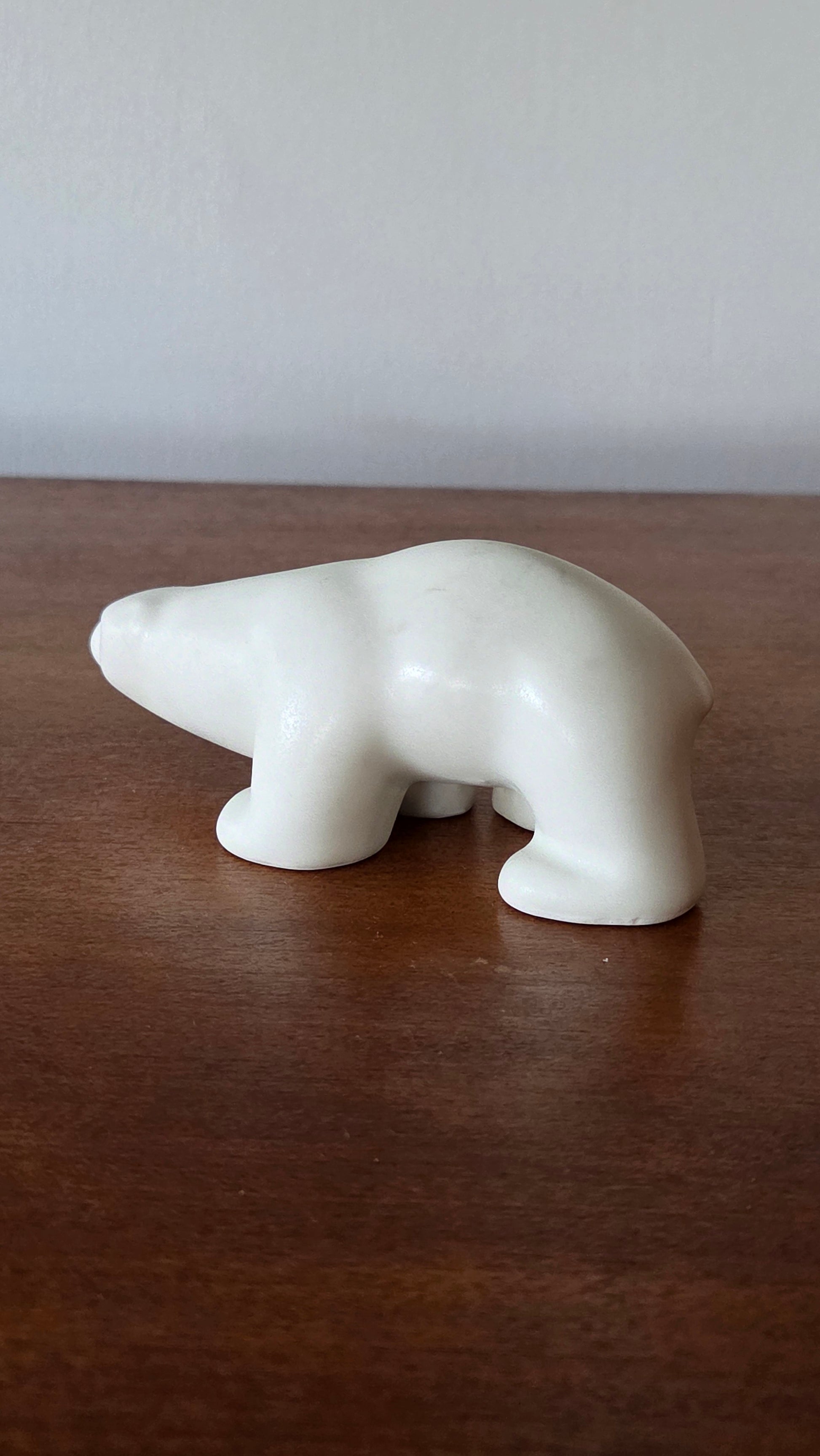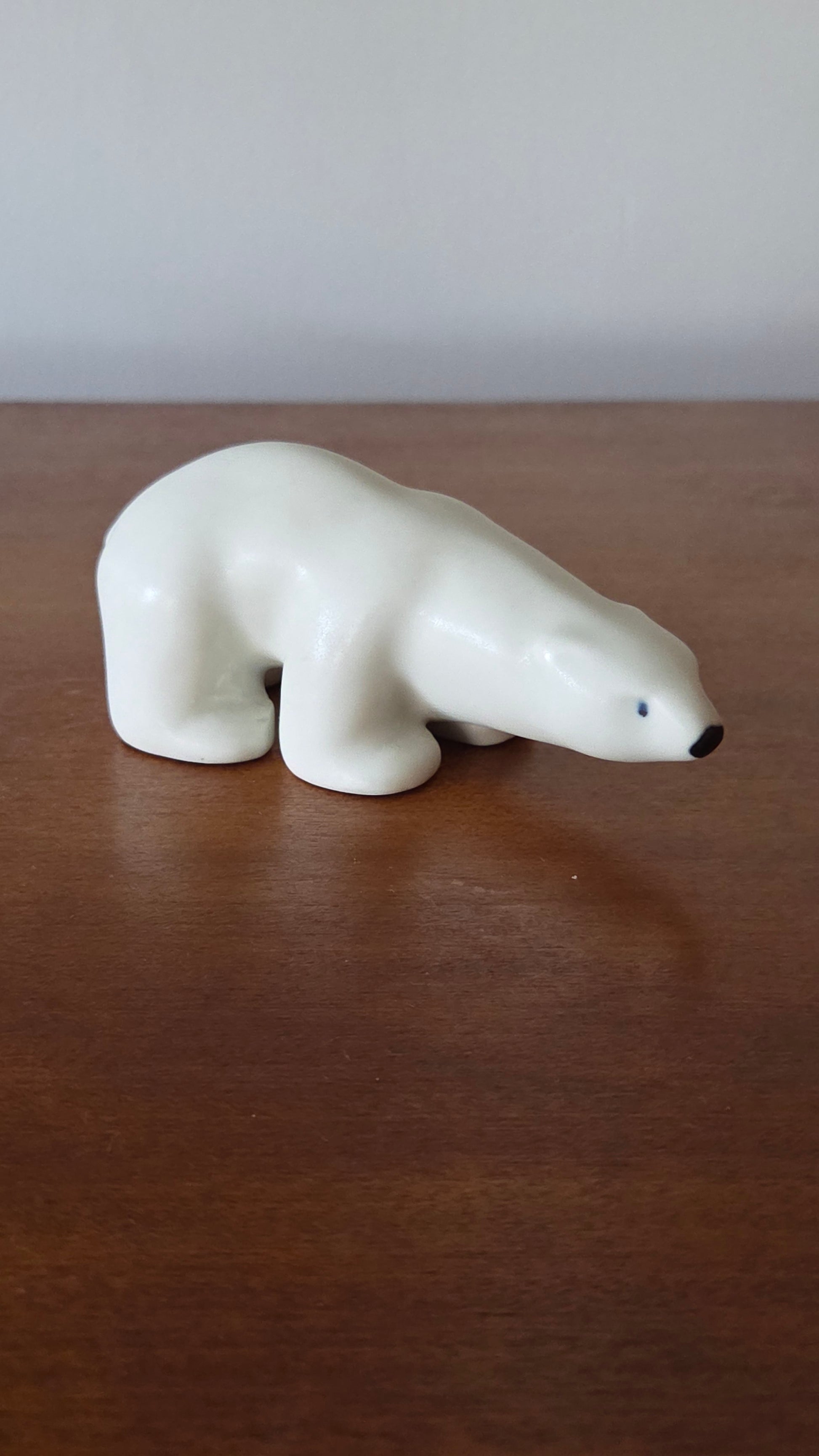 Sulavalinjainen ja keräilijöiden arvostama Arabian fajanssinen jääkarhu, suunnittelija Raili Eerola. Tämä pieni, mutta ilmeikäs figuuri on valmistettu 1960-luvulla.