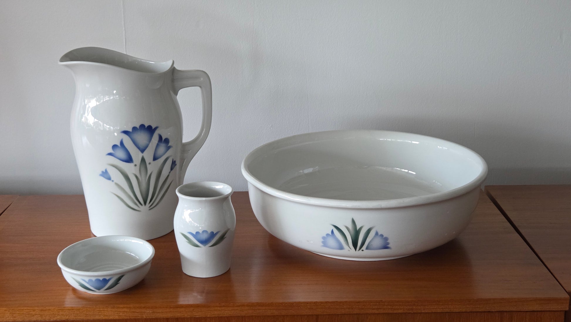 Kaunis ja hyväkuntoinen Arabia Sinikello -pesusetti, joka koostuu seuraavista osista: