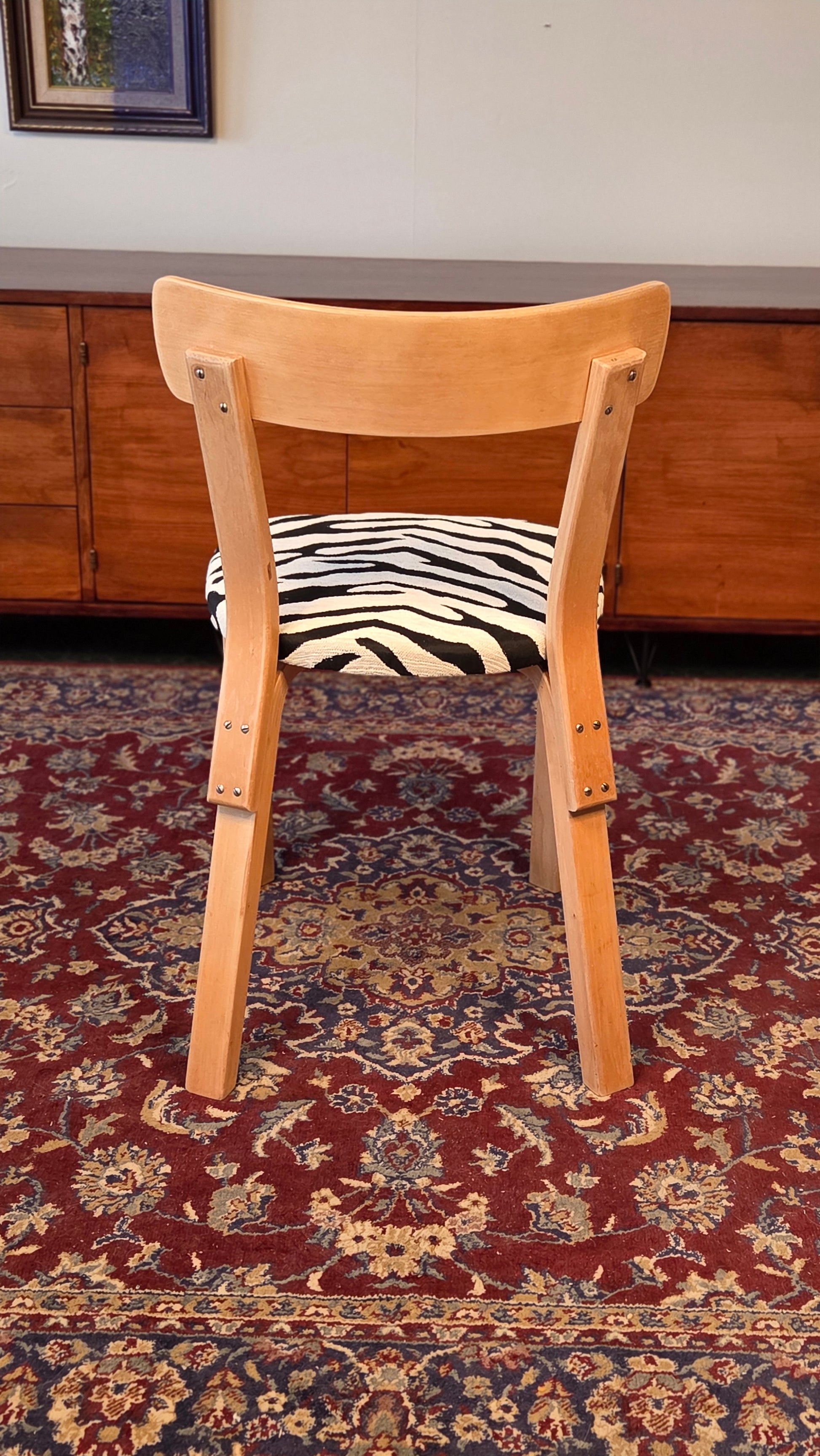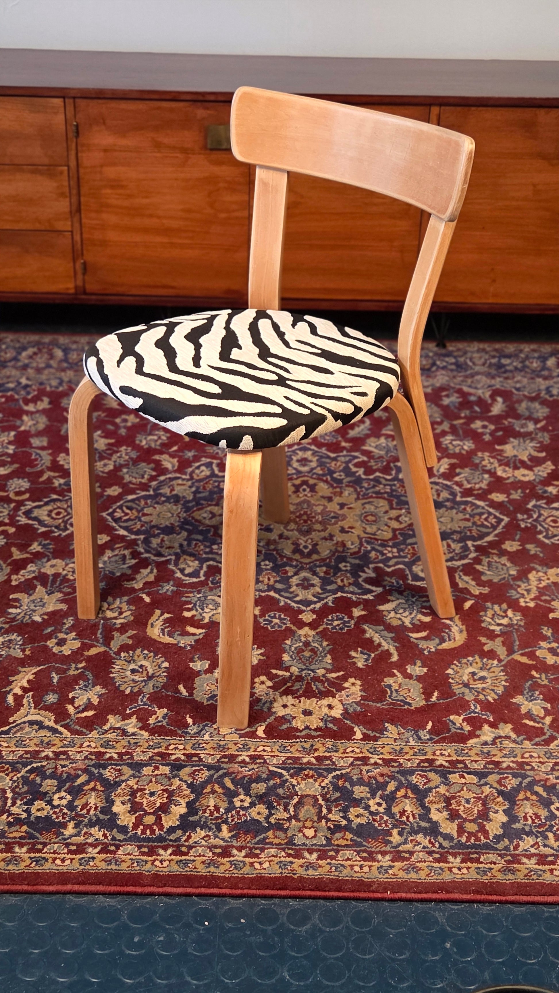 Vanhempi talttapääruuveilla oleva Artek 69 tuoli seepra verhoilukankaalla.