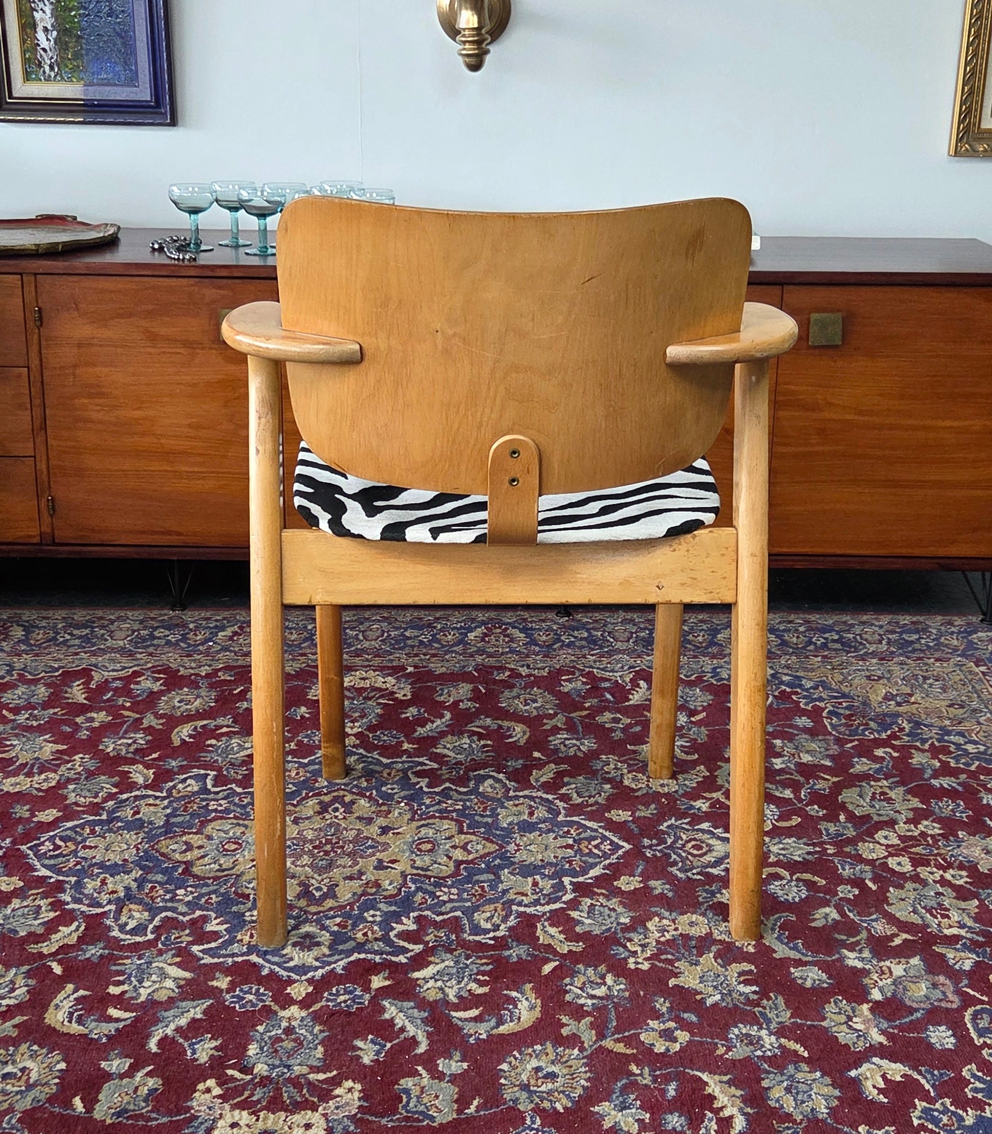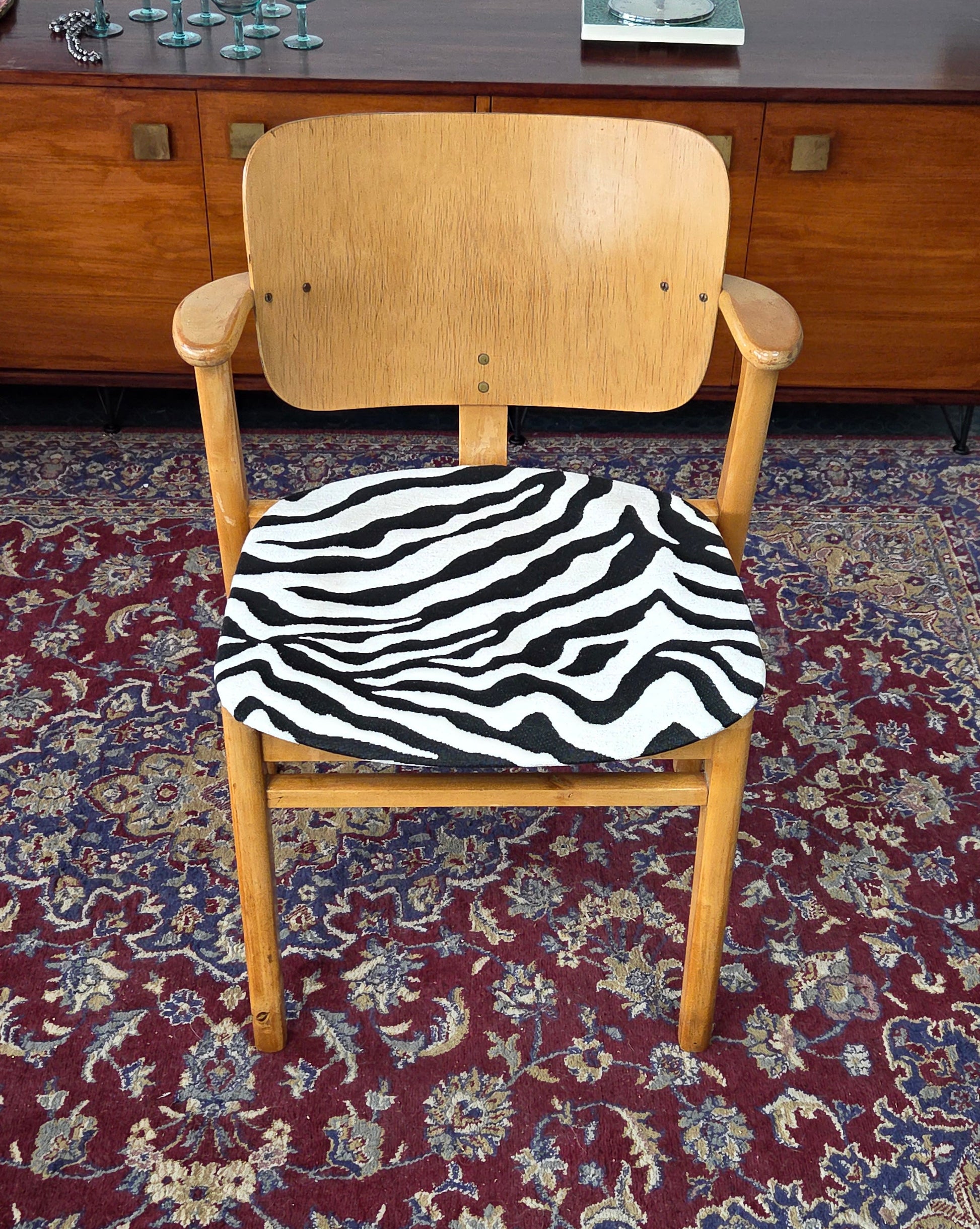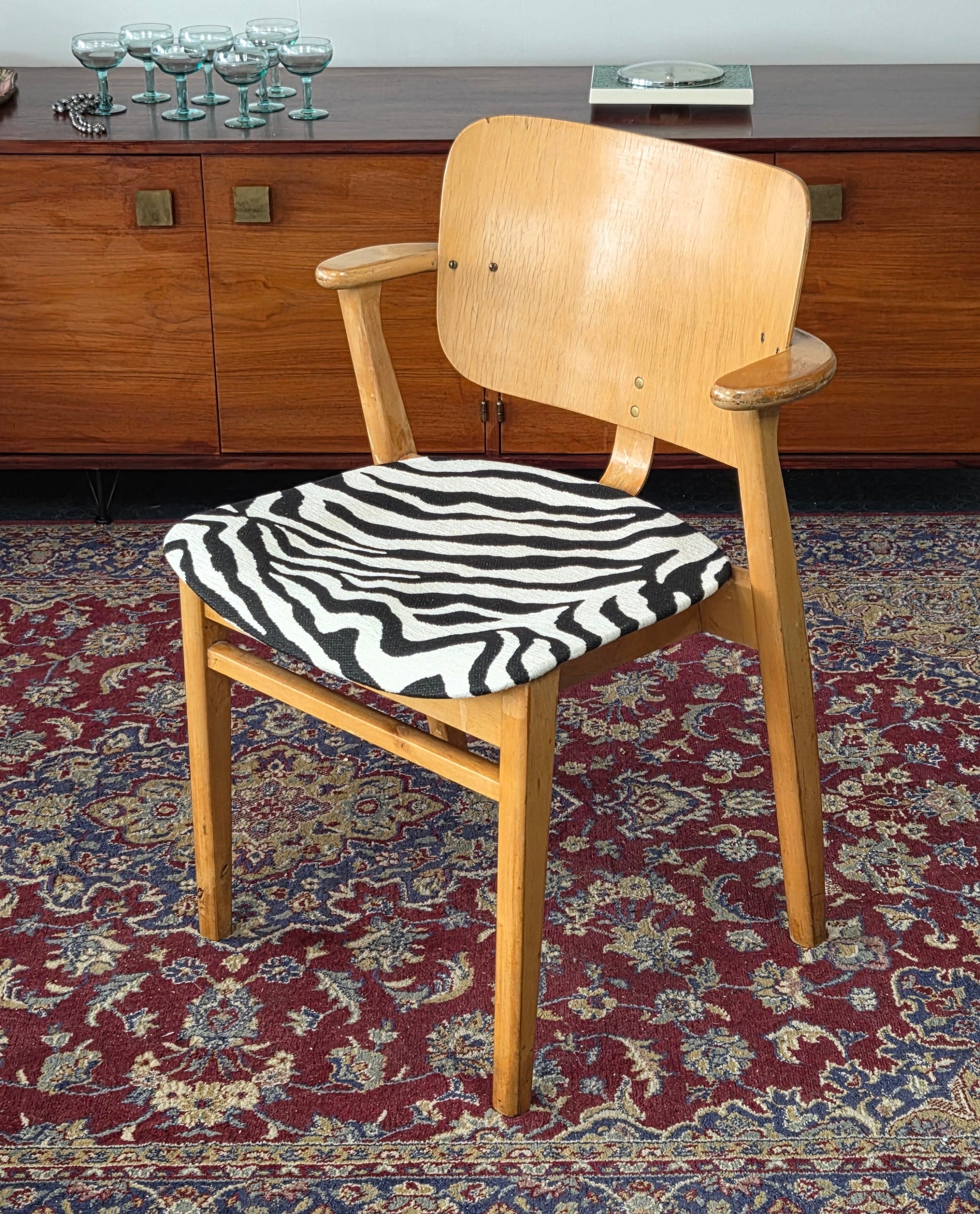 Kauniisti muotoiltu kaareva selkänoja ja käsinojat, tukeva massiivipuurunko. Istuin verhoiltu seeprakuvioisella kankaalla, joka tuo modernin twistin klassikkoon.