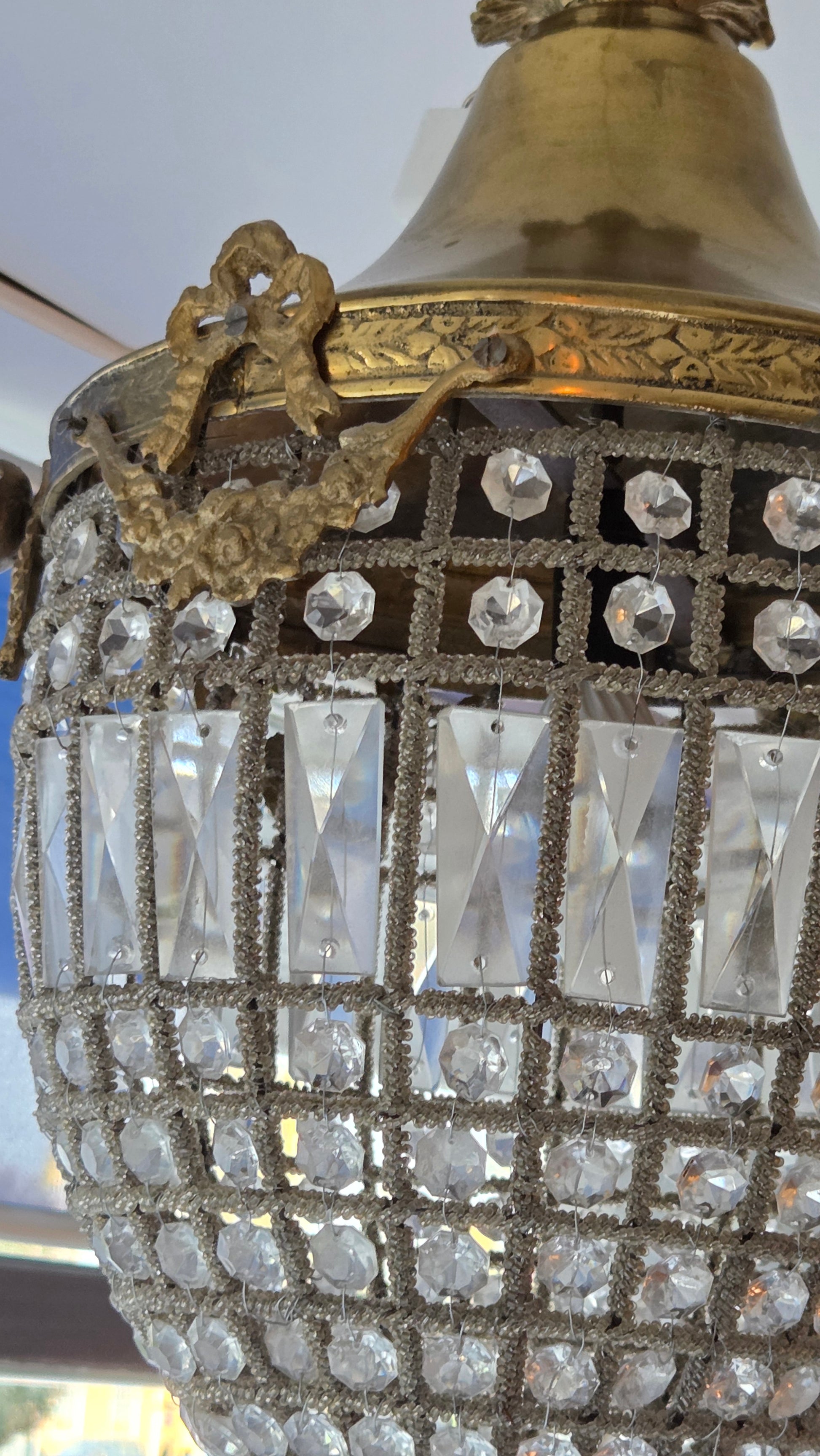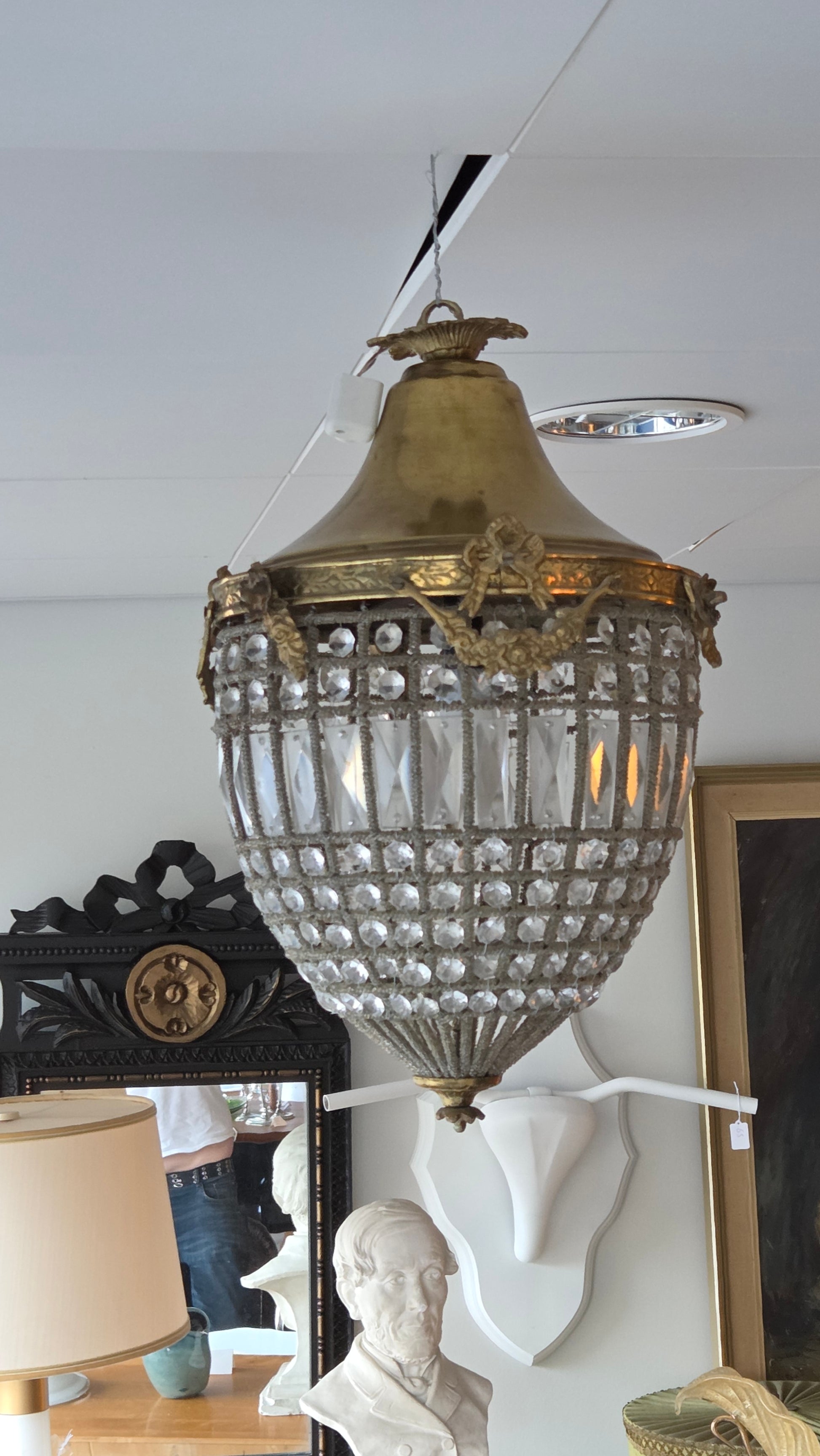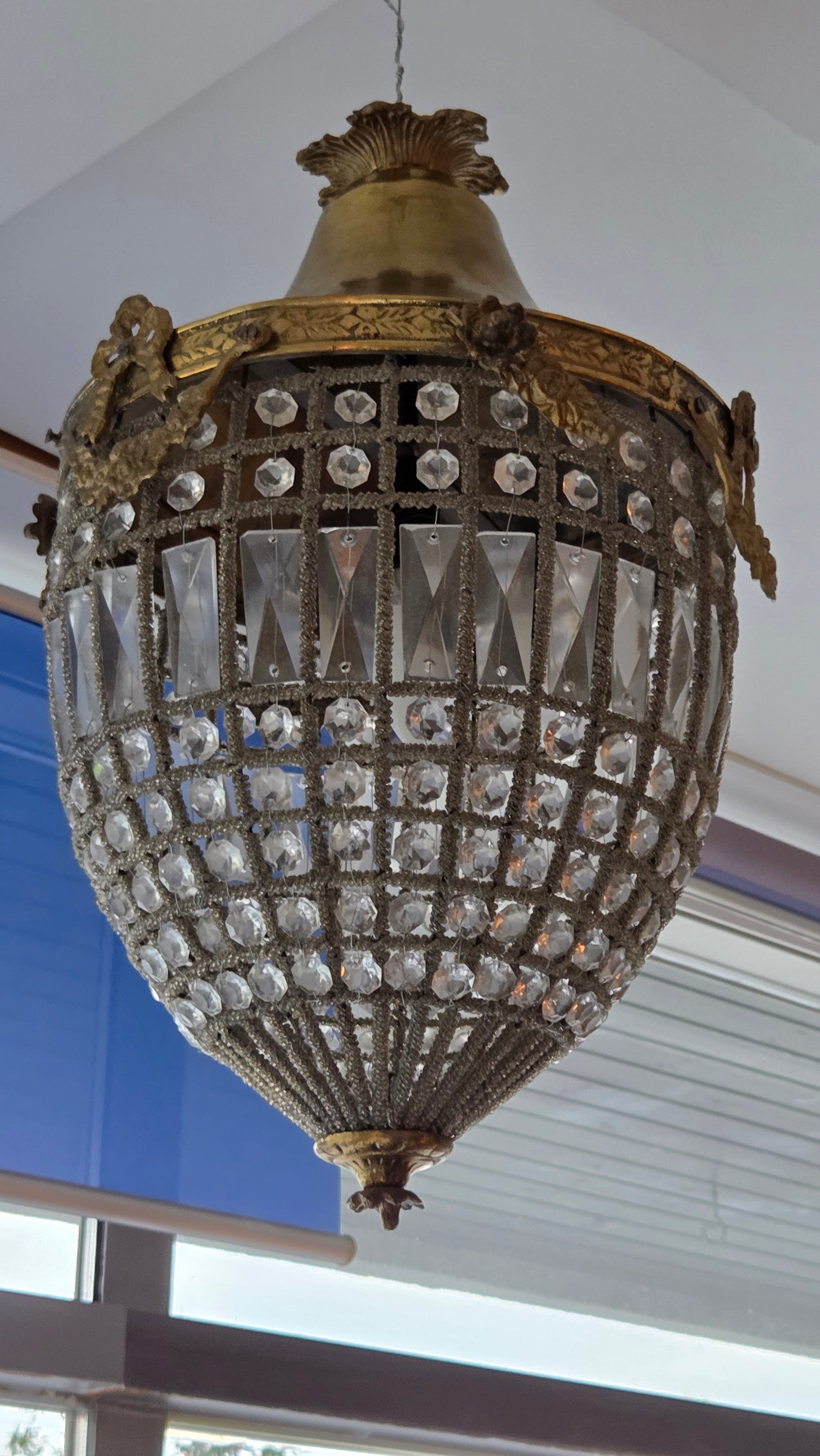 Tyylikäs empire-henkinen kristallikruunu, jonka metalliosat ovat messinkiä ja koristeena runsaasti hiottuja kristalliprismoja. Koristeaiheina mm. rusetti- ja kukkaornamentteja.