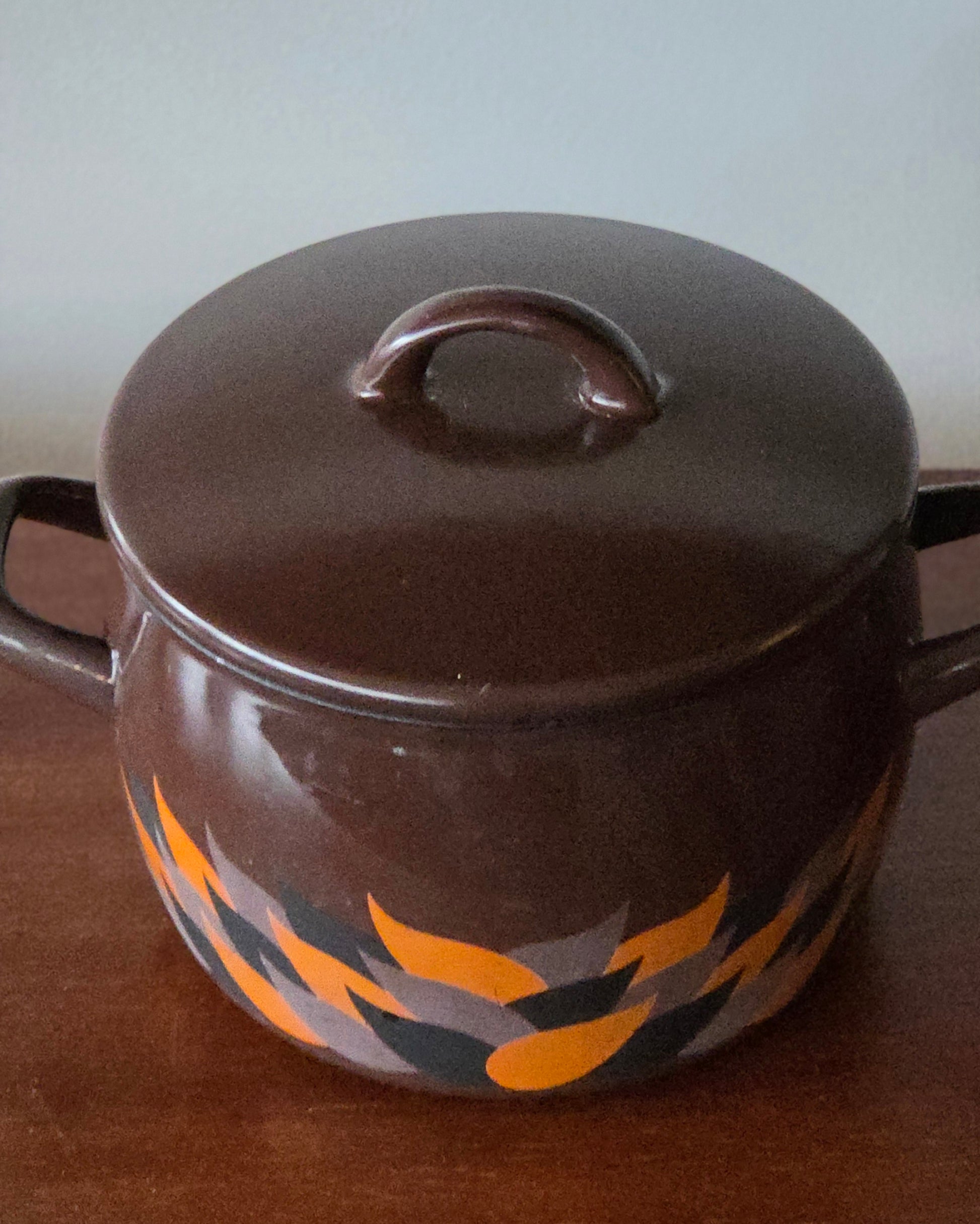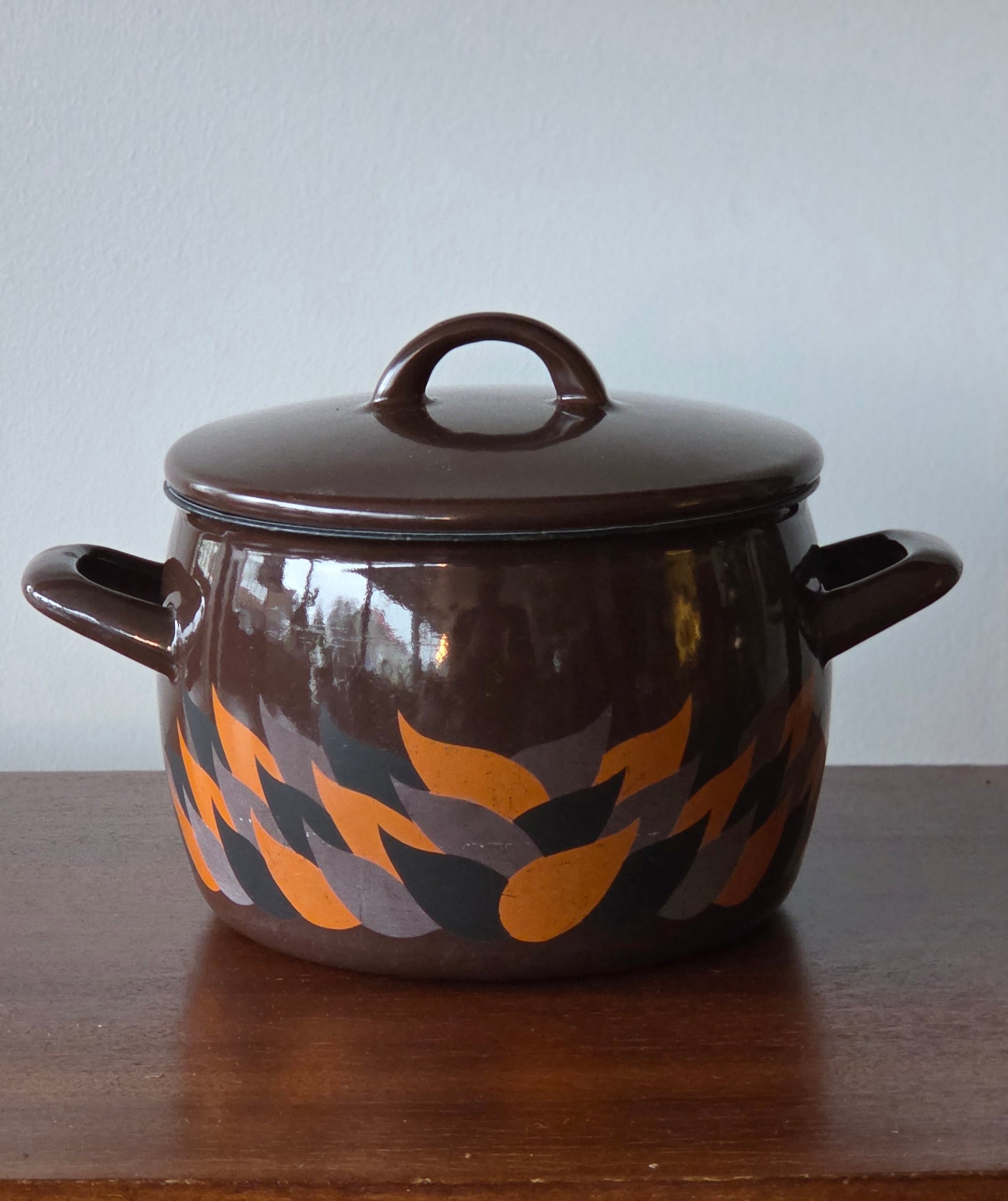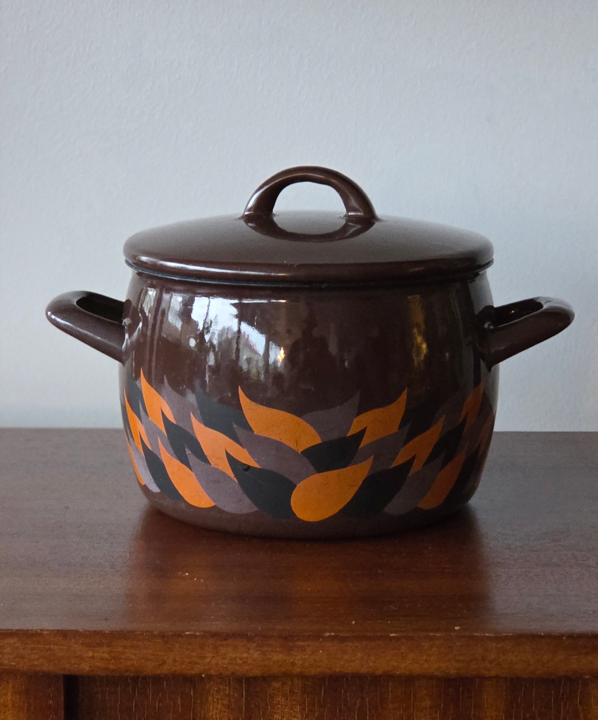 Kaunis ja harvinaisempi Finel / Arabia Liekki -emalikattila, suunnittelijana Raija Uosikkinen, 1960-luku.