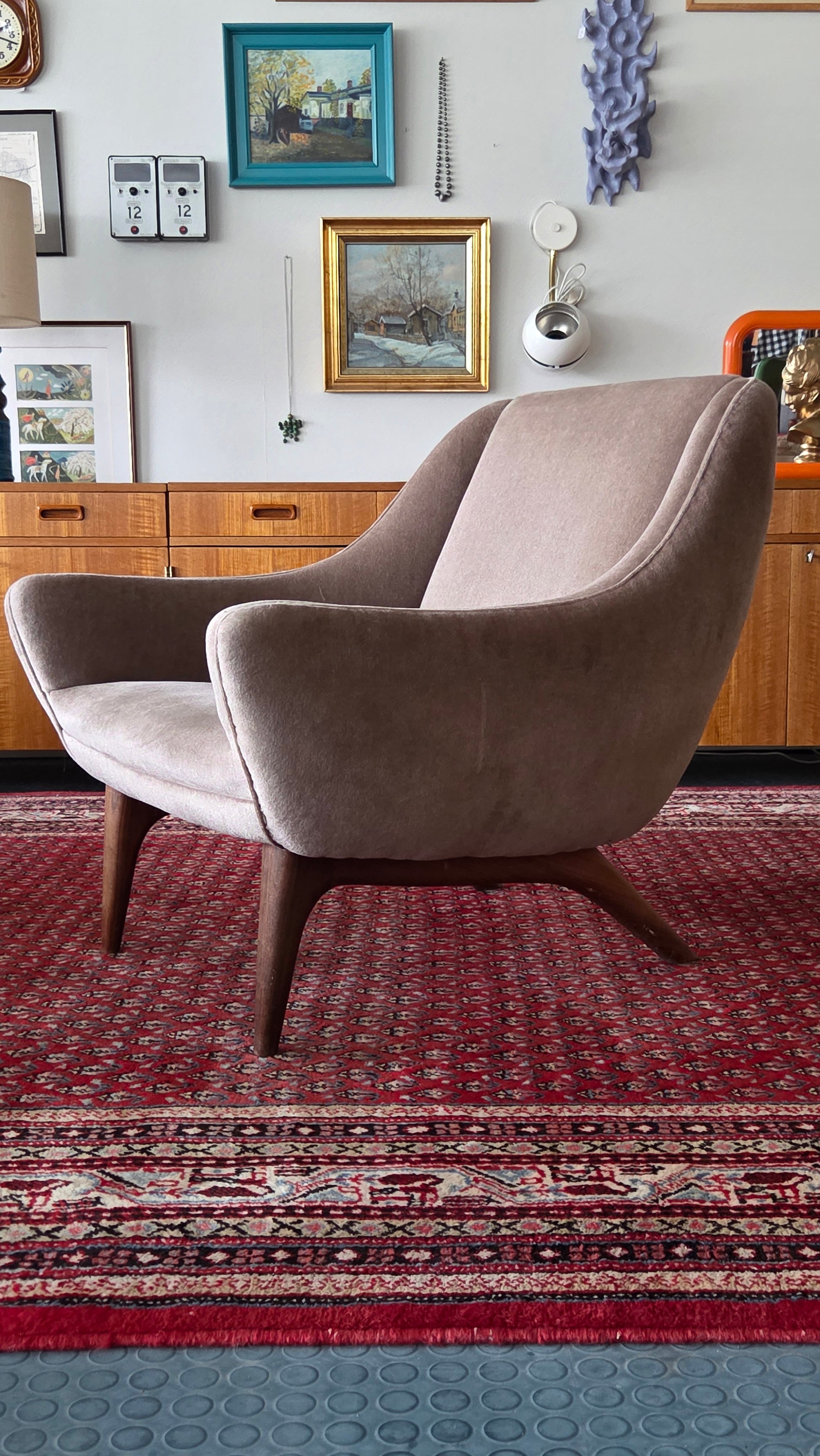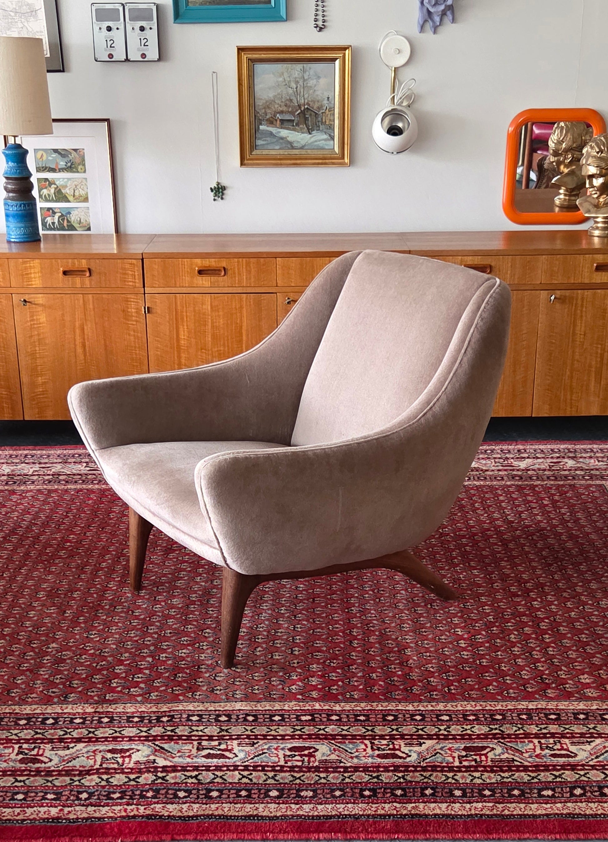 Harvinainen ja laadukas tanskalainen designklassikko. Illum Wikkelsøn suunnittelema nojatuoli, valmistajana arvostettu Mikael Laursen & Poika. Tyylilleen uskollisesti tuolissa yhdistyvät kauniit linjat, mukavuus ja korkeatasoiset materiaalit.