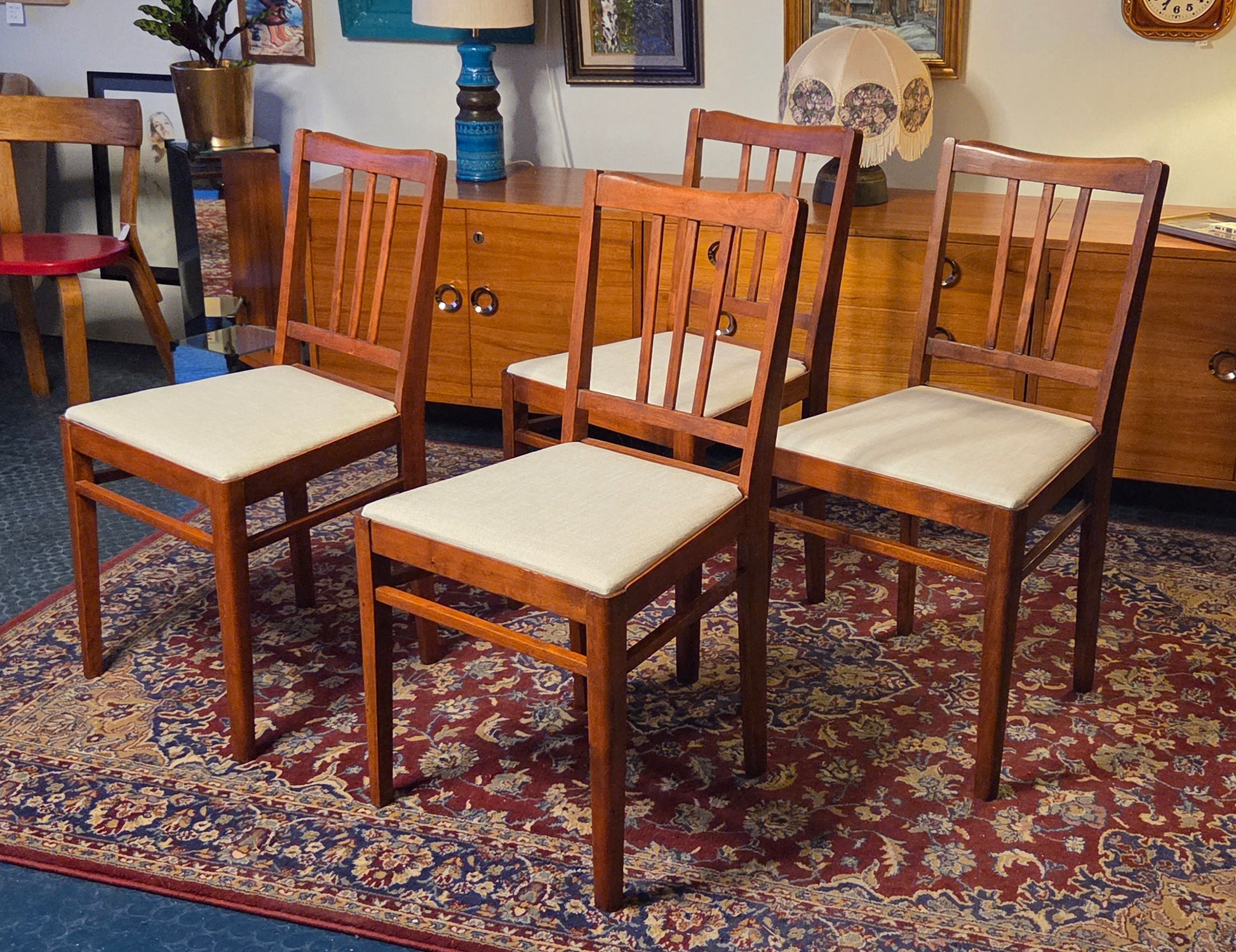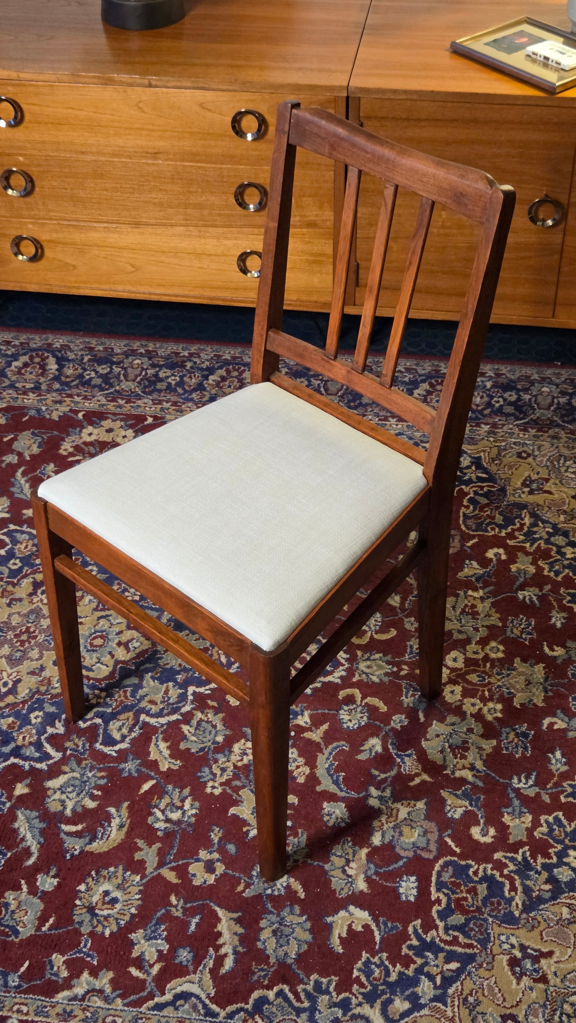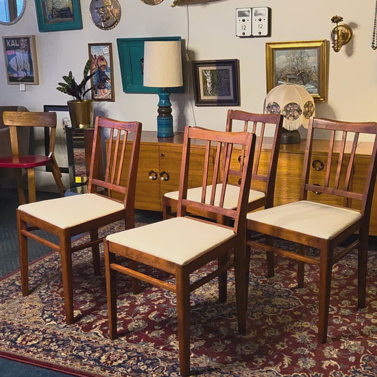 Kaunis setti 1950-luvun puutuoleja, jotka on kunnostettu ja uudelleen verhoiltu.