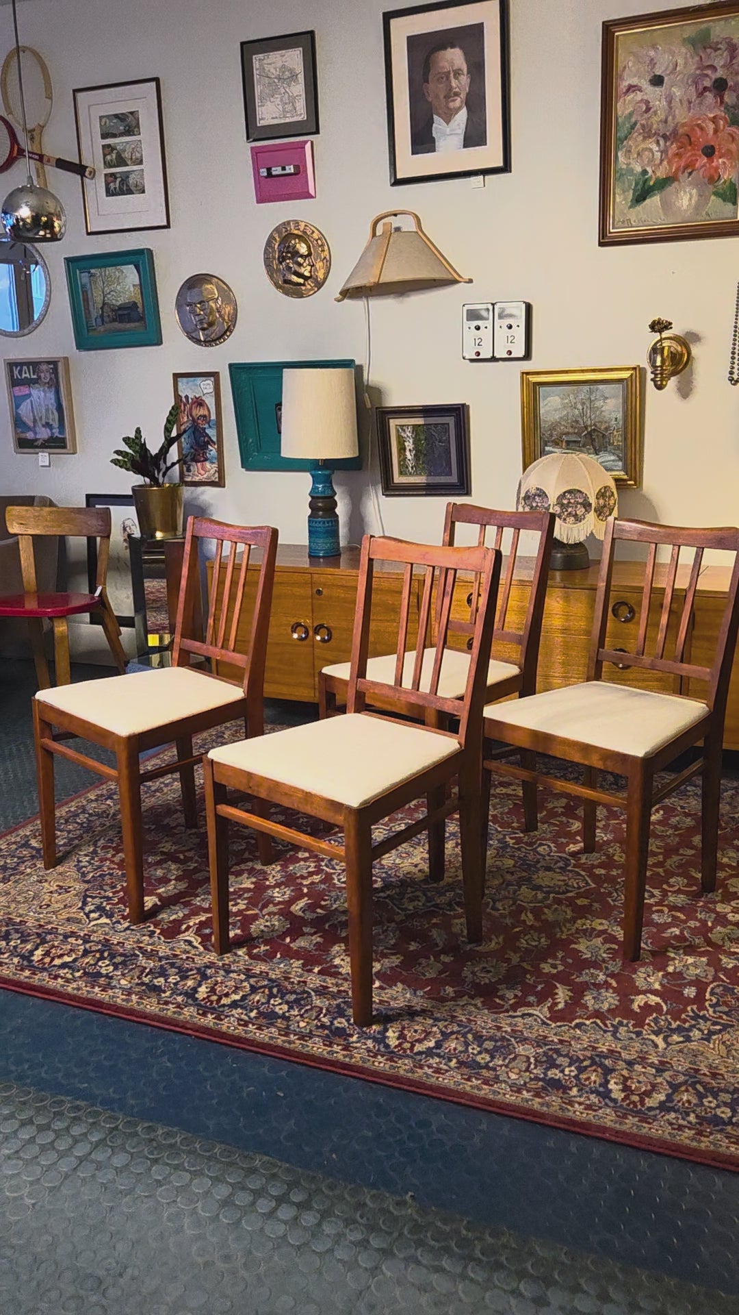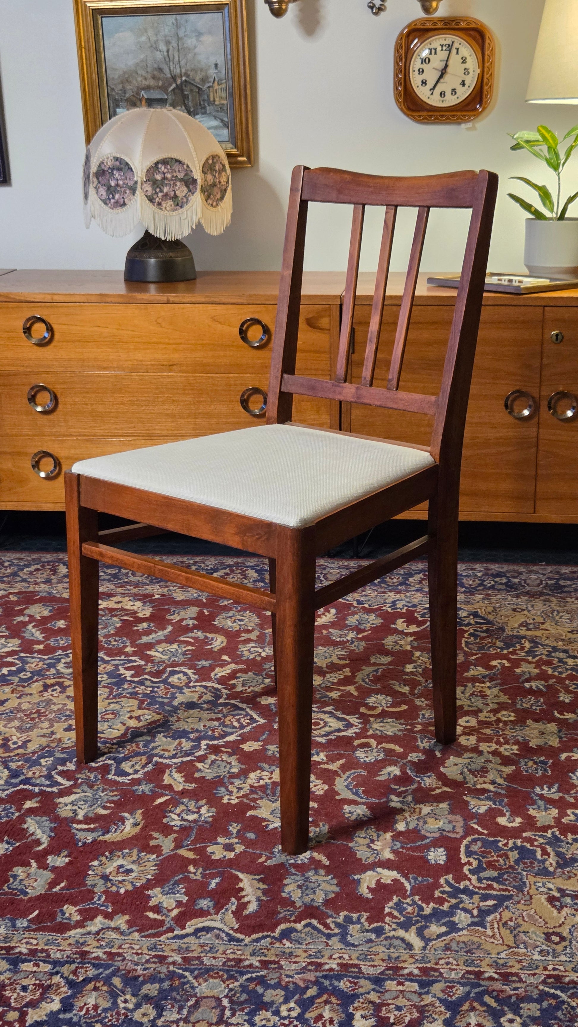 Sopivat täydellisesti ruokapöydän ympärille, vintage-henkiseen kotiin tai osaksi modernia sisustusta tuomaan lämpöä ja historiaa. Uudelleen verhoiltuina tuolit ovat heti käyttövalmiit.
