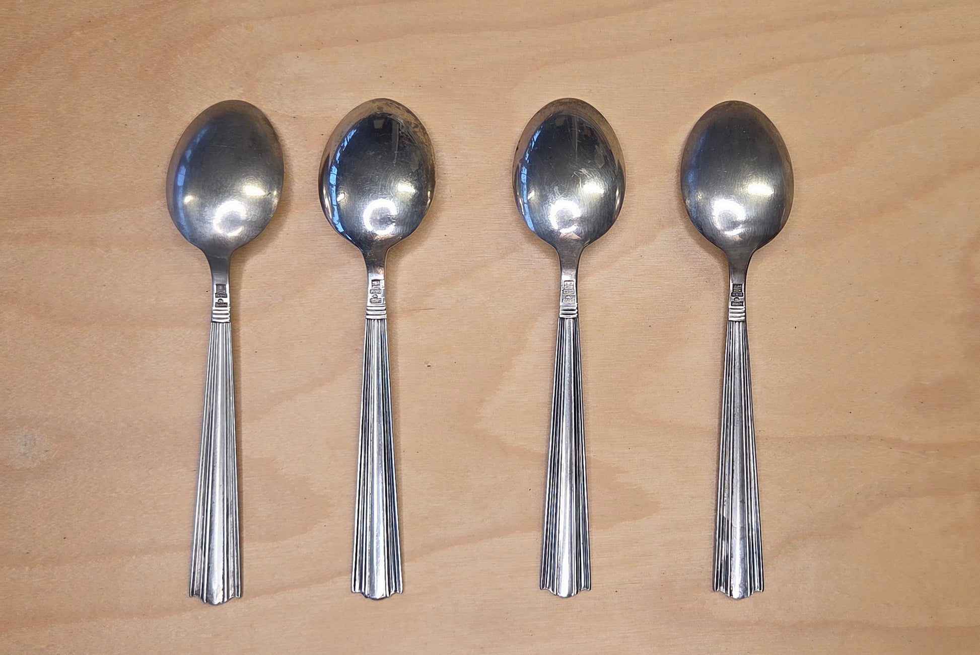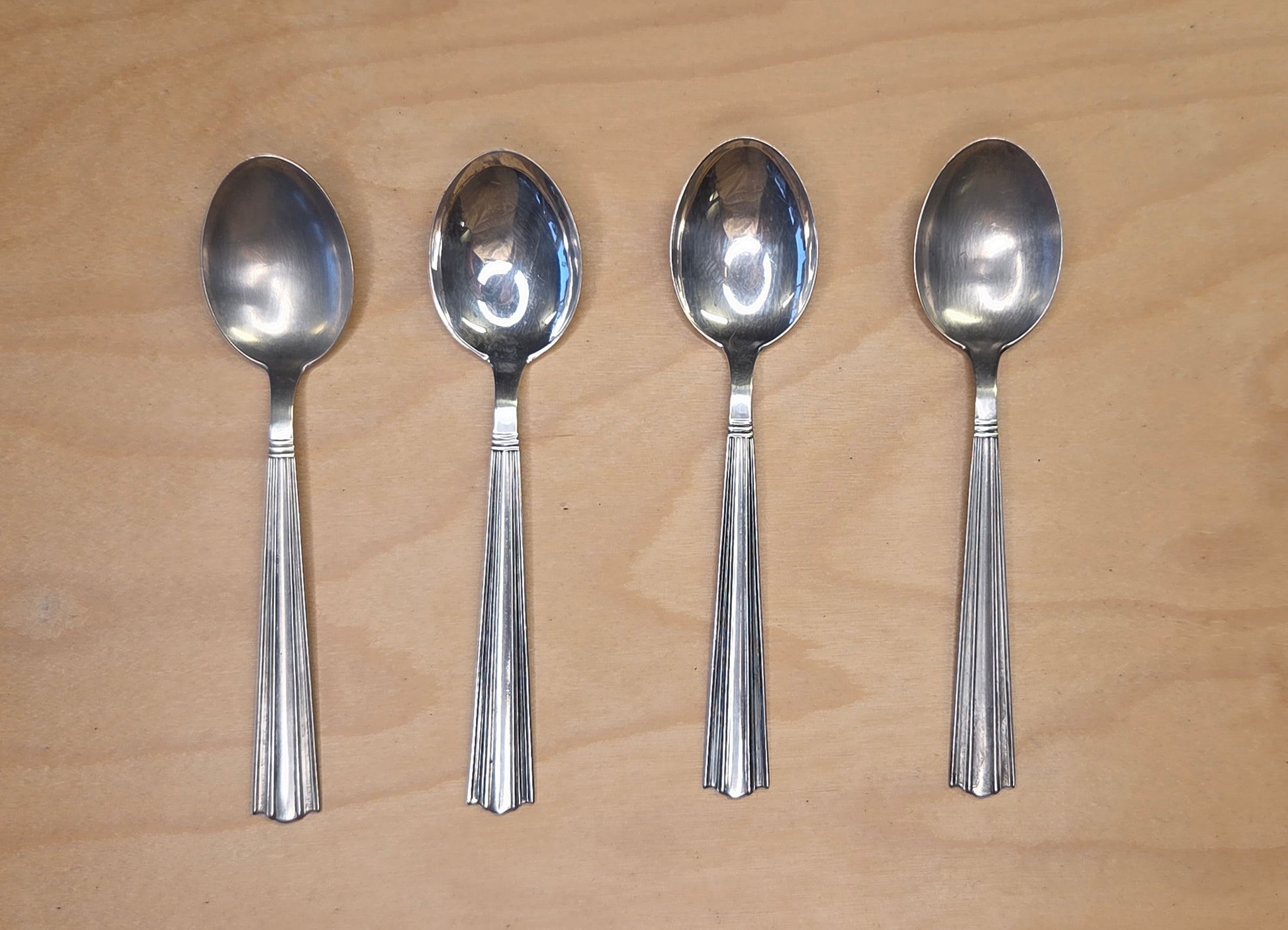 Margit-sarjan 916-hopealusikat, 4 kpl – pituus 16 cm, yht. paino 115,4 g, valmistusvuosi 1957 – suunnittelija Holger Rasmussen