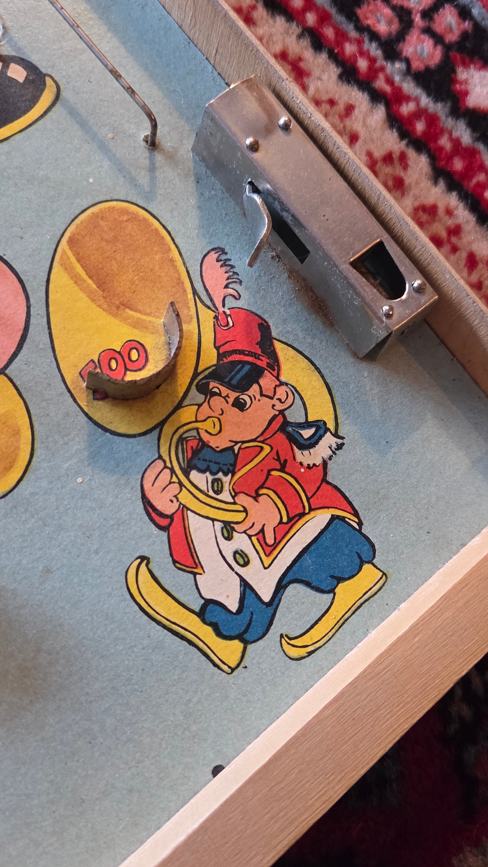 Hauska vintage-tyylinen mekaaninen flipperipeli, jossa värikäs sirkusaiheinen kuvitus: klovni, panda ja soittokunnan muusikko.