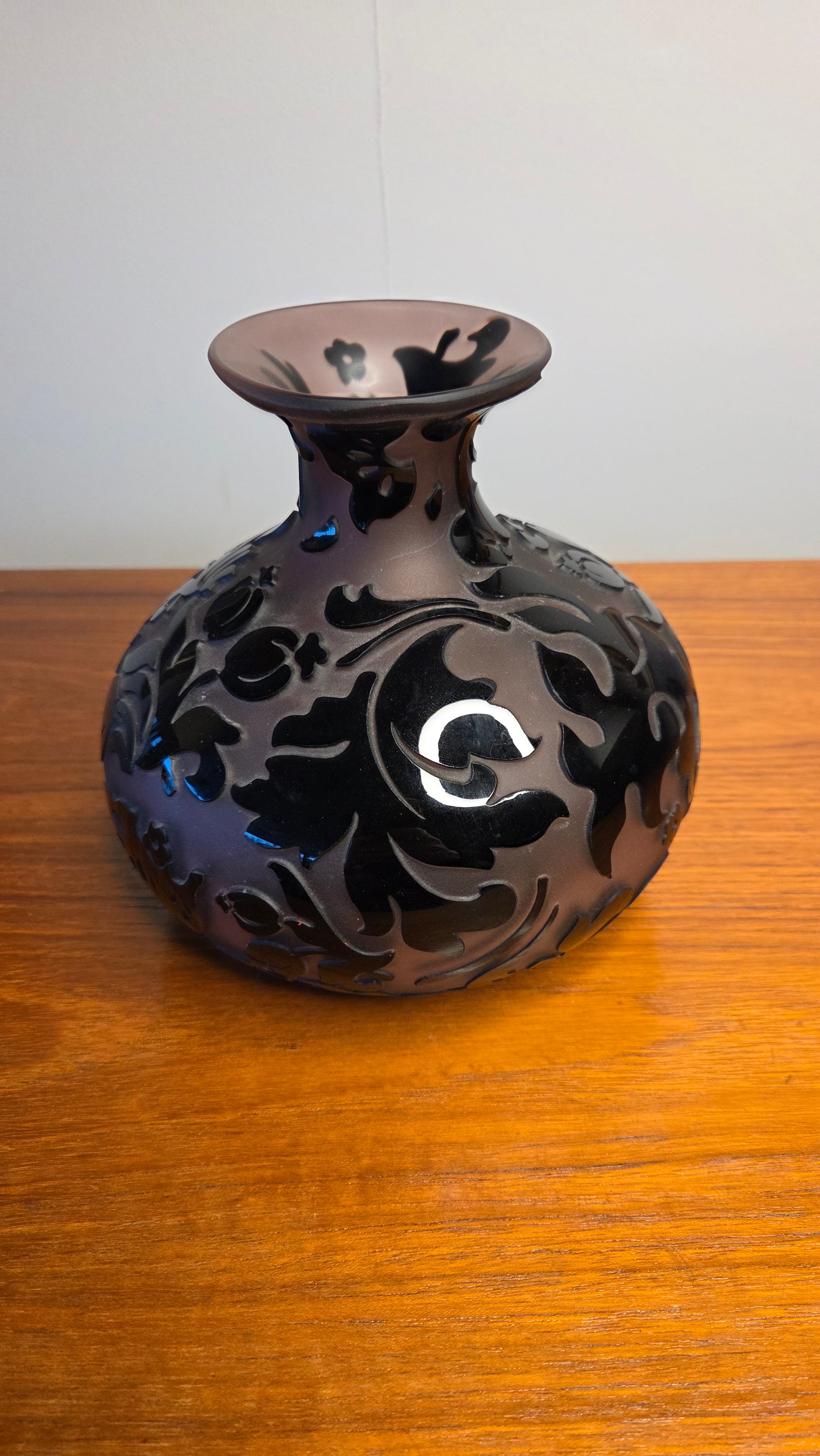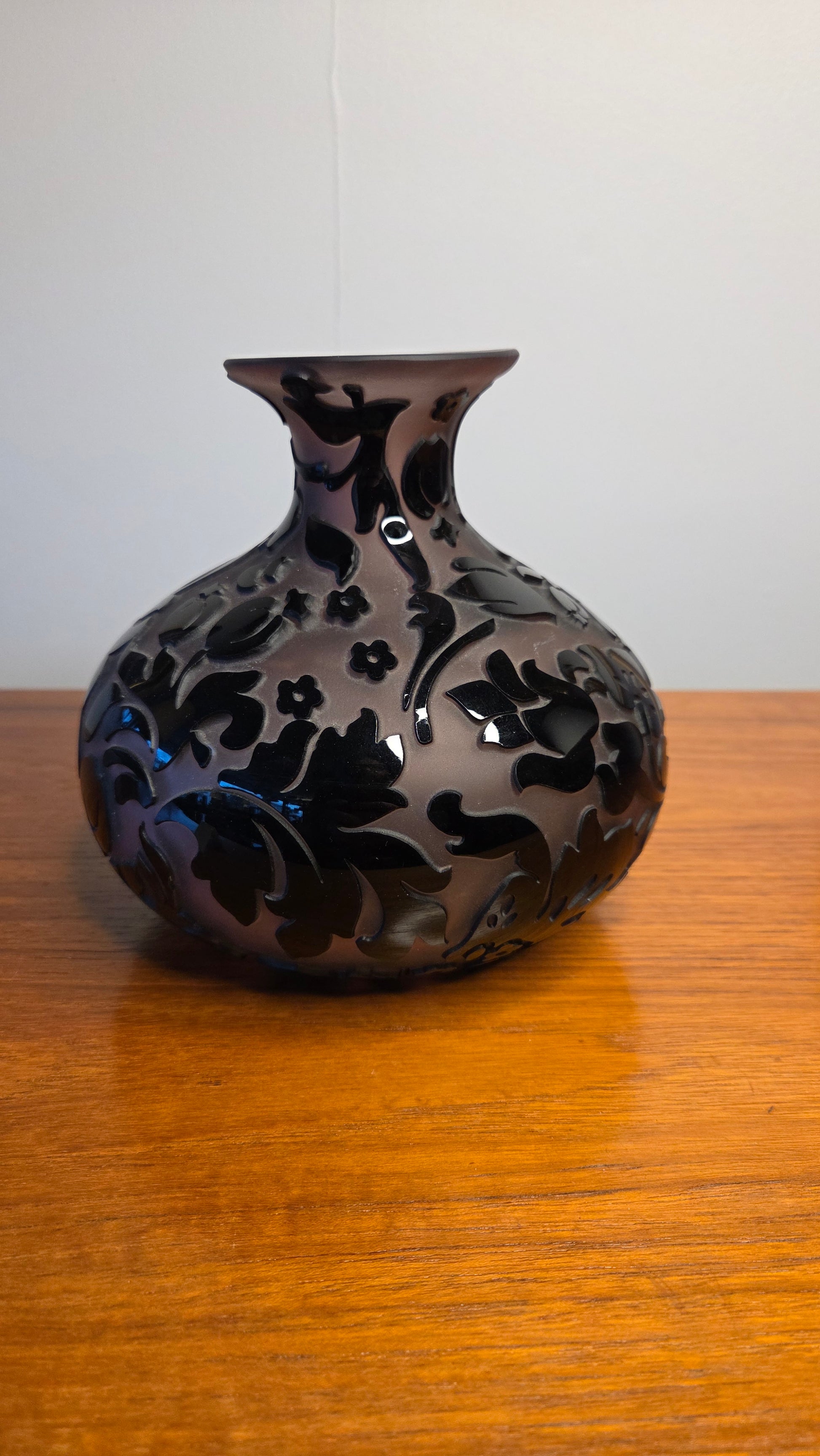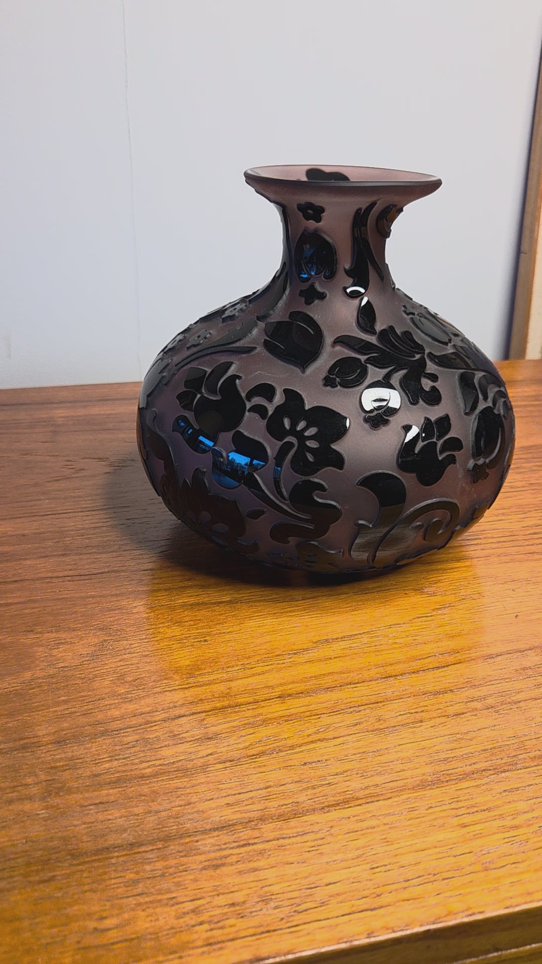 Tyylikäs ja painava cameo-lasitekniikalla valmistettu ametistinvärinen taidelasimaljakko tunnetulta amerikkalaiselta lasitaiteilijalta Michael Weemsiltä. Maljakossa kauniisti kerroksellinen lasi, jossa tumma pintakerros on kaiverrettu esiin koristeelliseksi kukka- ja lehtikuvioksi.