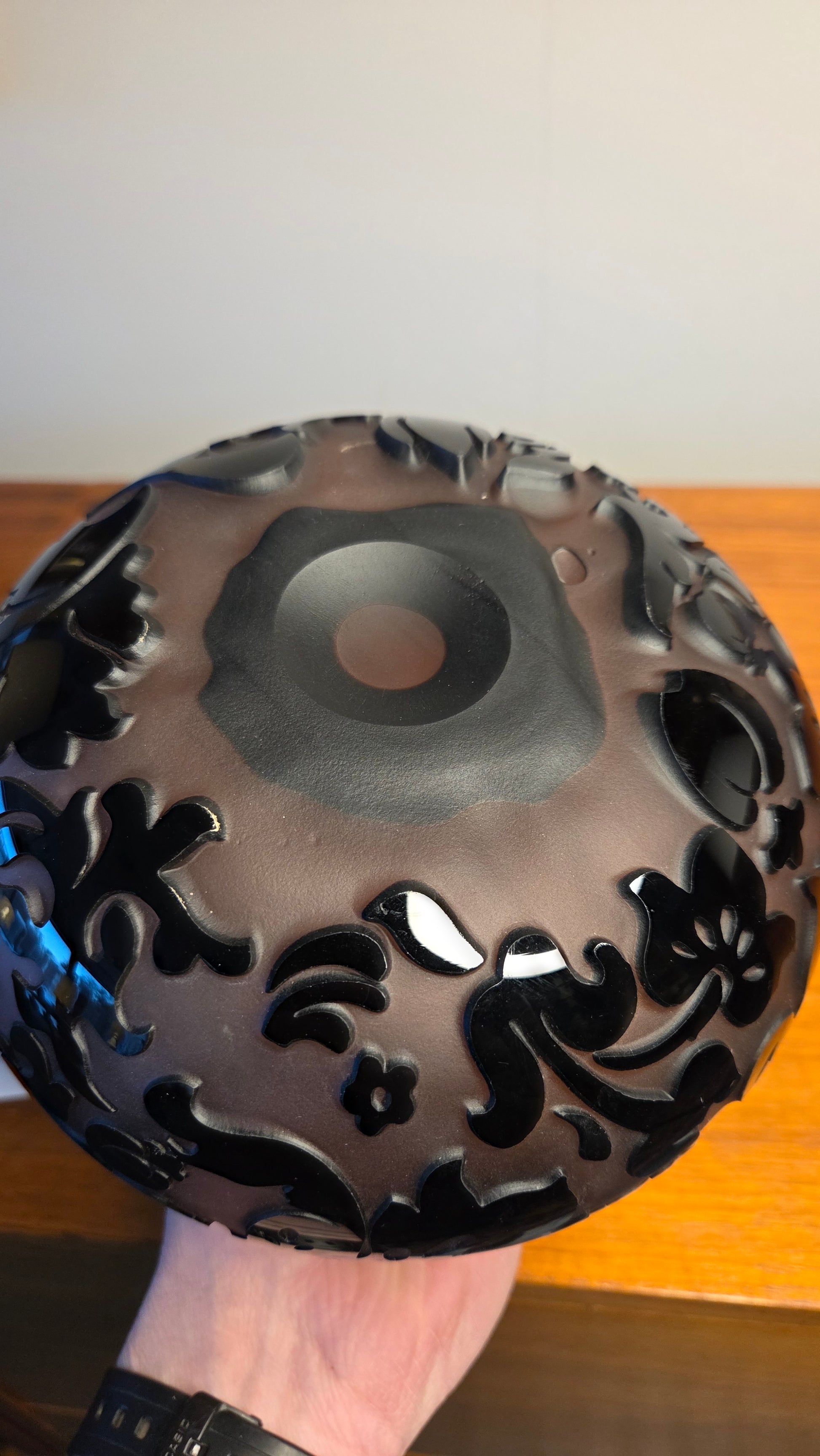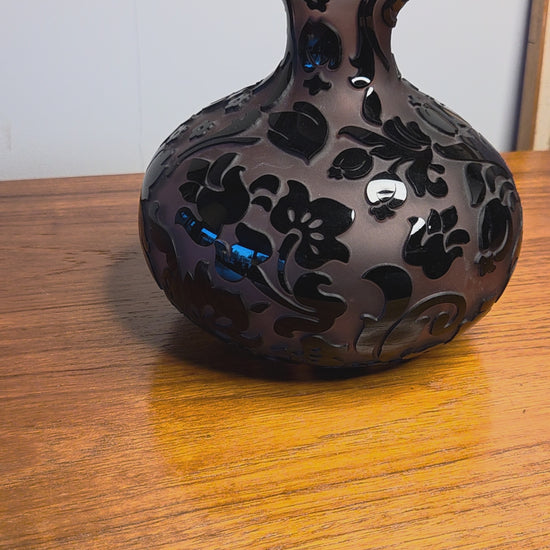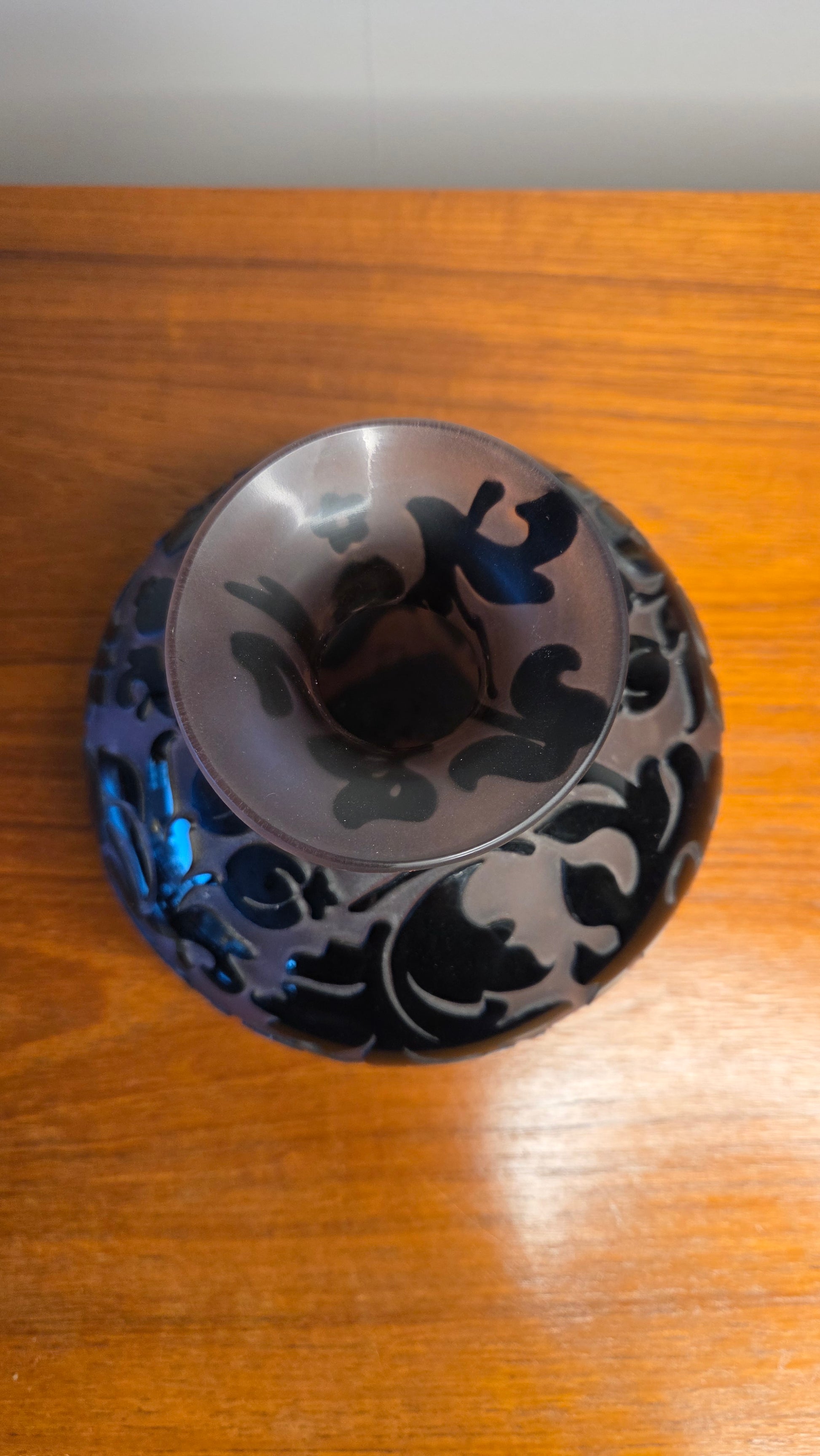 Tyylikäs ja painava cameo-lasitekniikalla valmistettu ametistinvärinen taidelasimaljakko tunnetulta amerikkalaiselta lasitaiteilijalta Michael Weemsiltä. Maljakossa kauniisti kerroksellinen lasi, jossa tumma pintakerros on kaiverrettu esiin koristeelliseksi kukka- ja lehtikuvioksi.