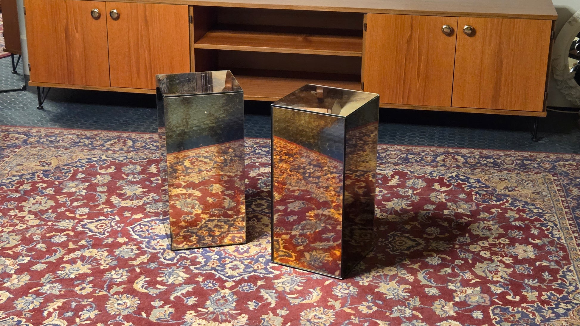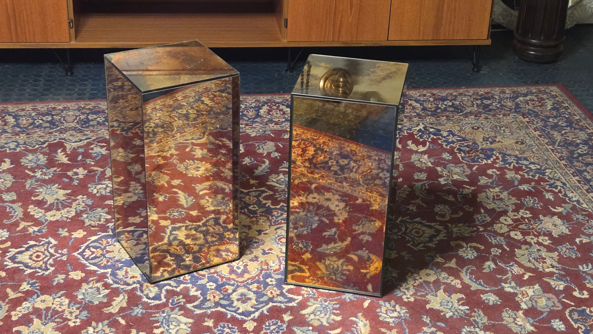 Näyttävä pari peililasista valmistettuja jalustoja.