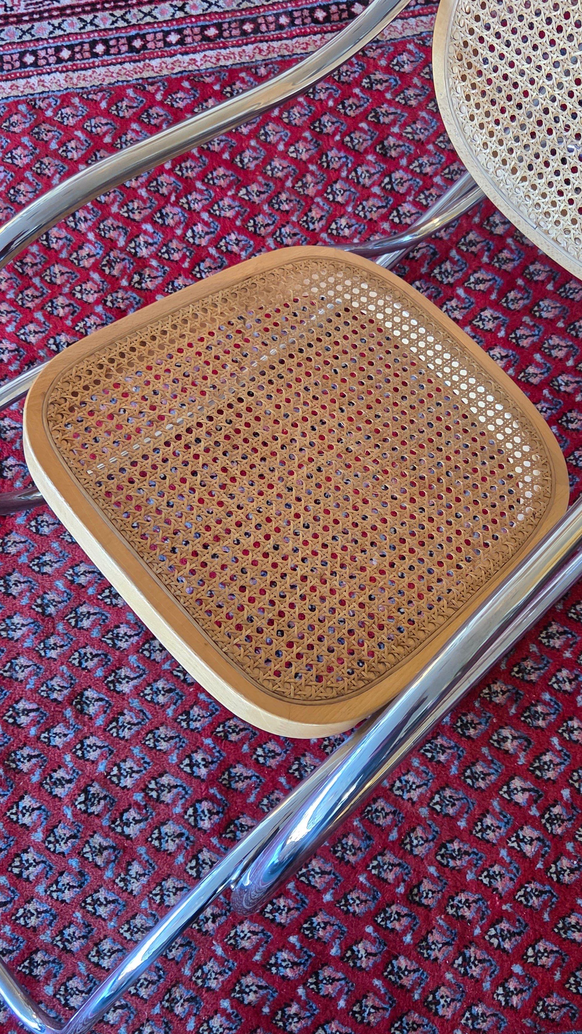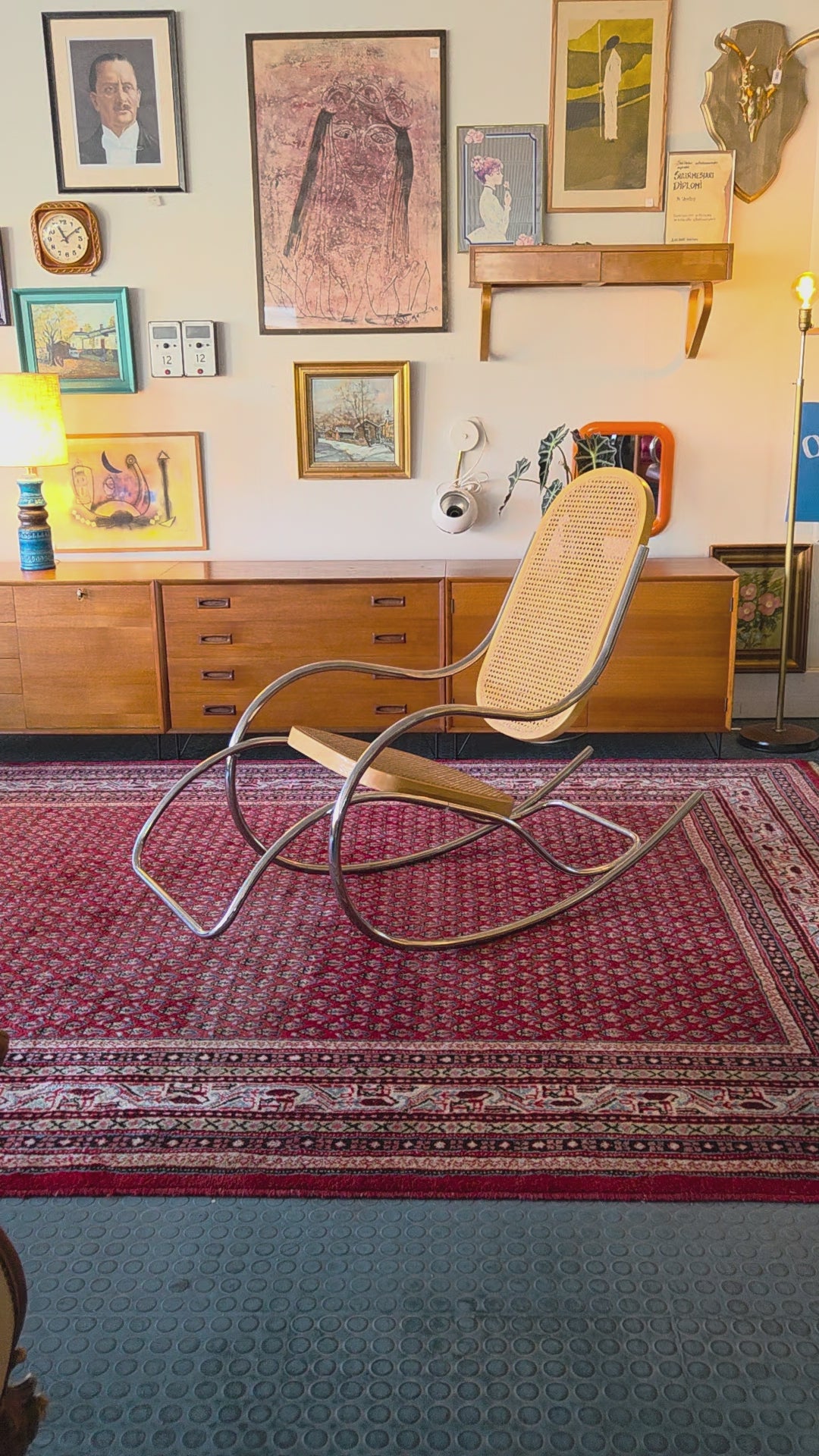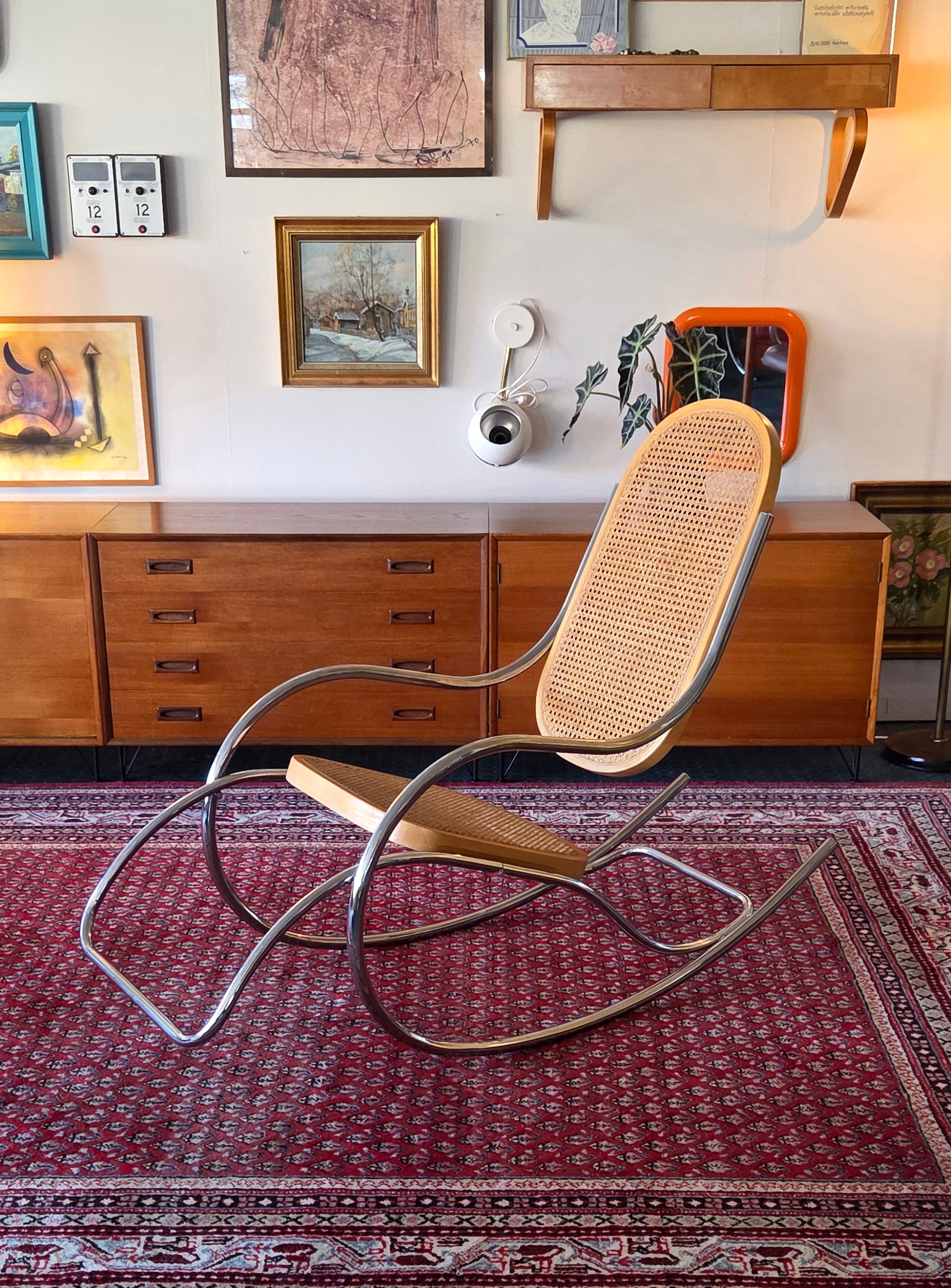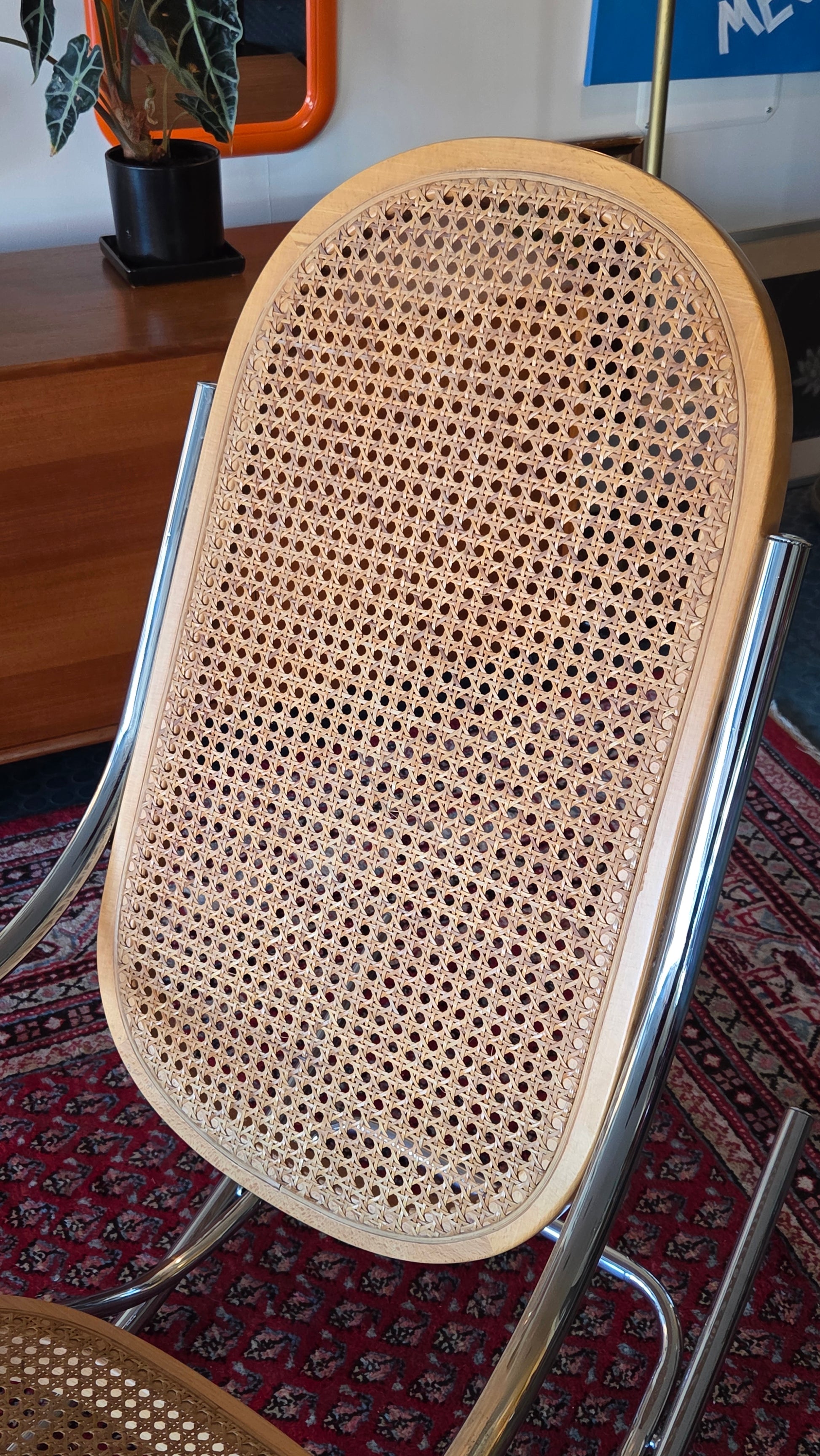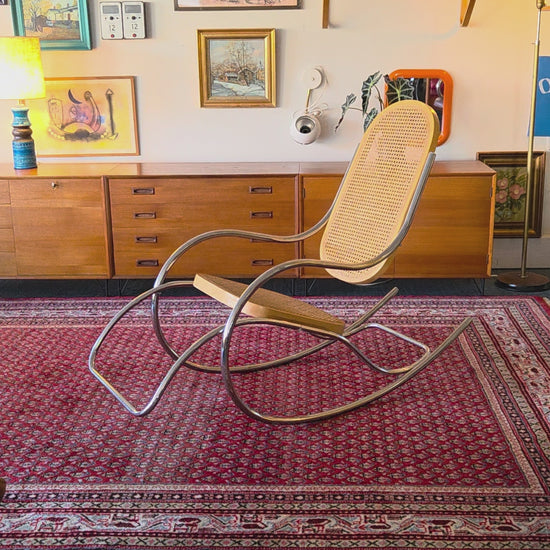 Tyylikäs ja harvinaisempi keinutuoli, jossa yhdistyvät ajaton design ja mukavuus. Tuolissa on kaunis kromattu teräsrunko sekä rottinkipunoksesta valmistettu istuin ja selkänoja. Ilmeisesti 70/80-luku, Italia