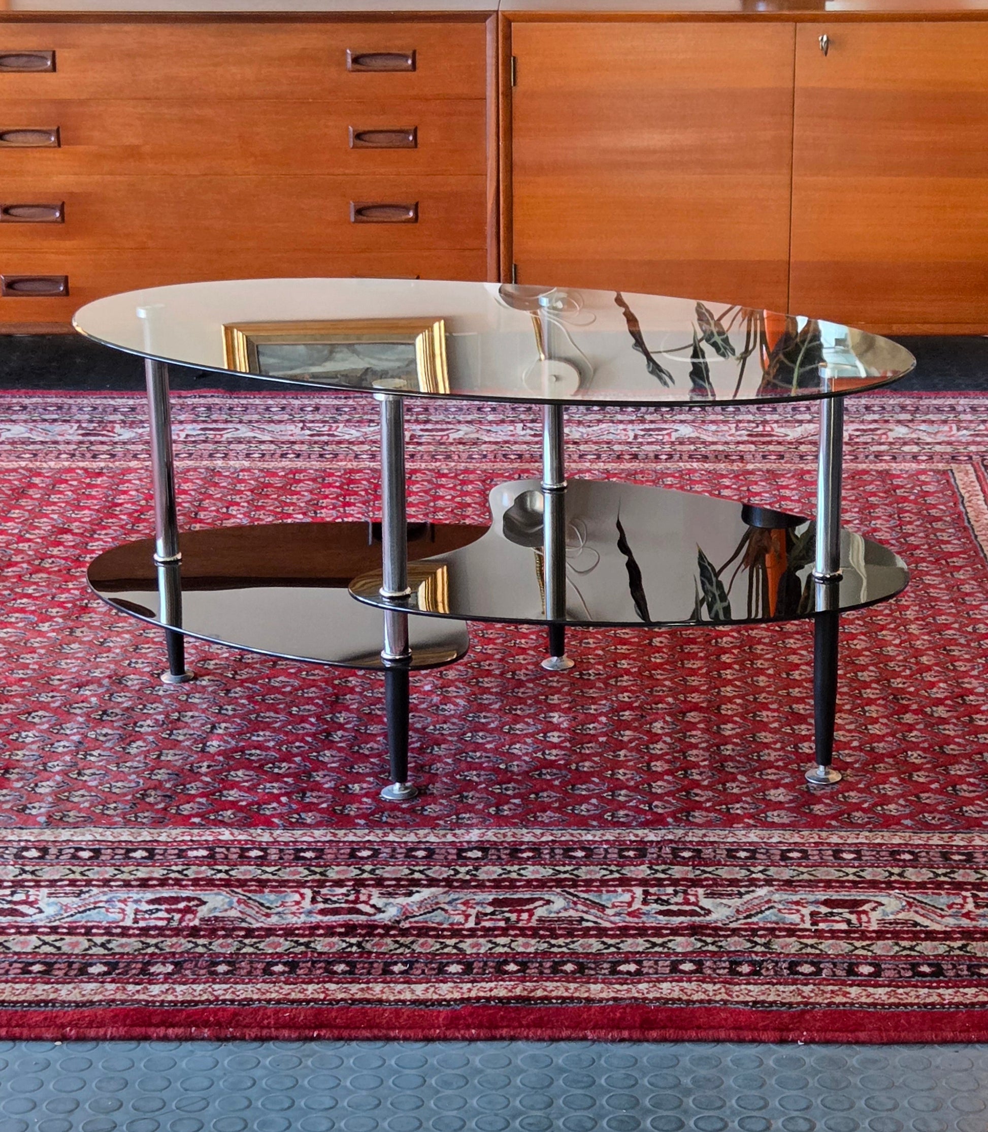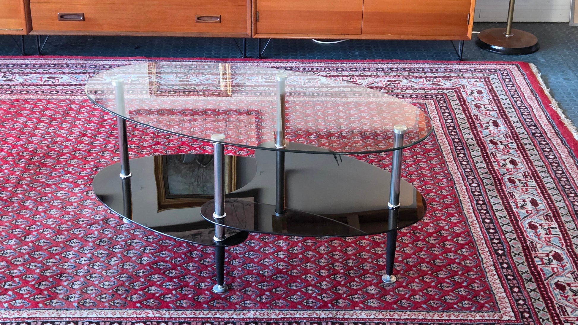 Moderni lasipöytä, jossa on kolme eritasoista lasitasoa ja kromatut metallijalat.
