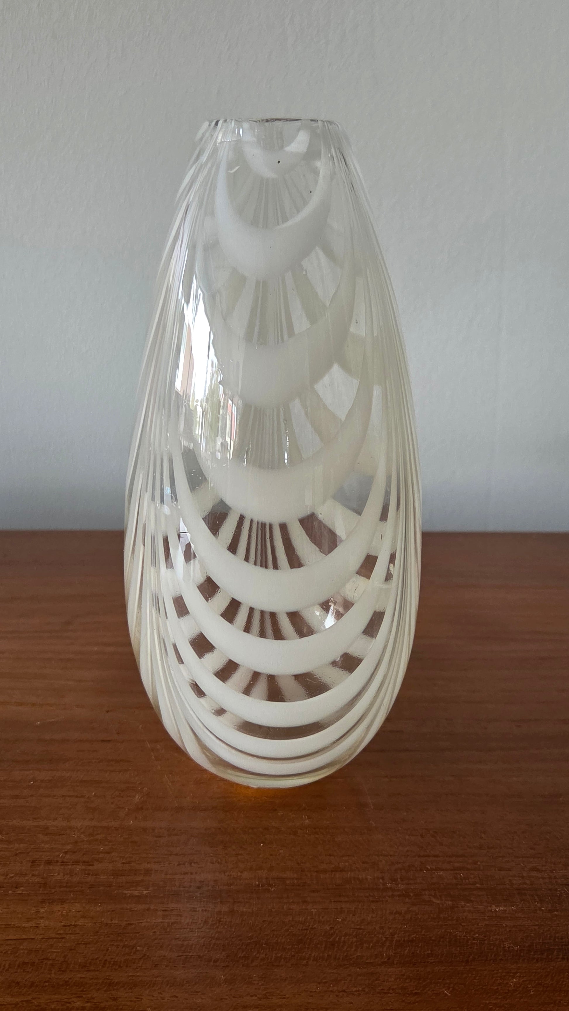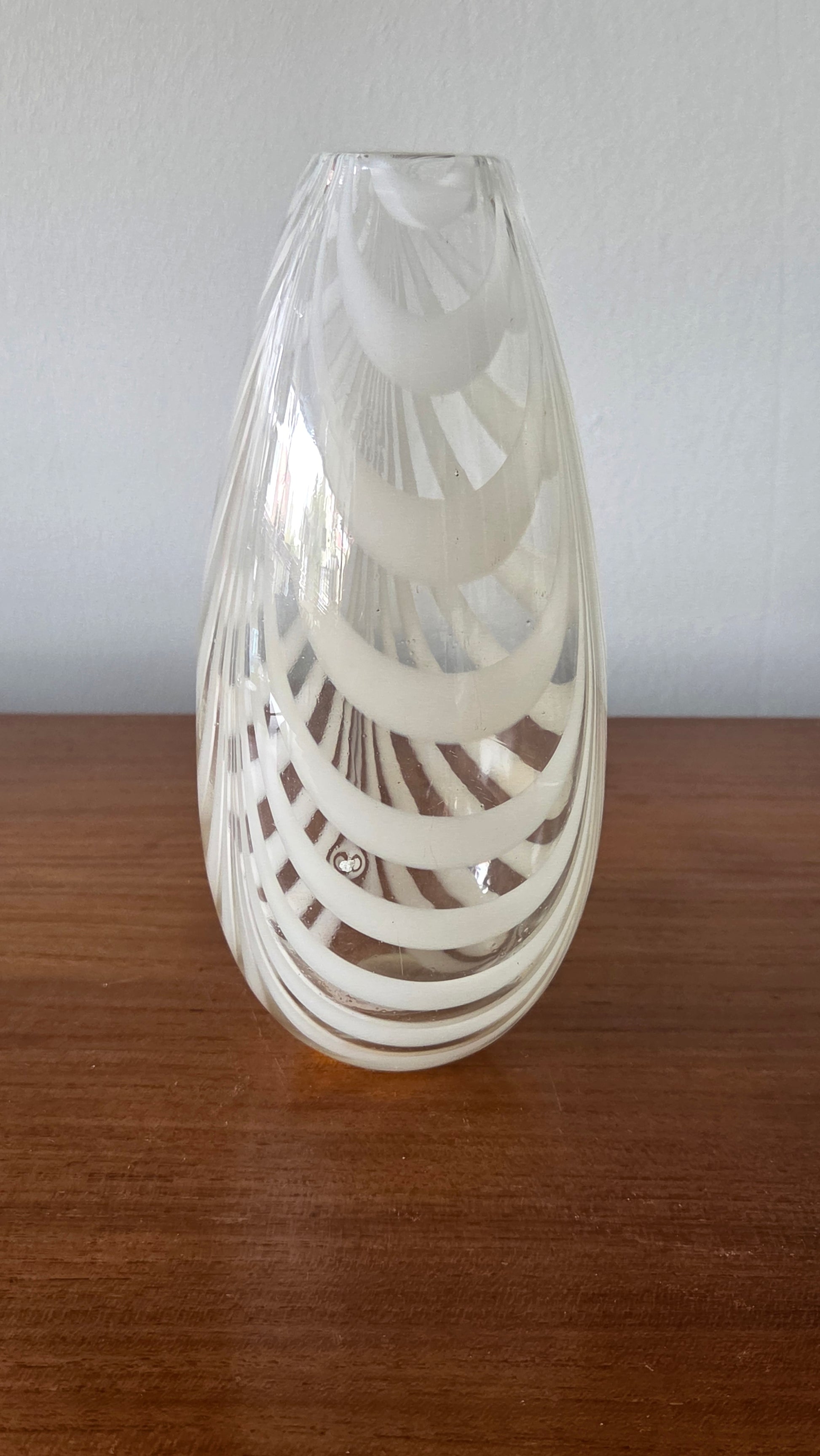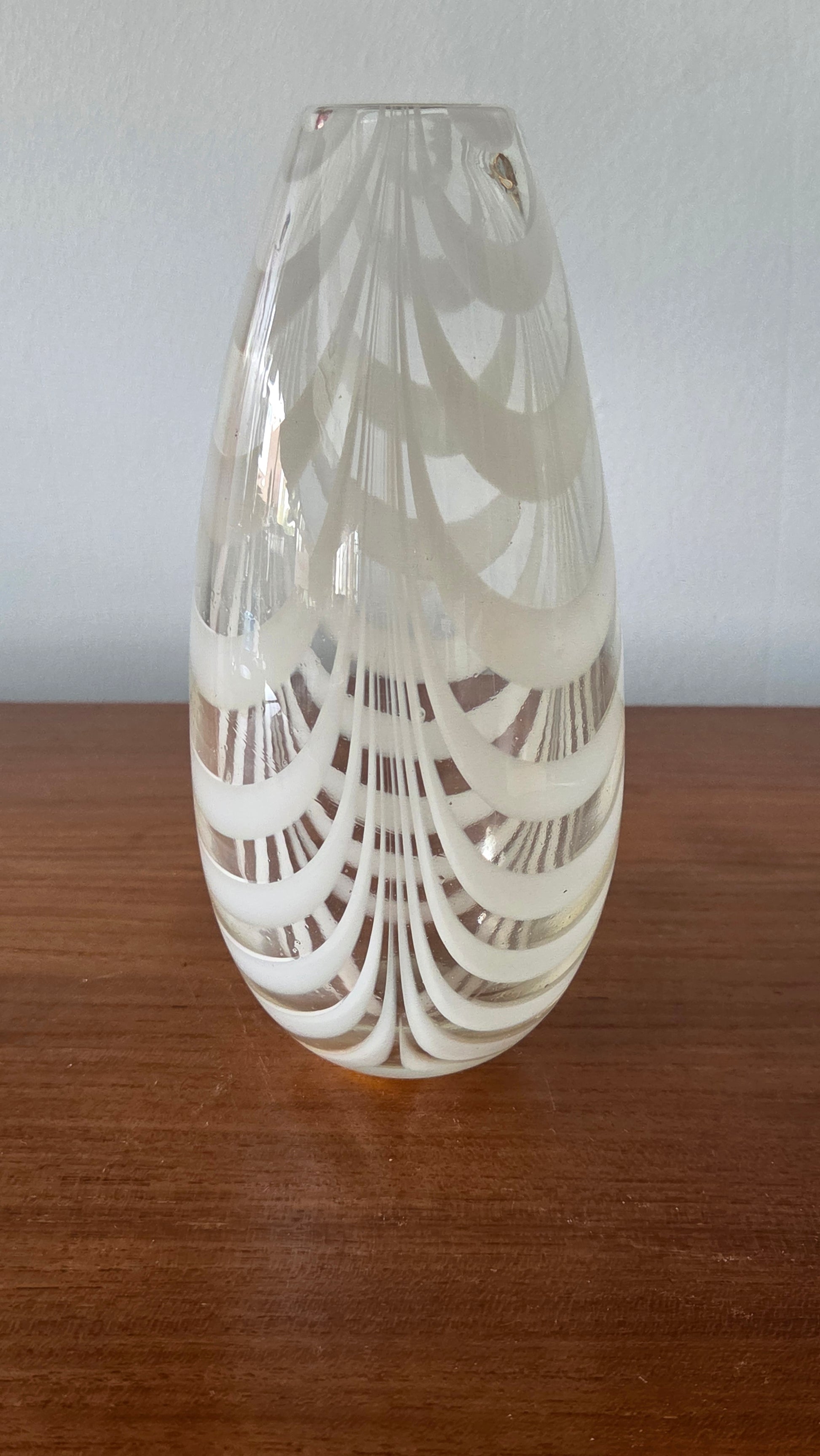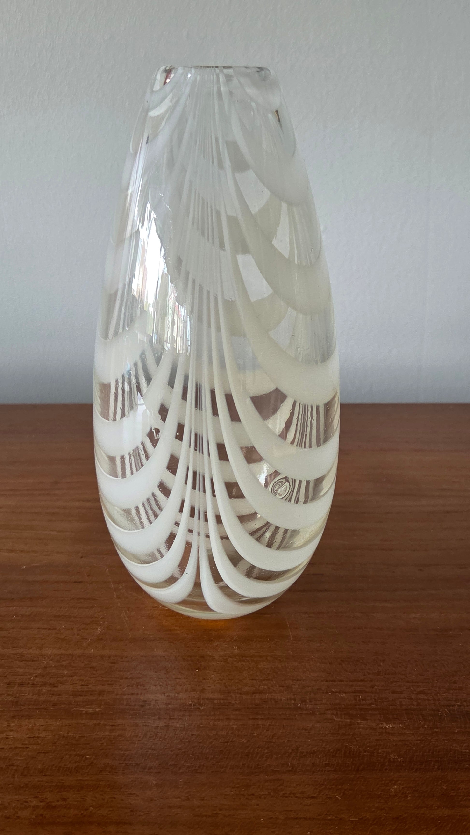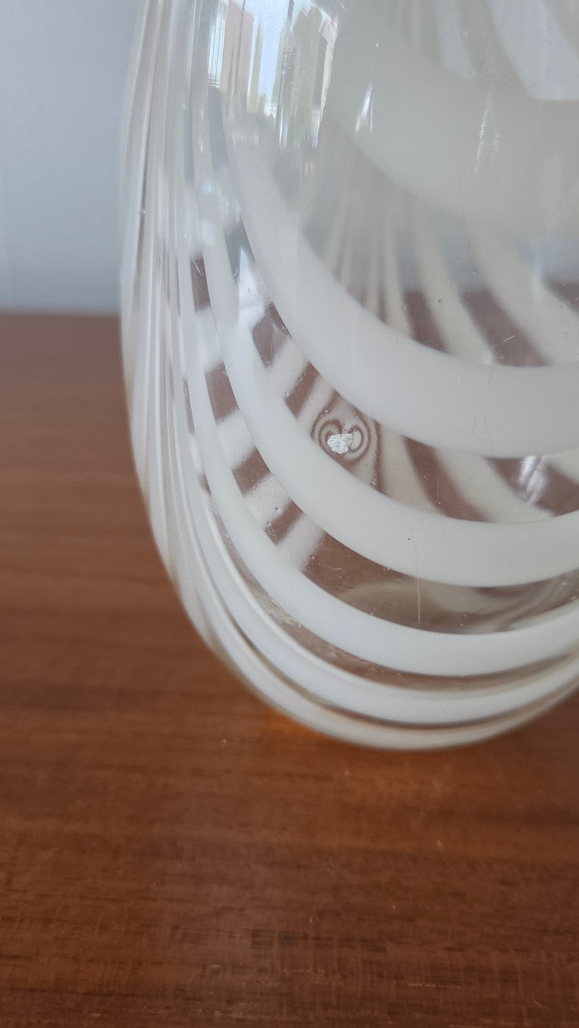 Materiaali: kirkas lasi, valkoinen serpentiinikuviointi