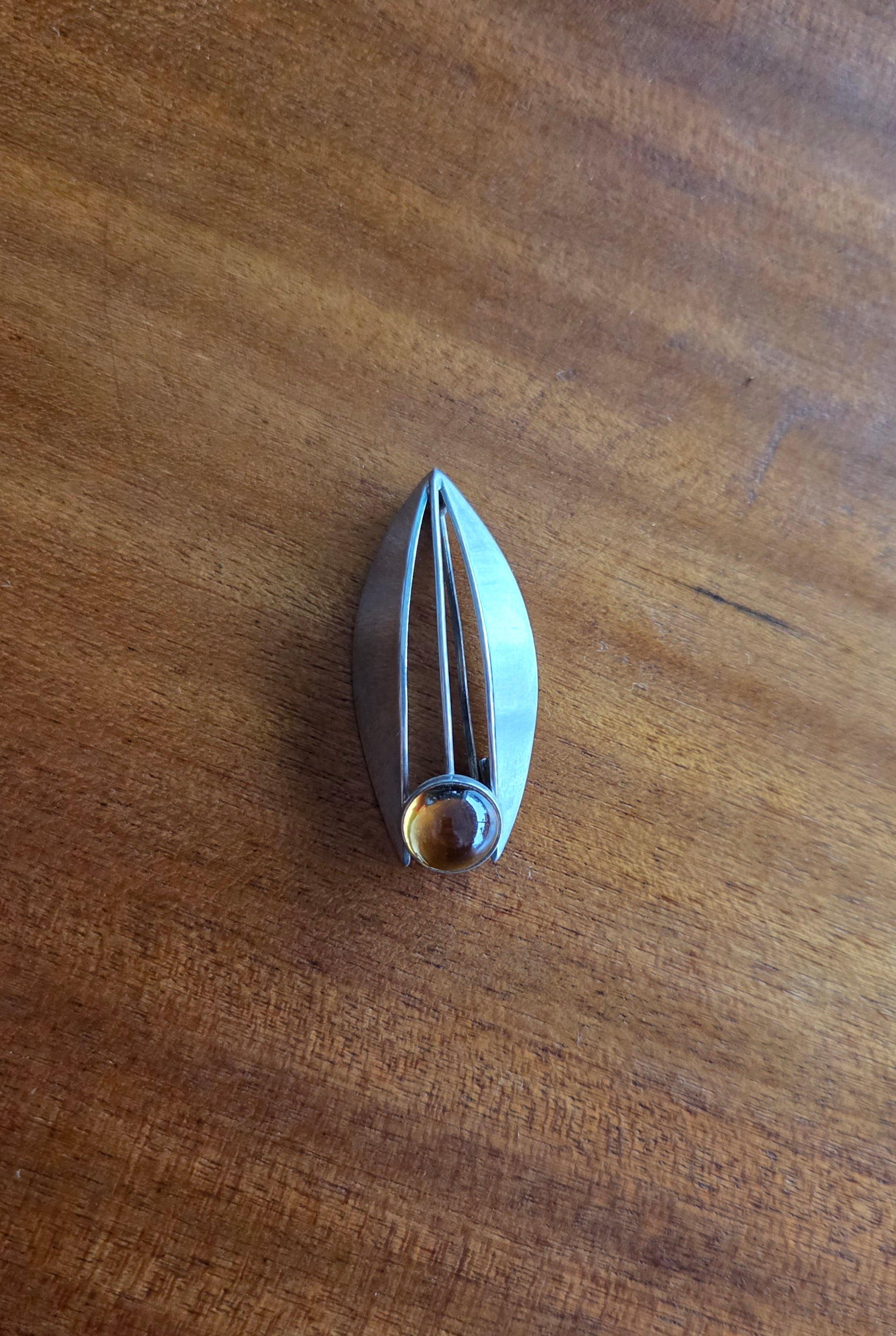 Korussa on kauniin modernistinen muotokieli – selkeä, veistoksellinen linjaus ja lämminsävyinen keltainen kivi luovat upean kontrastin kiillotettuun hopeapintaan.
