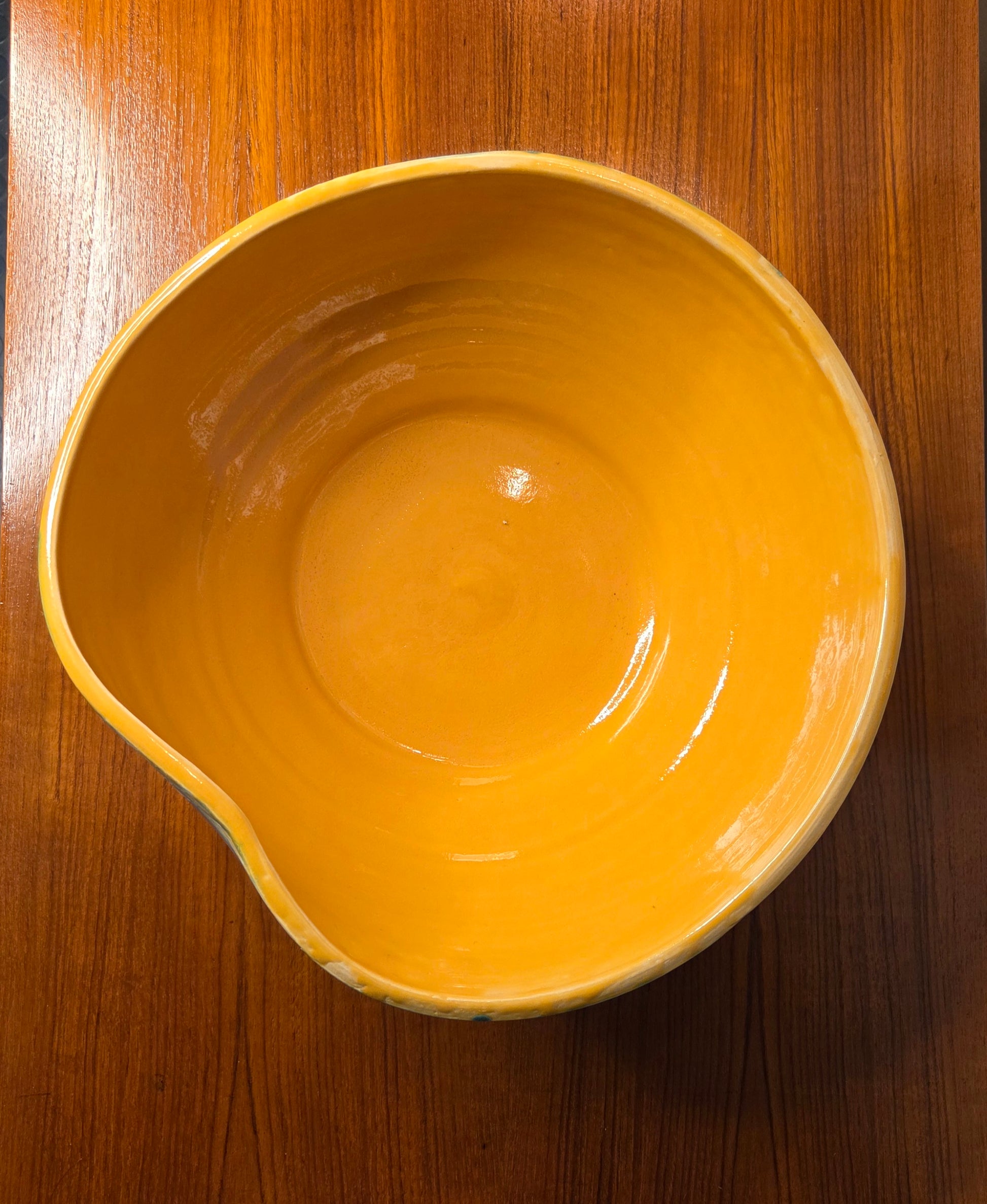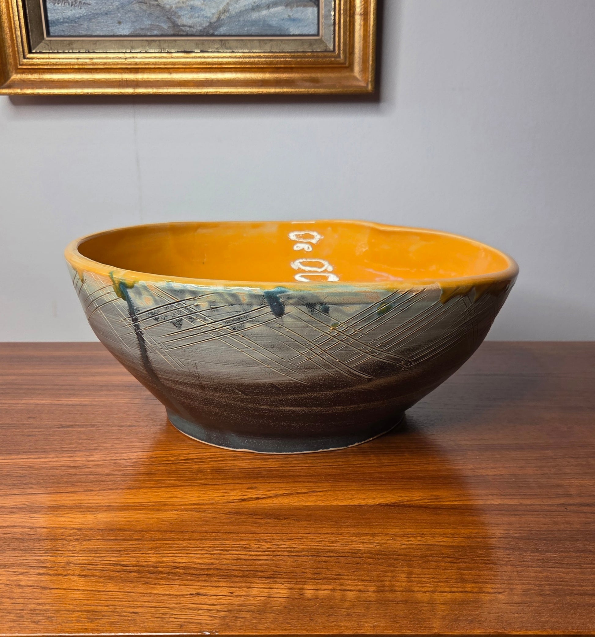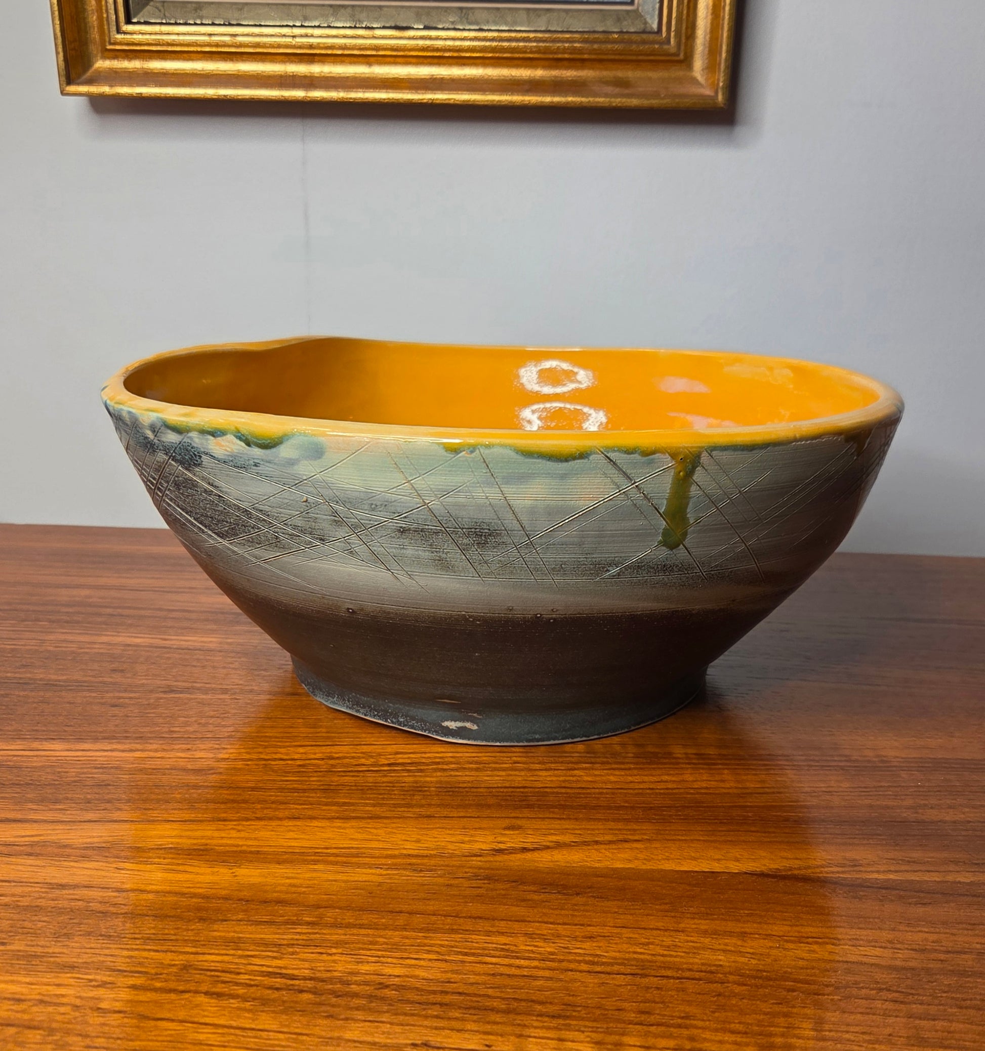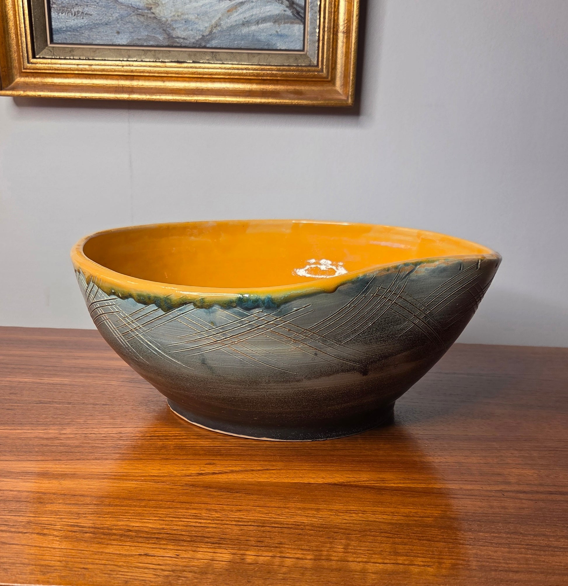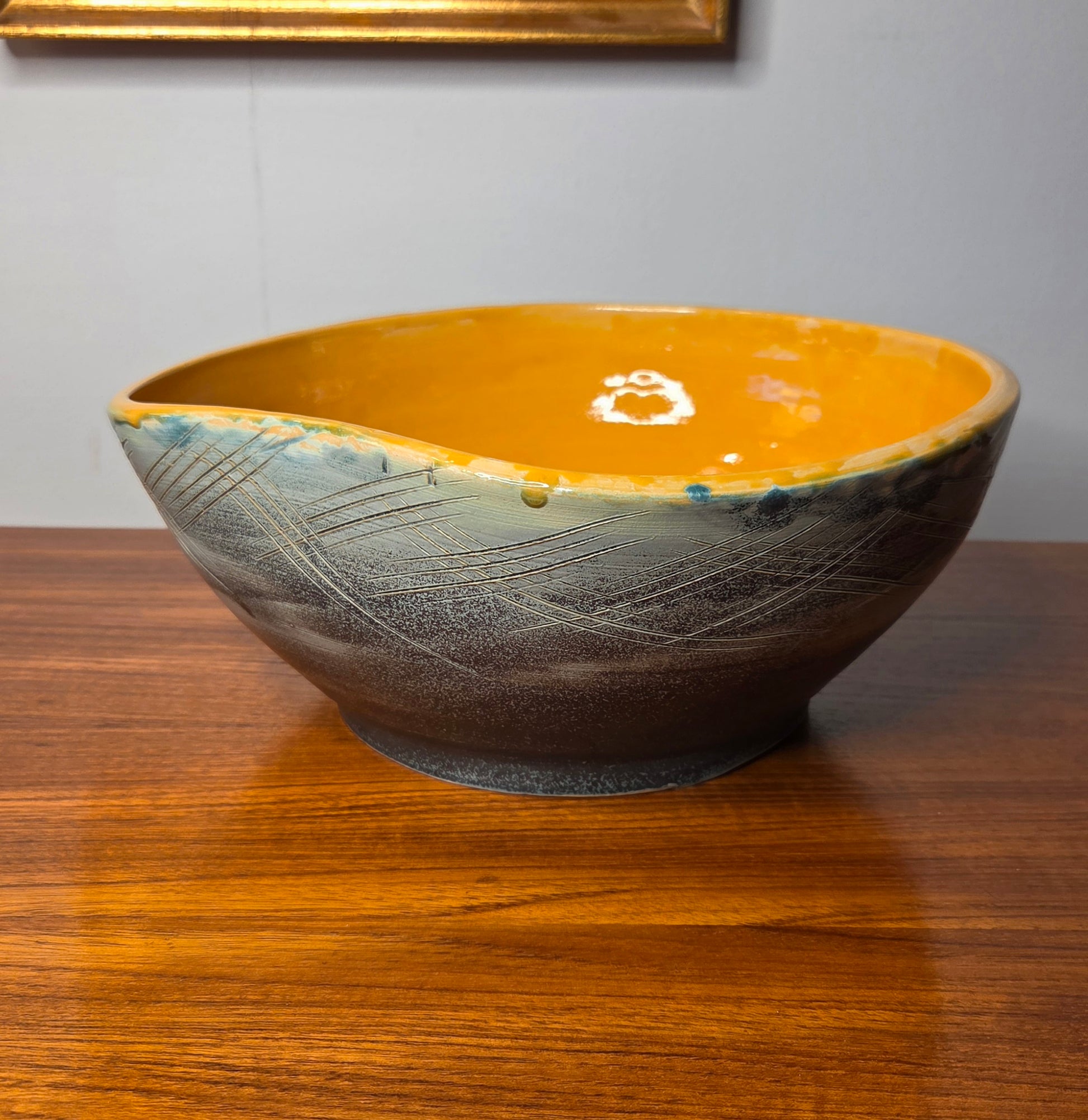 Näyttävä ja persoonallinen keramiikkakulho. Kulhossa on kaunis keltainen lasitus sisäpinnalla ja ulkopinnassa hillitty vihertävänharmaa sävy sekä kaiverrettu, graafinen kuviointi. Epäsymmetrinen muoto tuo kulholle modernia ja taiteellista ilmettä.