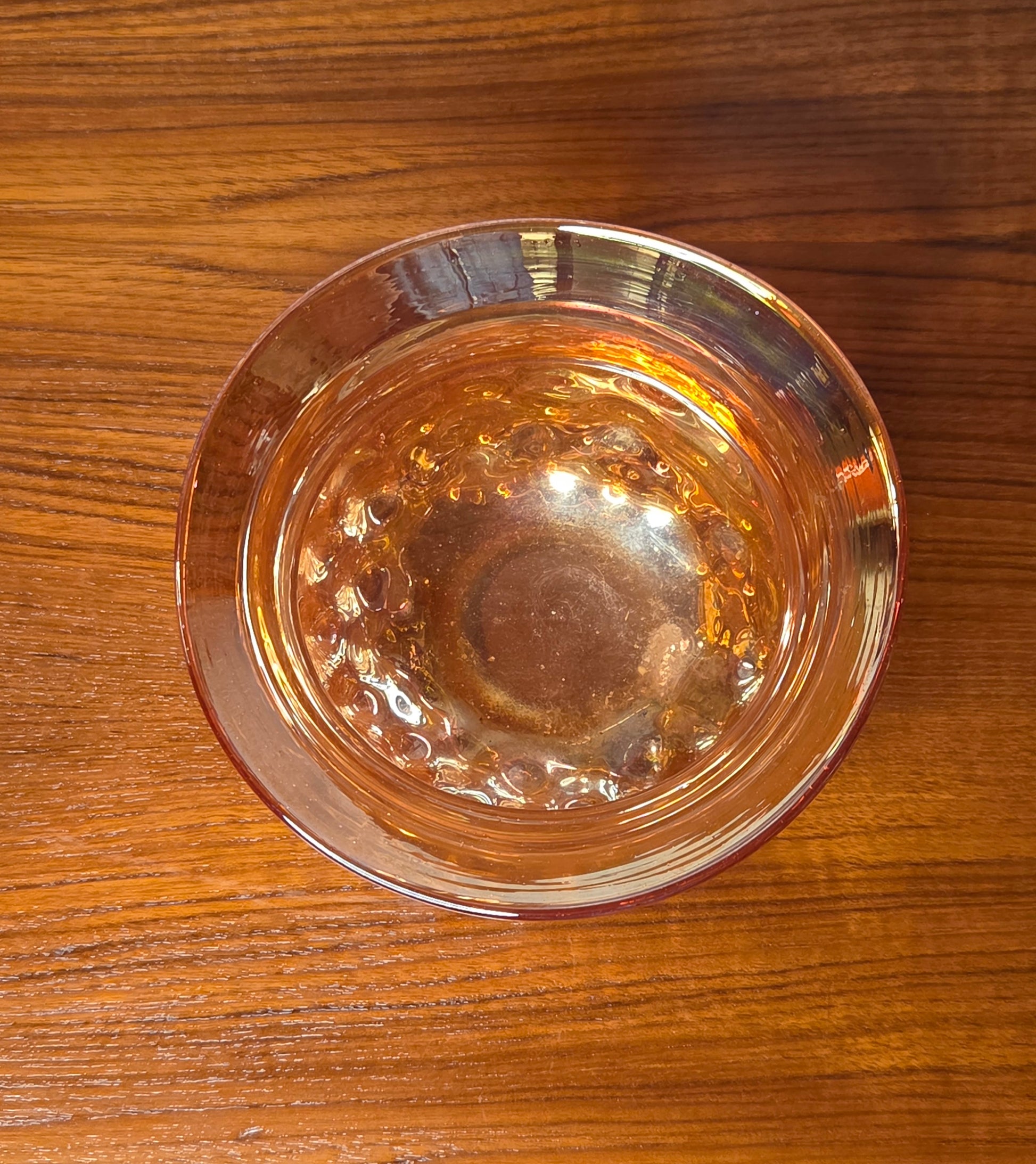 Kaunis meripihkan sävyinen vintage-lysterilasimalja, jossa näyttävä kuplamainen pinta ja lämmin metallinen hohde. Ajaton esine, joka toimii hienosti esimerkiksi tuikkukippona, tarjoilukulhona tai pienenä kukka-asetelmana.