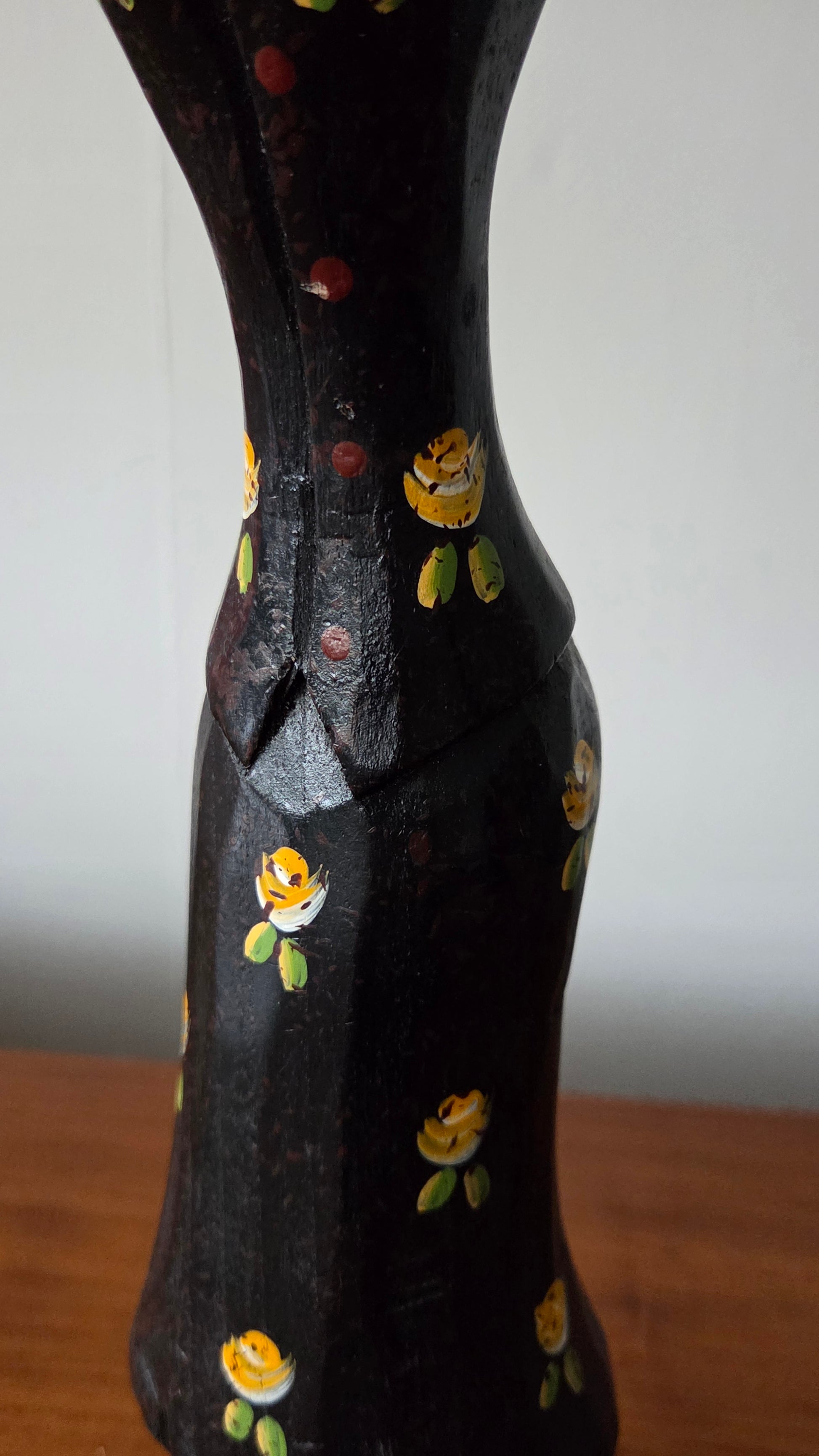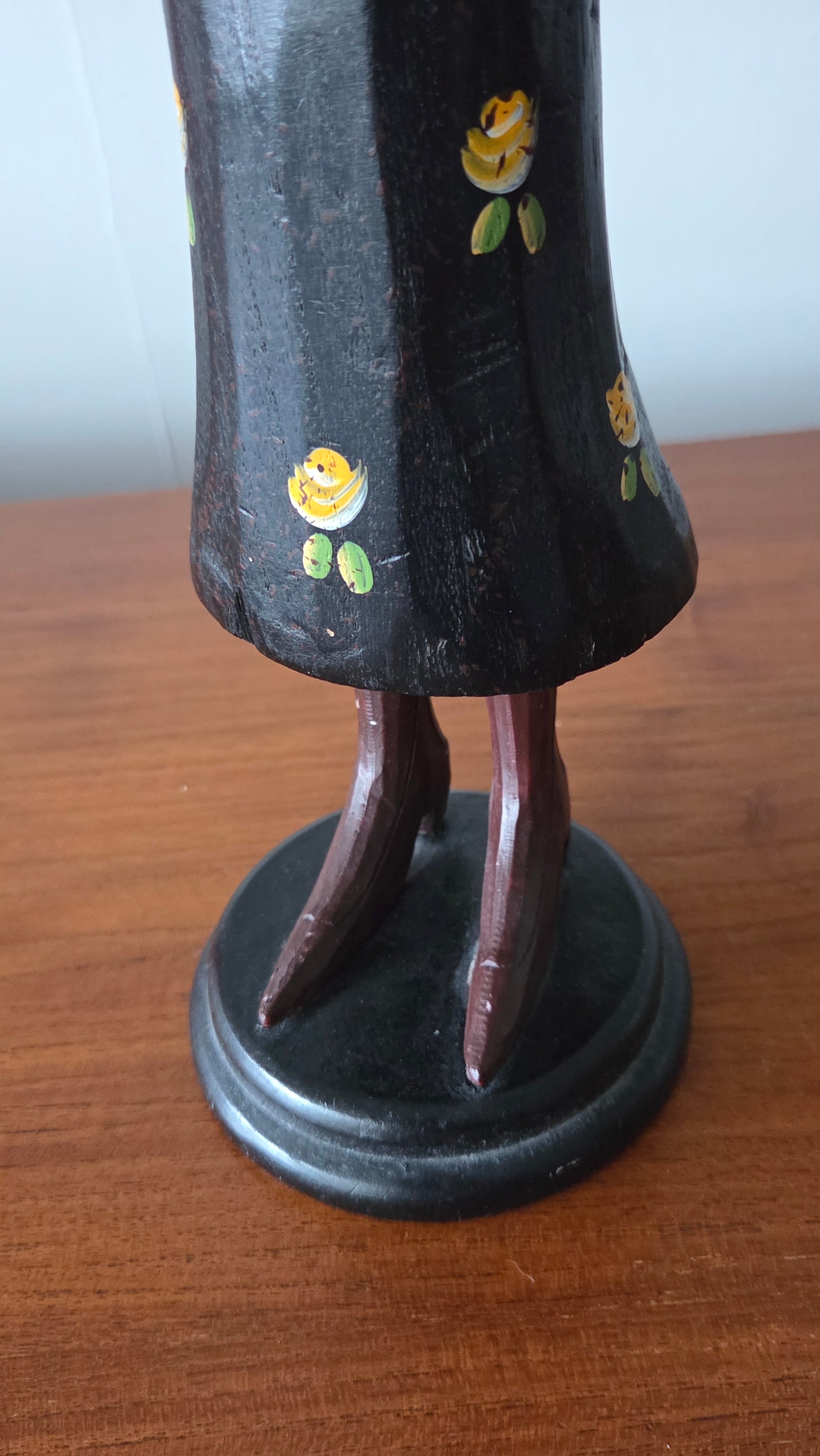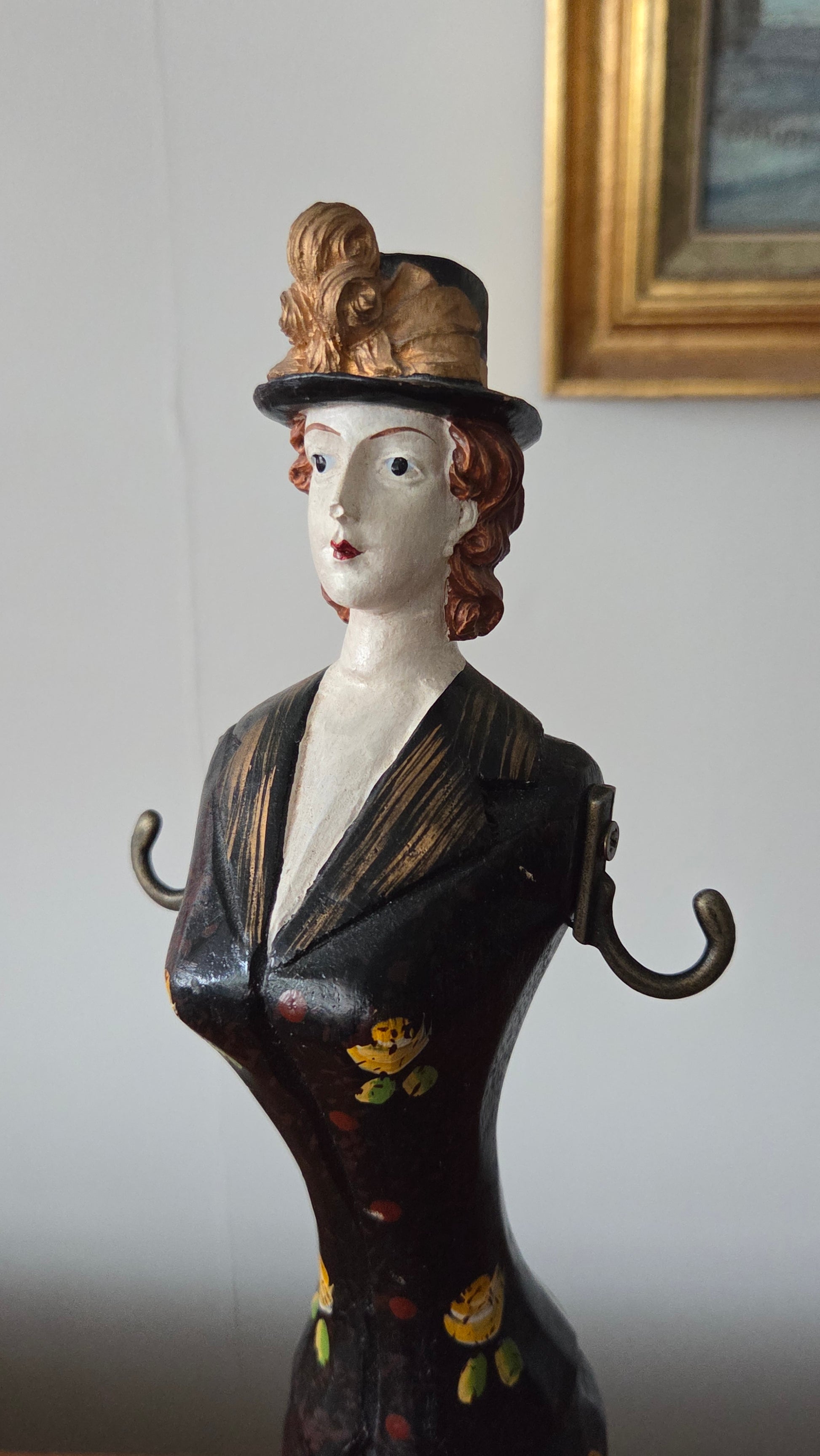 Kaunis koriste-esine, jossa elegantti naishahmo pitkällä mekolla ja hatulla. Olkapäillä koukut, jotka sopivat esimerkiksi korujen ripustamiseen. Mustassa mekossa on käsinmaalatut keltaiset kukkakuviot.
