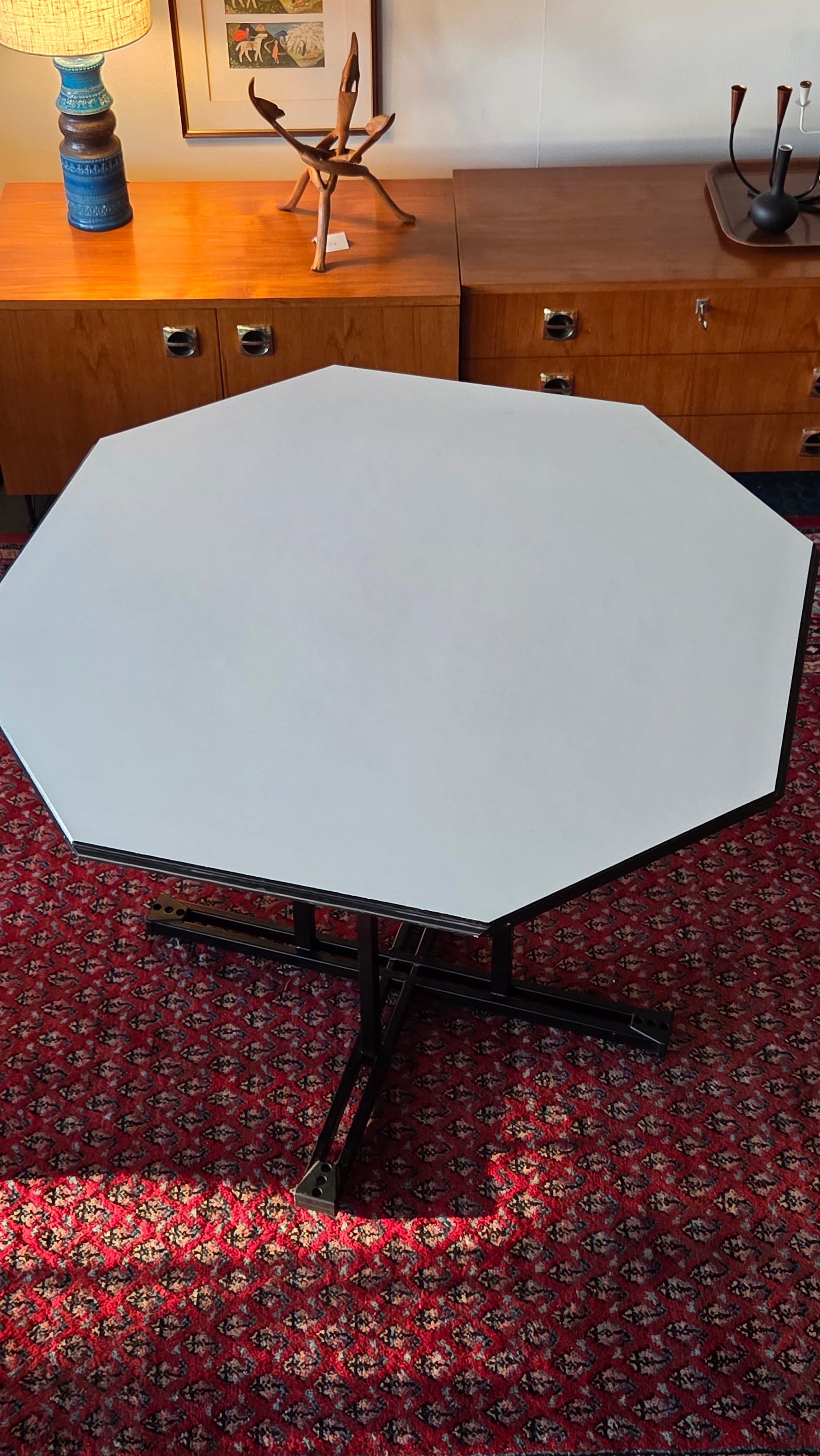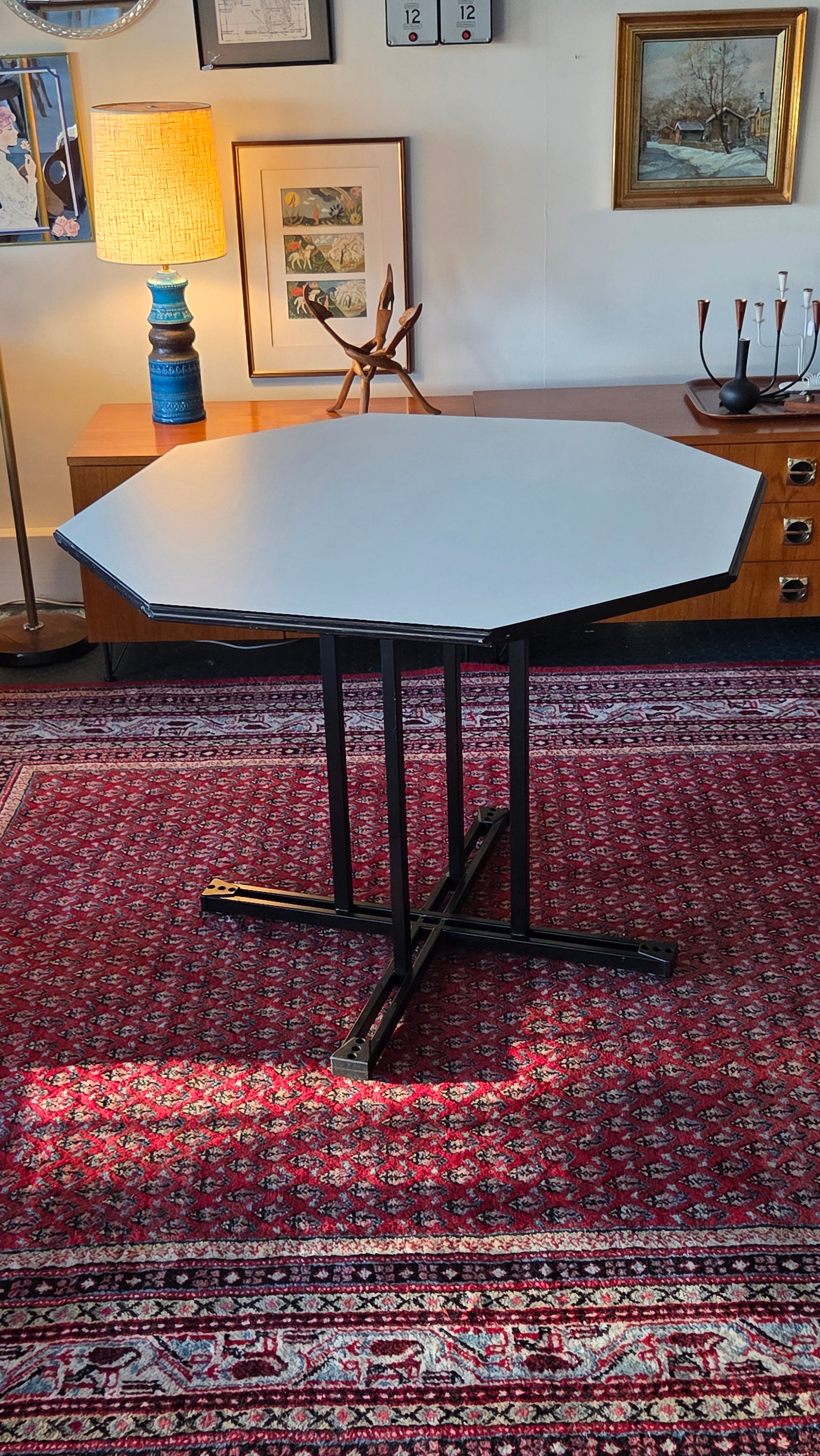 Pöydässä on kahdeksankulmainen laminaattikansi, musta metallijalka.